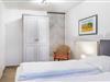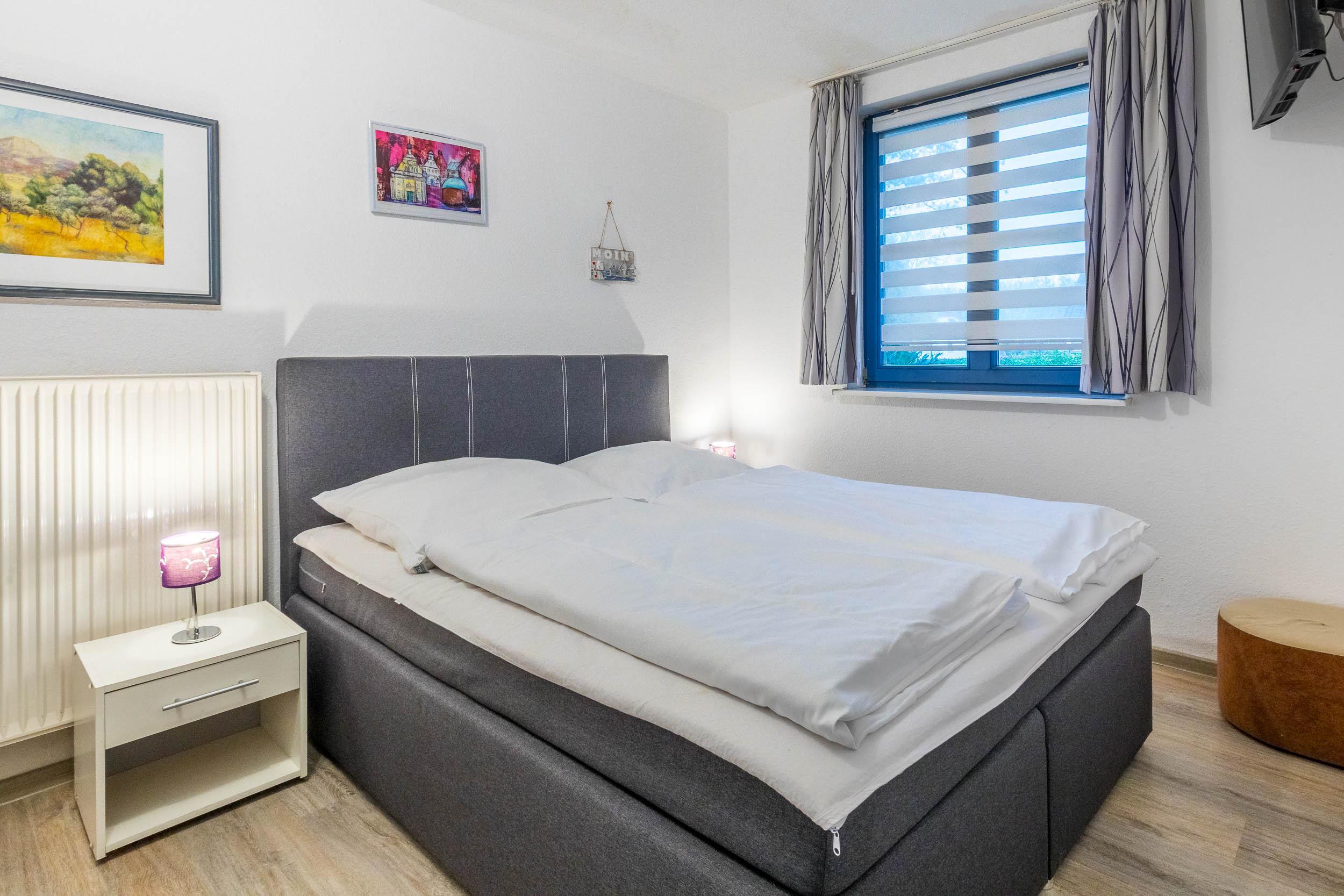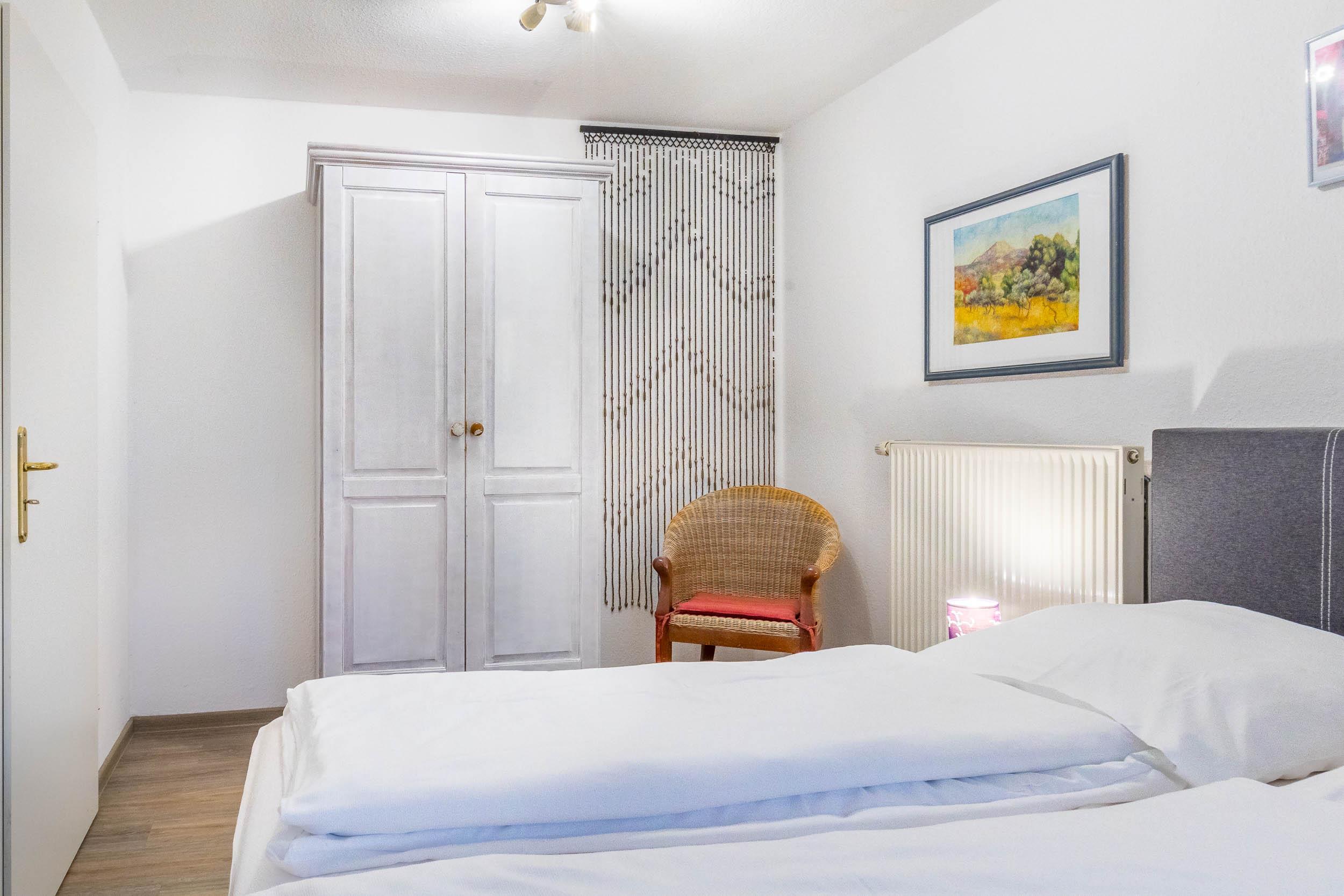 Das Schlafzimmer bietet ein Doppelbett, einen zweiten TV und einen passenden Kleiderschrank.