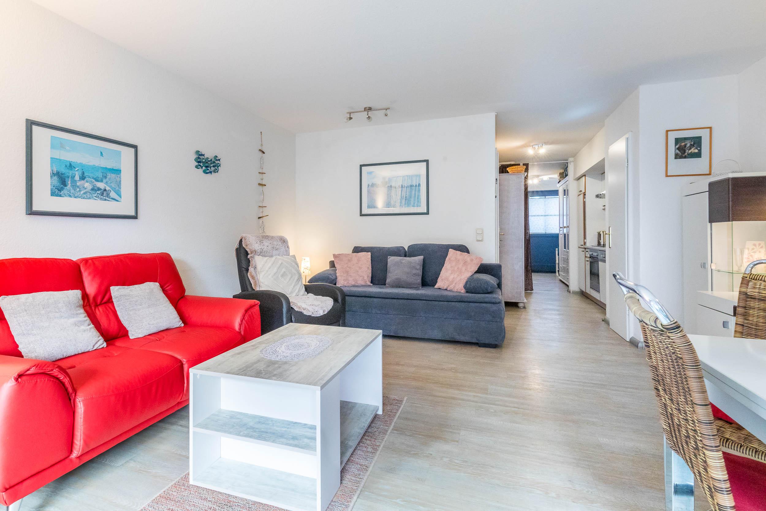 Die behaglich möblierte Ferienwohnung verfügt über einen verbundenen Wohn- und Essbereich mit integrierter Küchenzeile. Der Wohnbereich mit seinen zwei bequemen Sofas, wovon eines ein hochwertiges Boxspring-Schlafsofa (80x200m) ist, hell und gemütlich möbliert. Für Ihre Multimediaunterhaltung sorgen ein SAT-TV, DVD-Player und eine kleine Musikanlage.