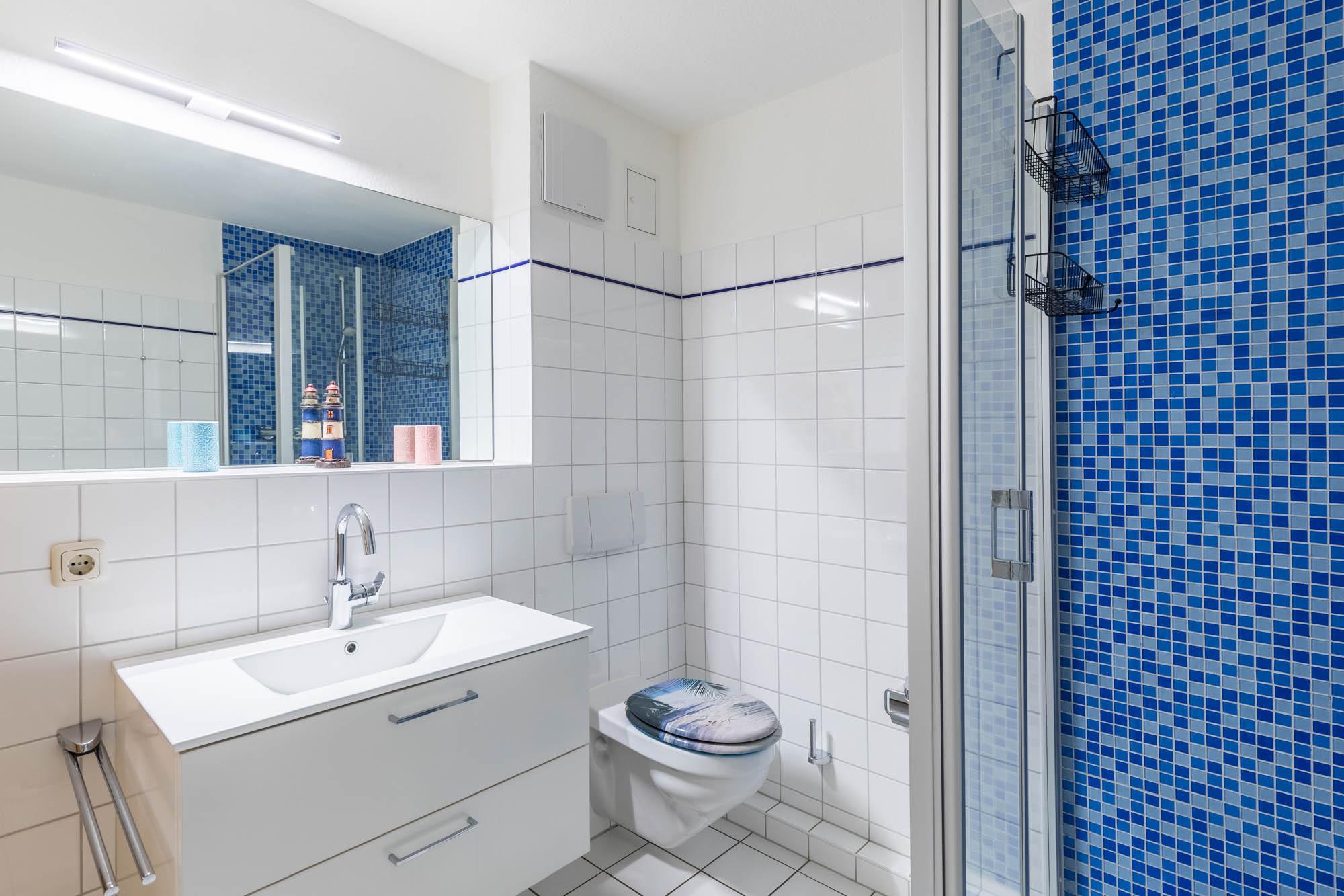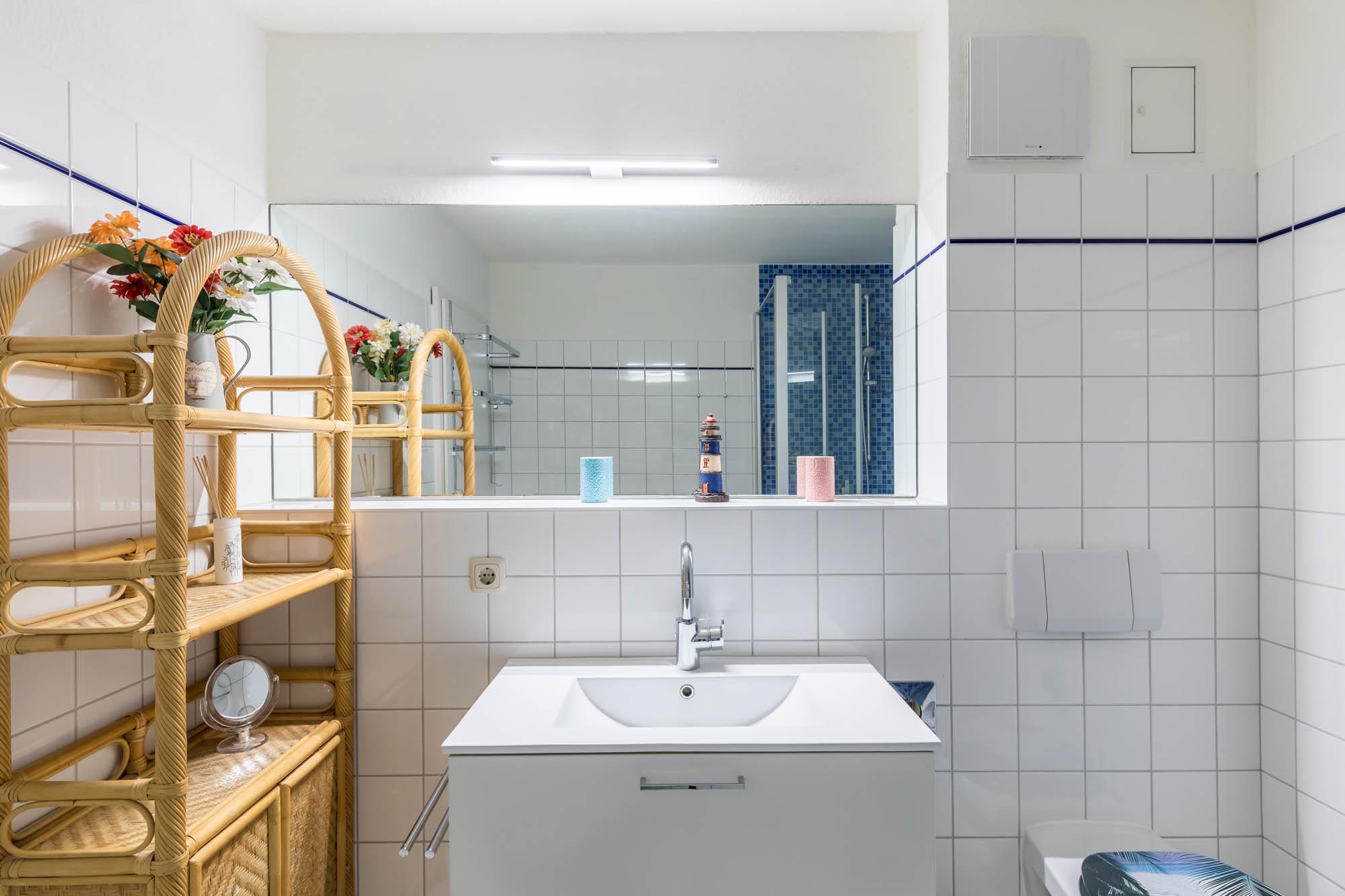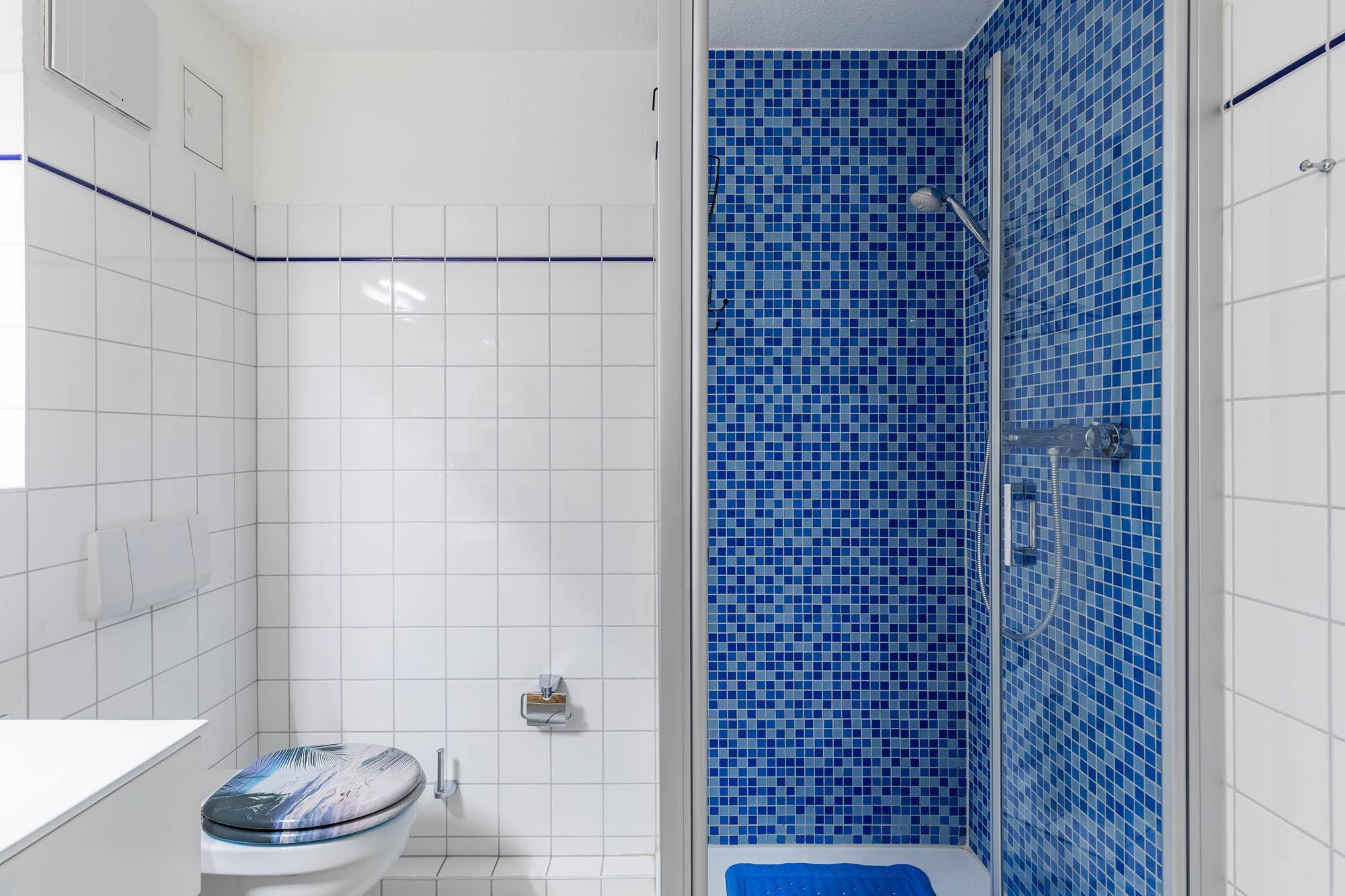 Starten Sie den Tag im hellen, gefliesten Duschbad mit Dusche und WC.