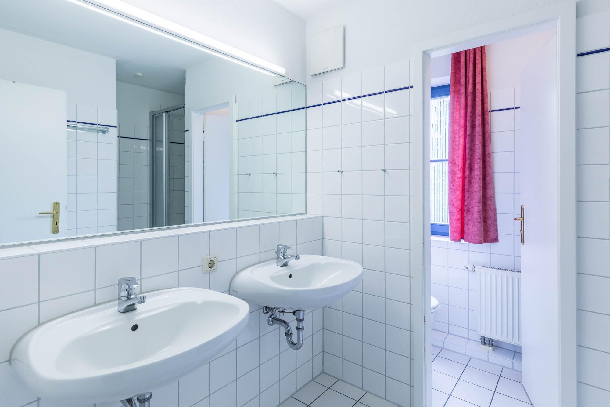 Wie die gesamte Wohnung, so bietet auch das moderne Duschbad hohen Komfort: Zwei Waschtische, Dusche und separates WC, sind ein weiterer Pluspunkt dieser Ferienwohnung.
