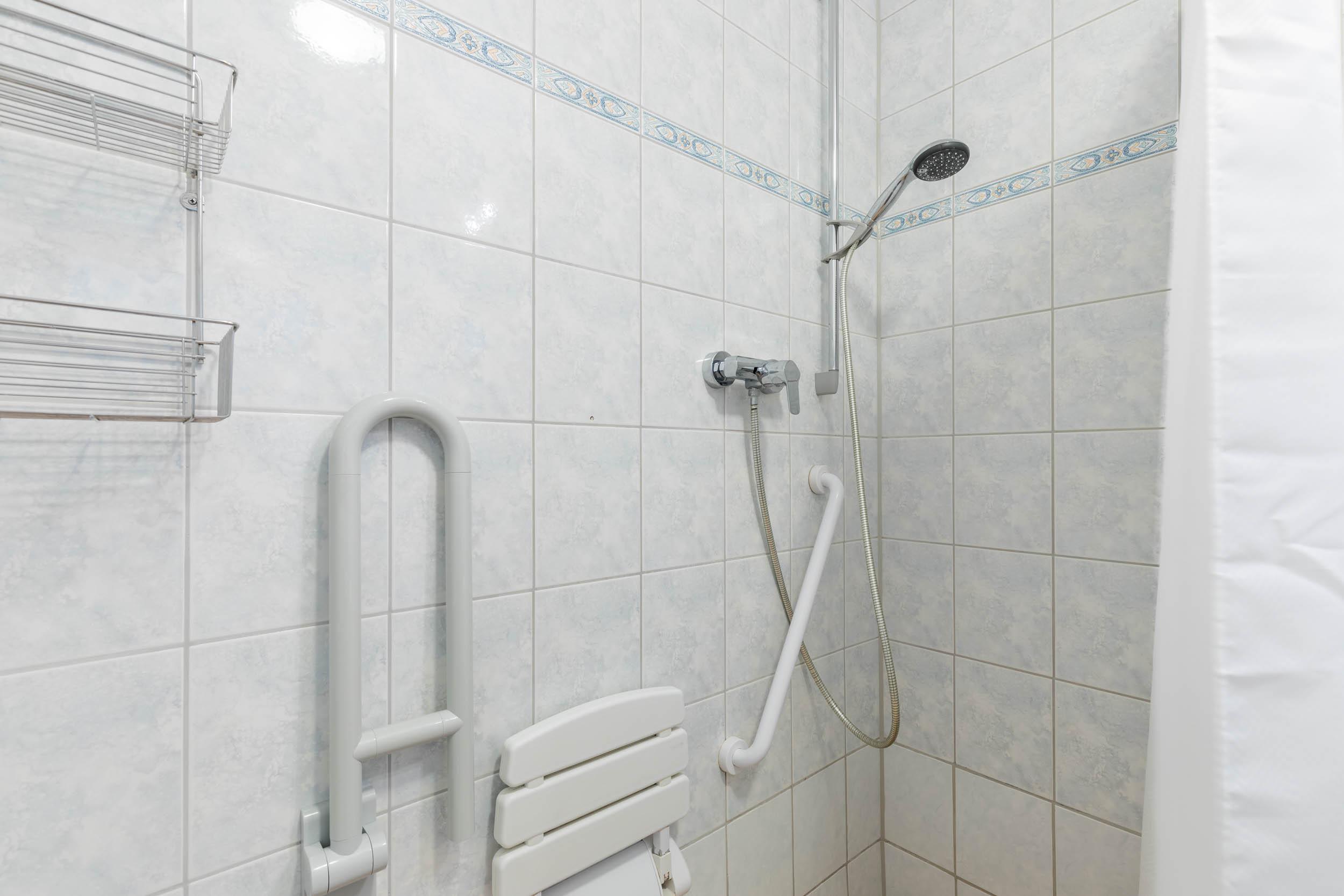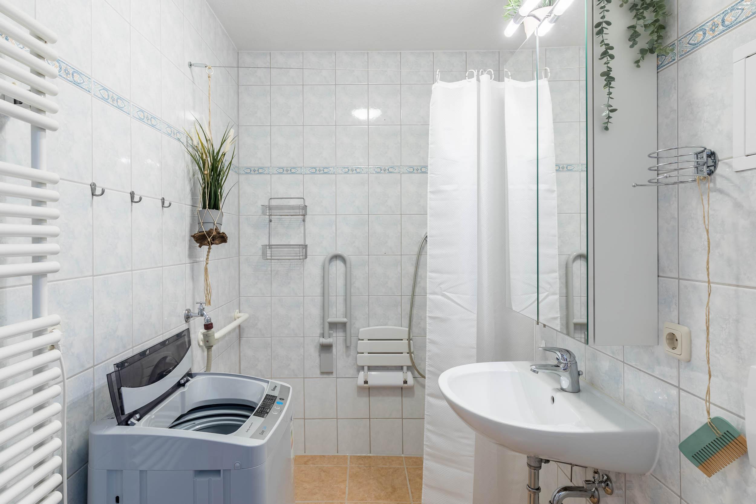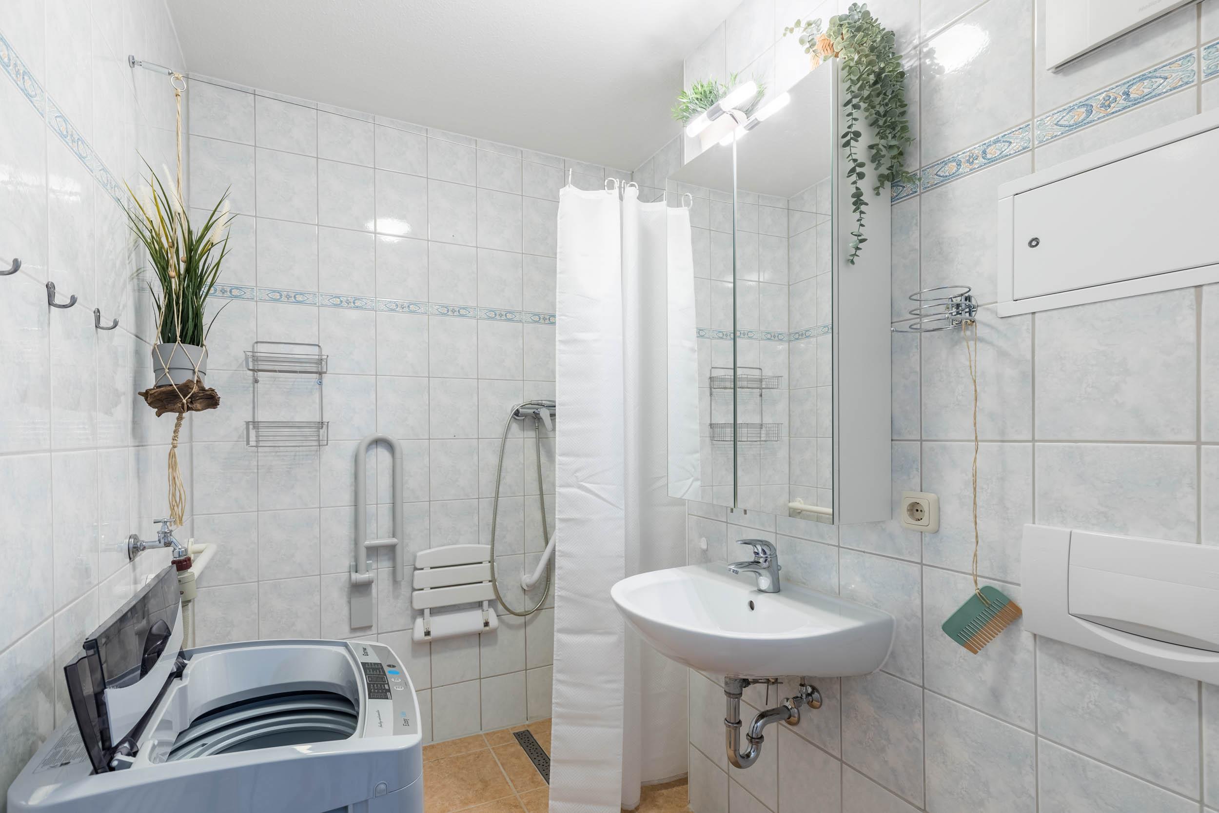 Ein freundliches seniorengeeignetes Duschbad mit ebenerdiger Dusche, befestigtem Duschhocker und Haltegriff komplettiert diese strandnahe Ferienwohnung.