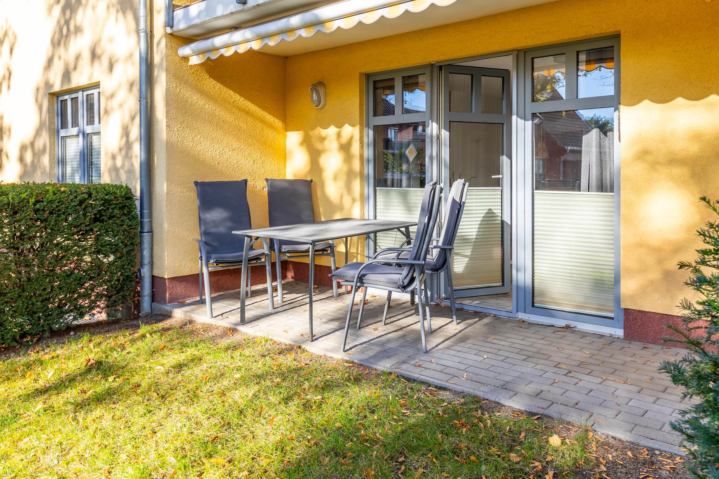 Genießen Sie die Ostseeluft auf der möblierten Südterrasse. Eine Hecke umrahmt das Grundstück des Hauses und schützt so vor Einblicken.