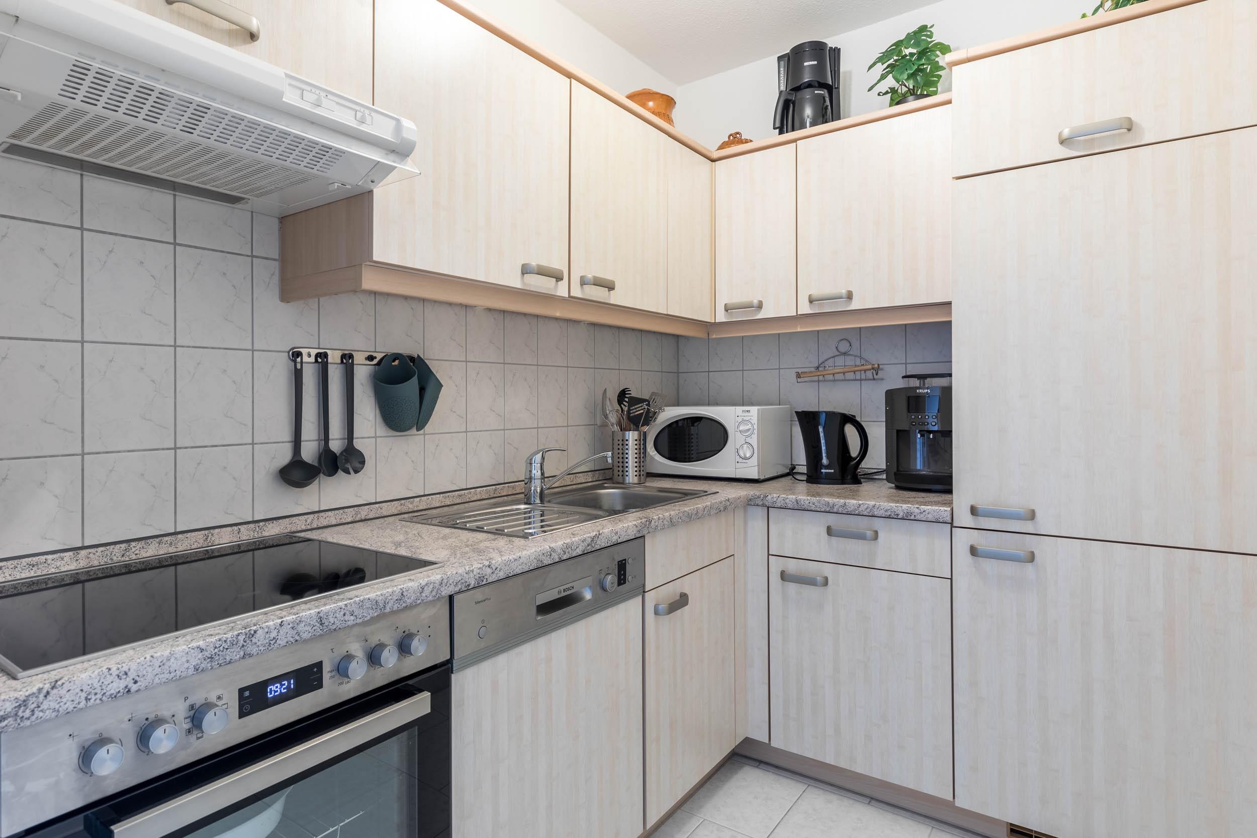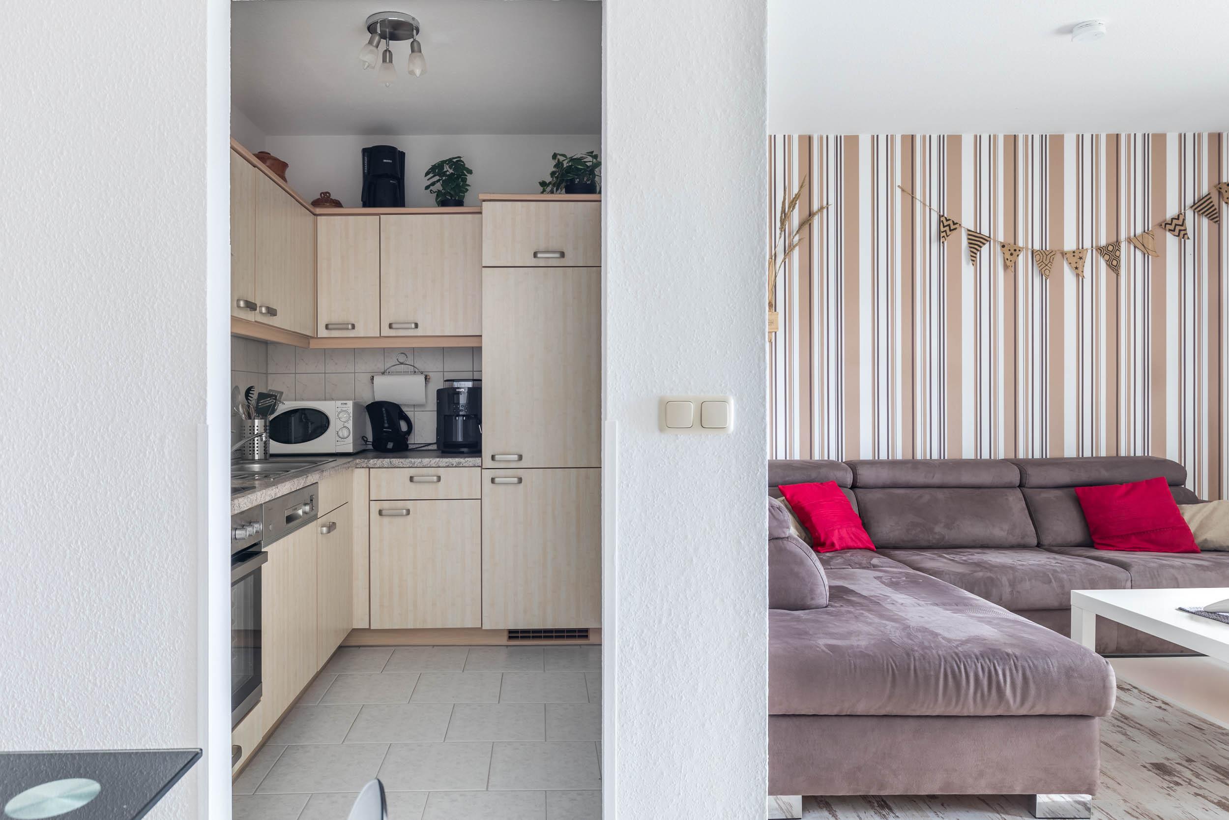 Neben der funktionellen Küchenzeile bietet die Sitzecke ausreichend Platz für ein gemeinsames Essen.