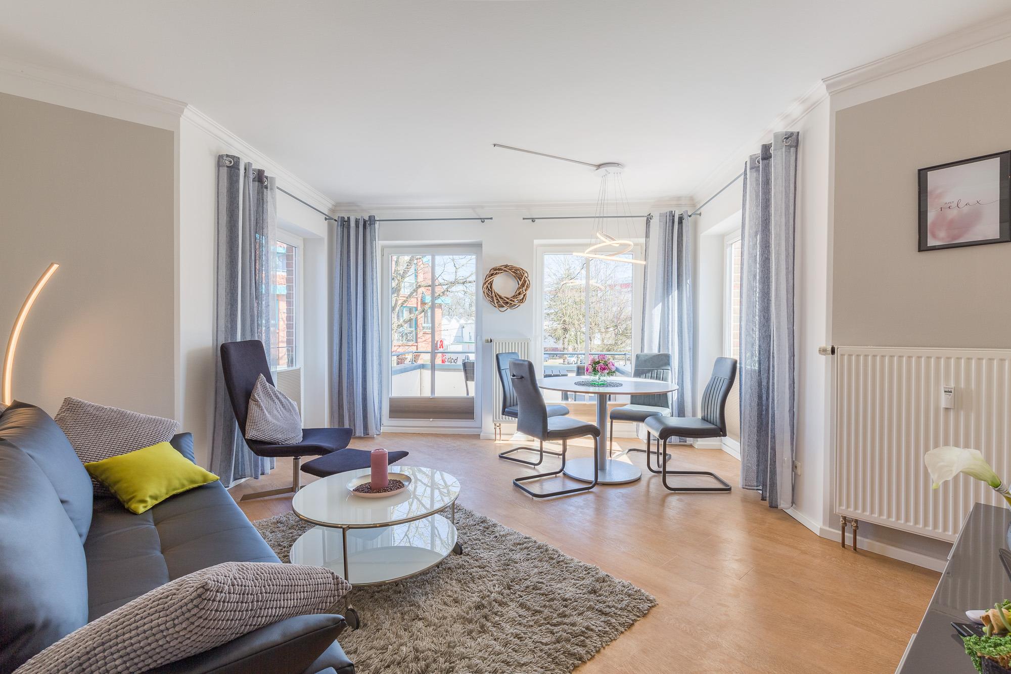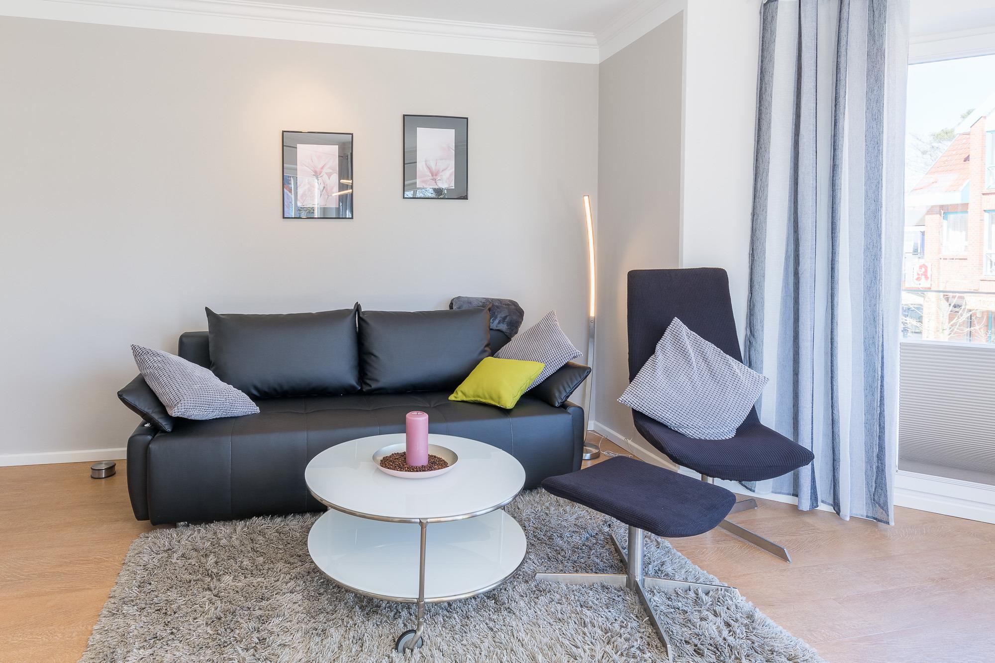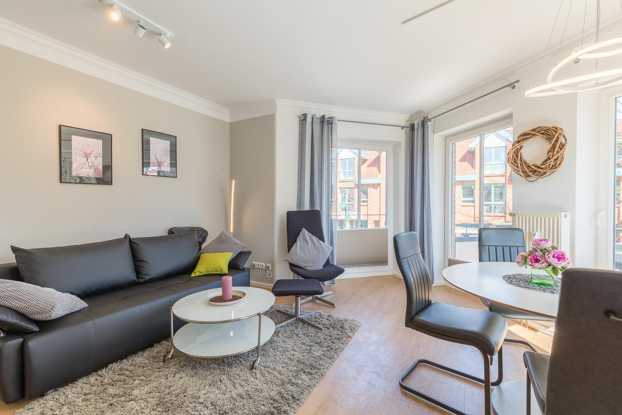 Vom großzügig geschnittenen, hell möblierten Eingangsbereich führt Sie der Weg direkt ins moderne Wohnzimmer mit Essbereich. Der große Flatscreen-TV, ein DVD-Player und ein CD-Player sorgen für Ihre Unterhaltung. Die Wohnung hat einen Internetzugang über WLAN. Bodentiefe Fenster bringen viel Licht in den Wohnraum. Sie lassen sich mit den vorhandenen Plissees verdunkeln. Vom Wohnbereich aus erreichen Sie den östlich ausgerichteten Balkon mit modernen Balkonmöbeln. Die Doppelschlafcouch im Wohnbereich nutzen Sie mit ihrer Liegefläche von 1,40 m Breite als Doppelbett.