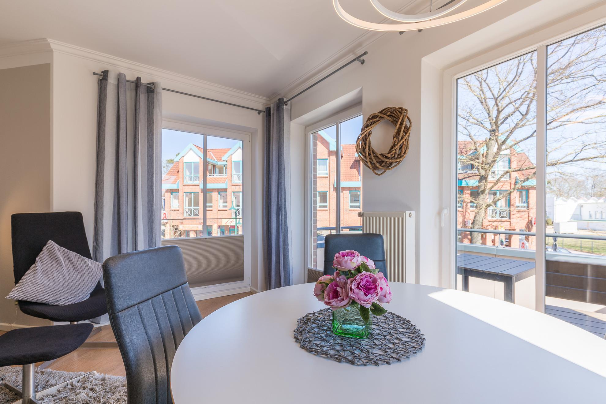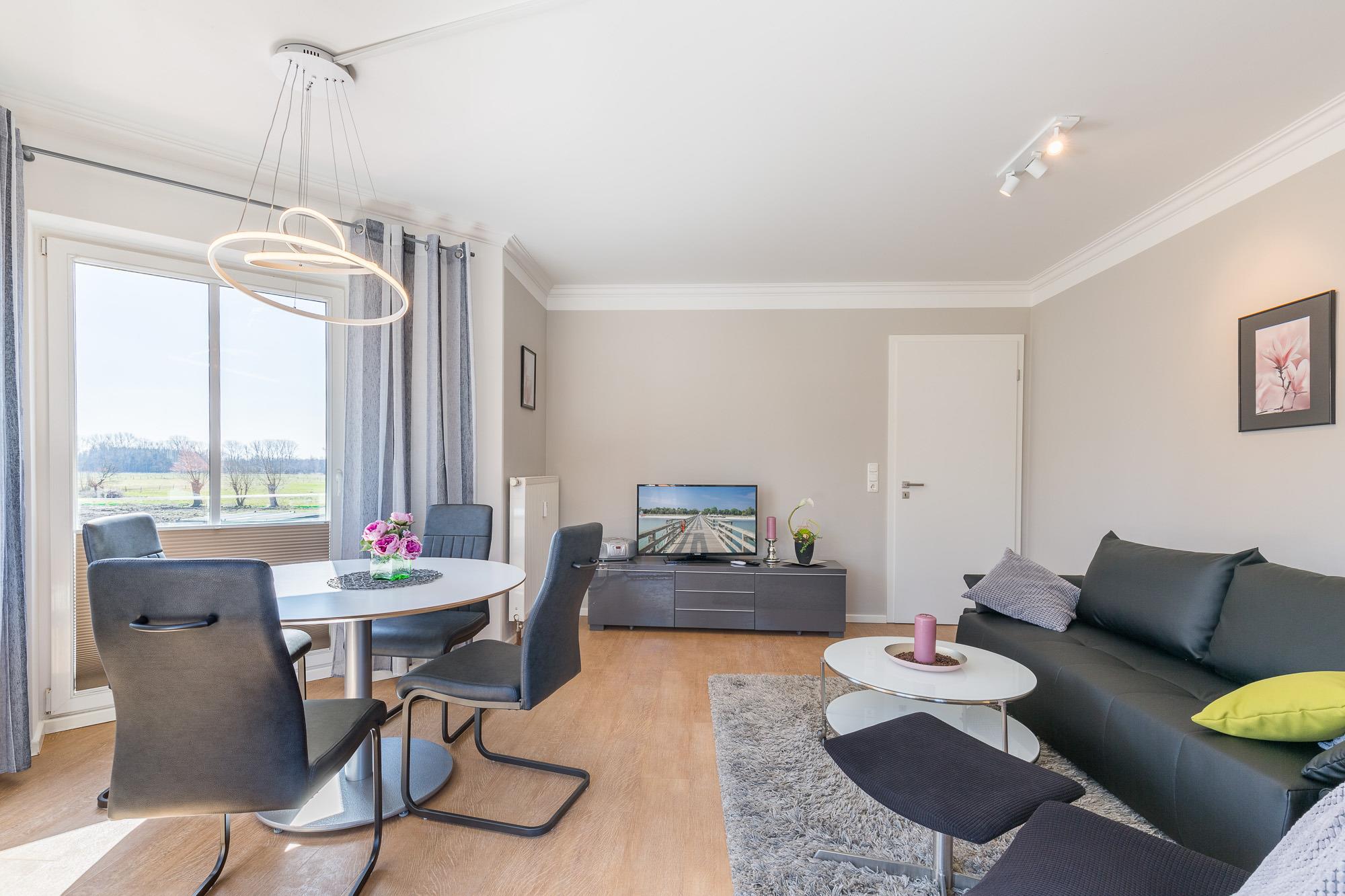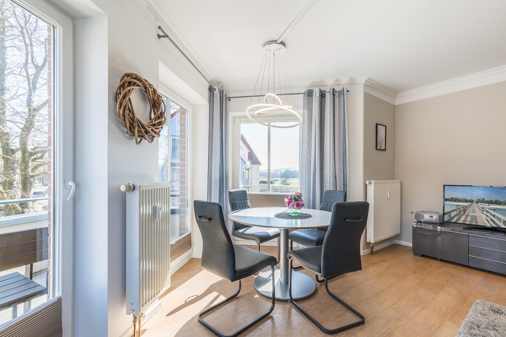 Vom großzügig geschnittenen, hell möblierten Eingangsbereich führt Sie der Weg direkt ins moderne Wohnzimmer mit Essbereich. Der große Flatscreen-TV, ein DVD-Player und ein CD-Player sorgen für Ihre Unterhaltung. Die Wohnung hat einen Internetzugang über WLAN. Bodentiefe Fenster bringen viel Licht in den Wohnraum. Sie lassen sich mit den vorhandenen Plissees verdunkeln. Vom Wohnbereich aus erreichen Sie den östlich ausgerichteten Balkon mit modernen Balkonmöbeln. Die Doppelschlafcouch im Wohnbereich nutzen Sie mit ihrer Liegefläche von 1,40 m Breite als Doppelbett.