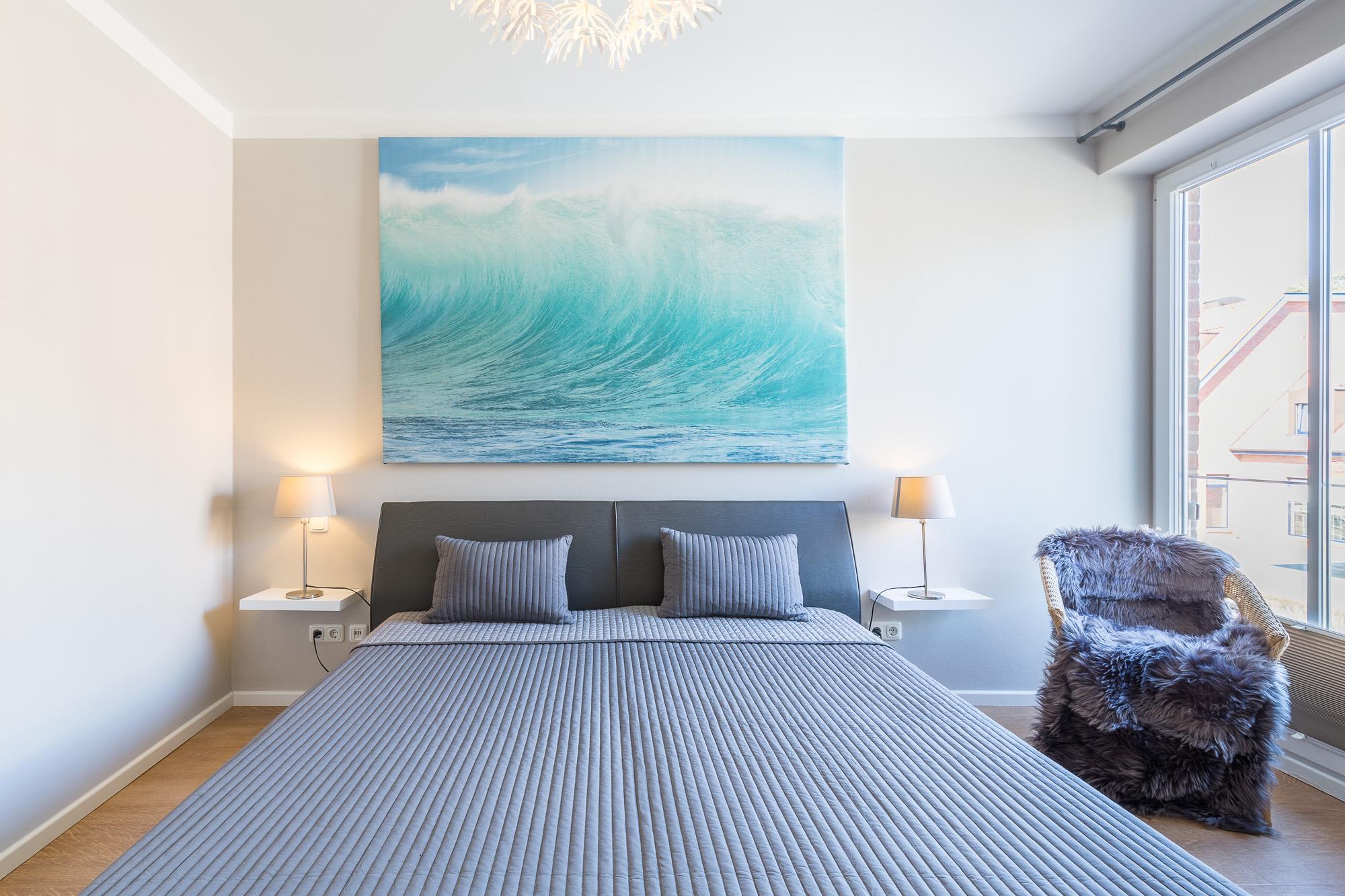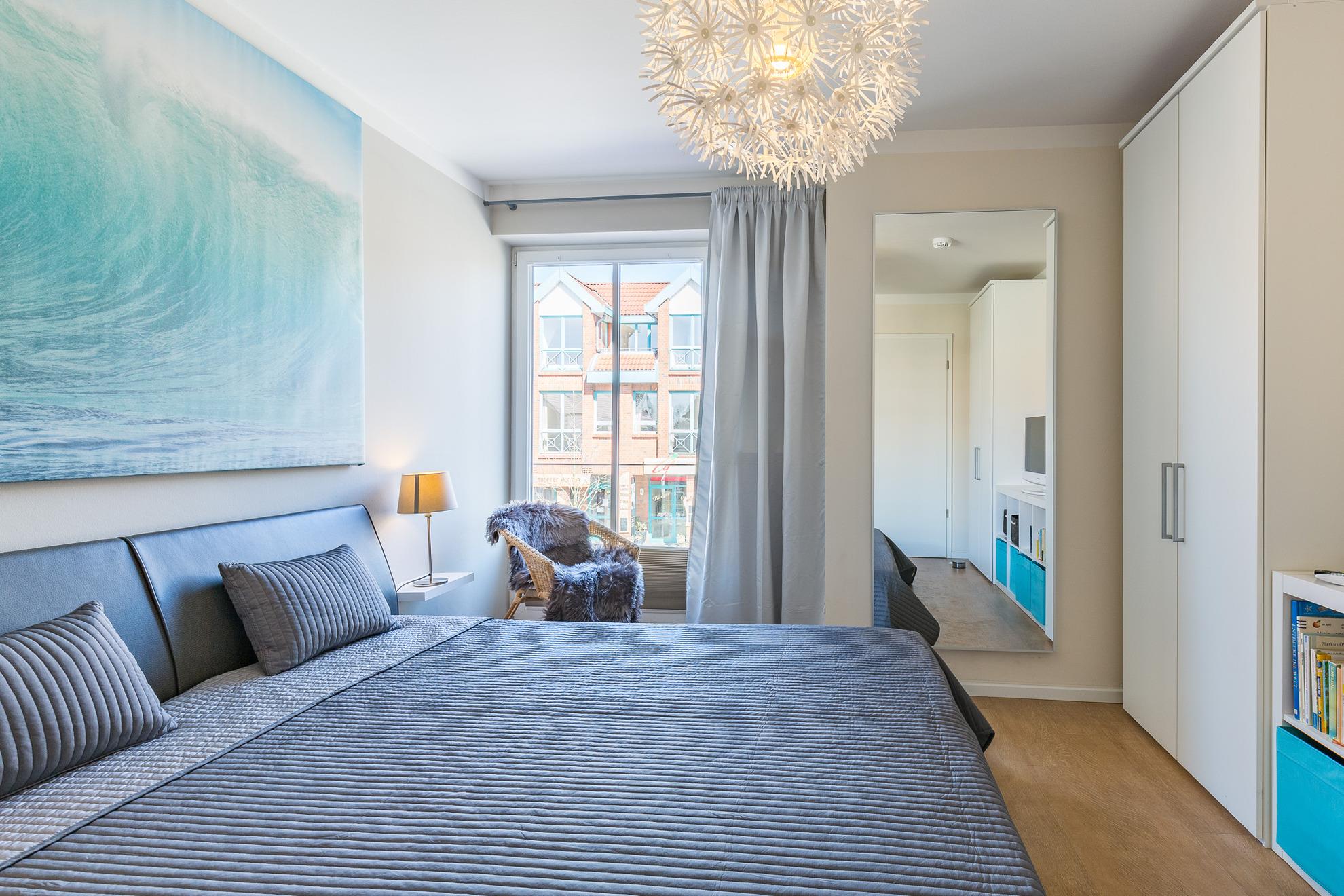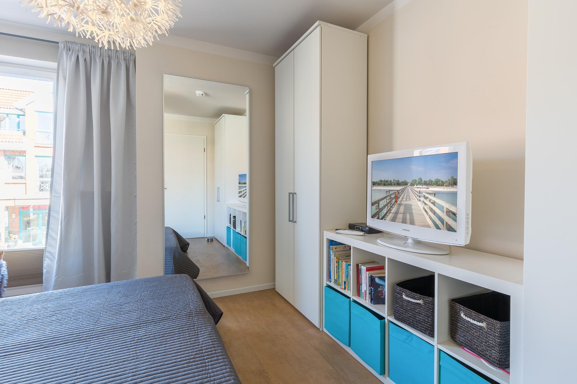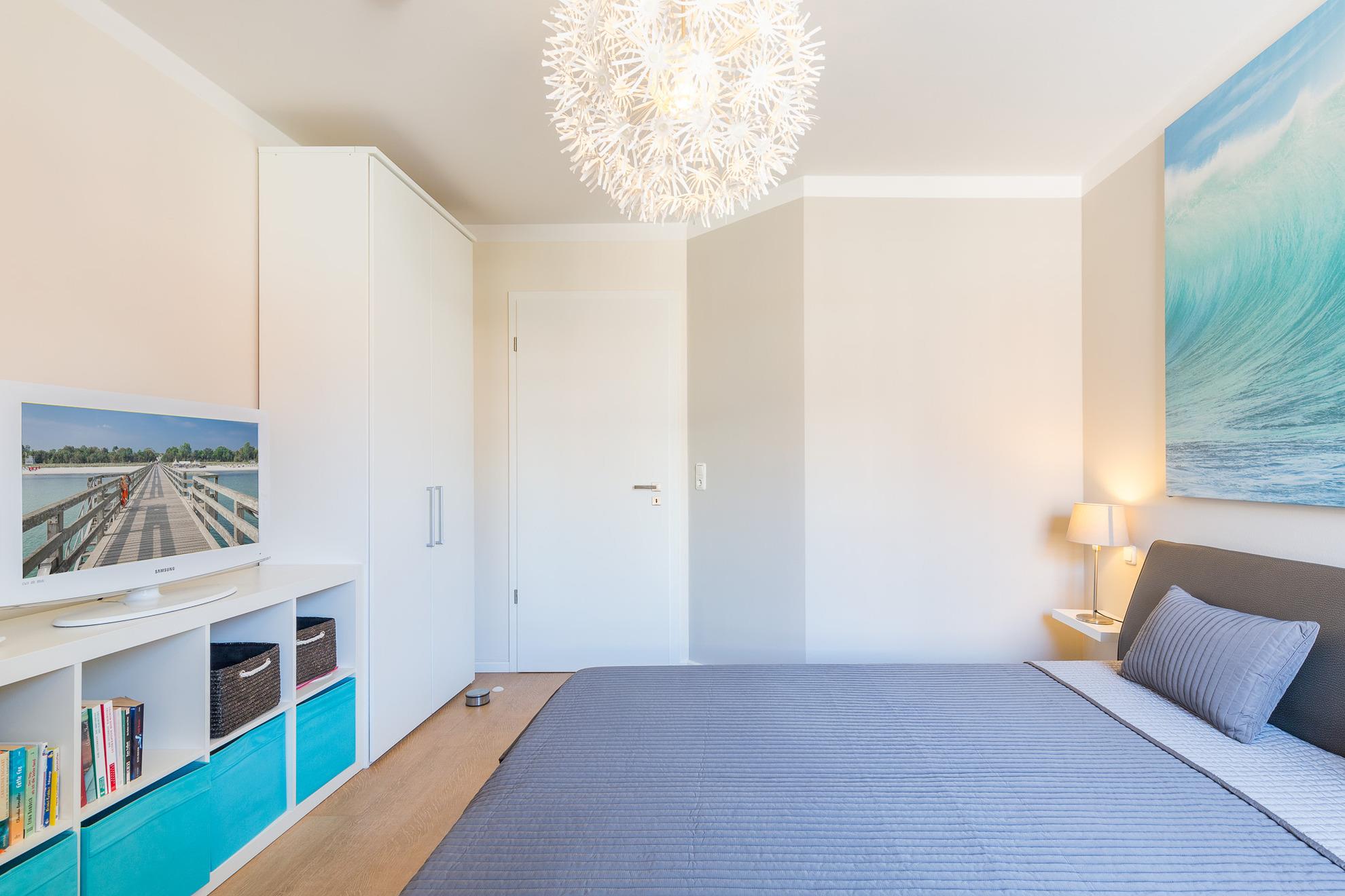 Im Schlafzimmer schlafen Sie im 1,80 m breiten Doppelbett. Der große Kleiderschrank bietet Platz für Ihre Urlaubsgarderobe. Hier befindet sich der zweite Flatscreen-TV. Die farblichen Akzente und die hellen Möbel geben diesem Zimmer das passende Meergefühl für Ihren Ostseeurlaub. Die großen Fenster geben dem Raum viel Licht. Plissees sorgen hier für Sichtschutz und Verdunkelung. In der Wohnung ist eine Internetanbindung mit WLAN verfügbar!