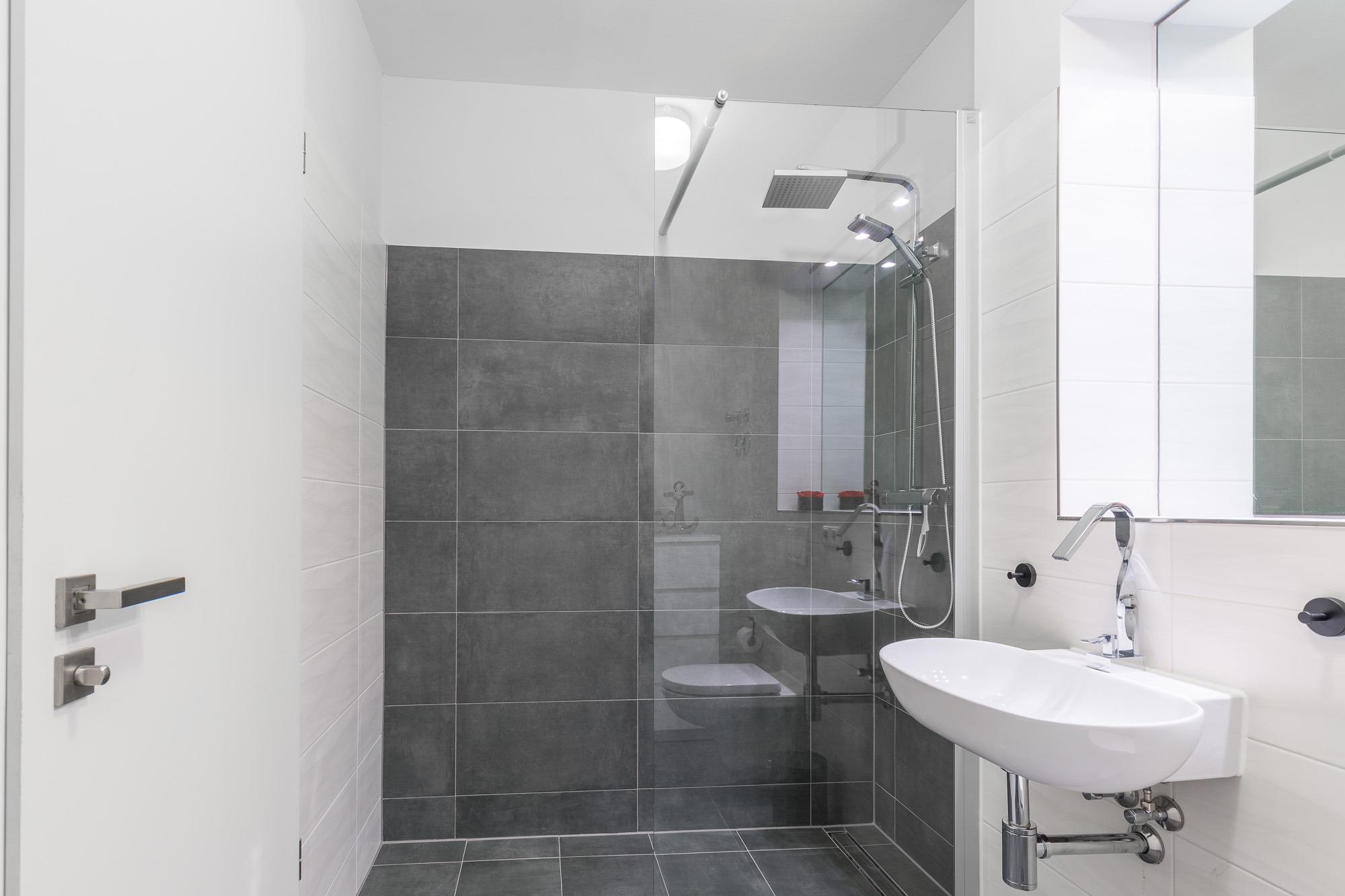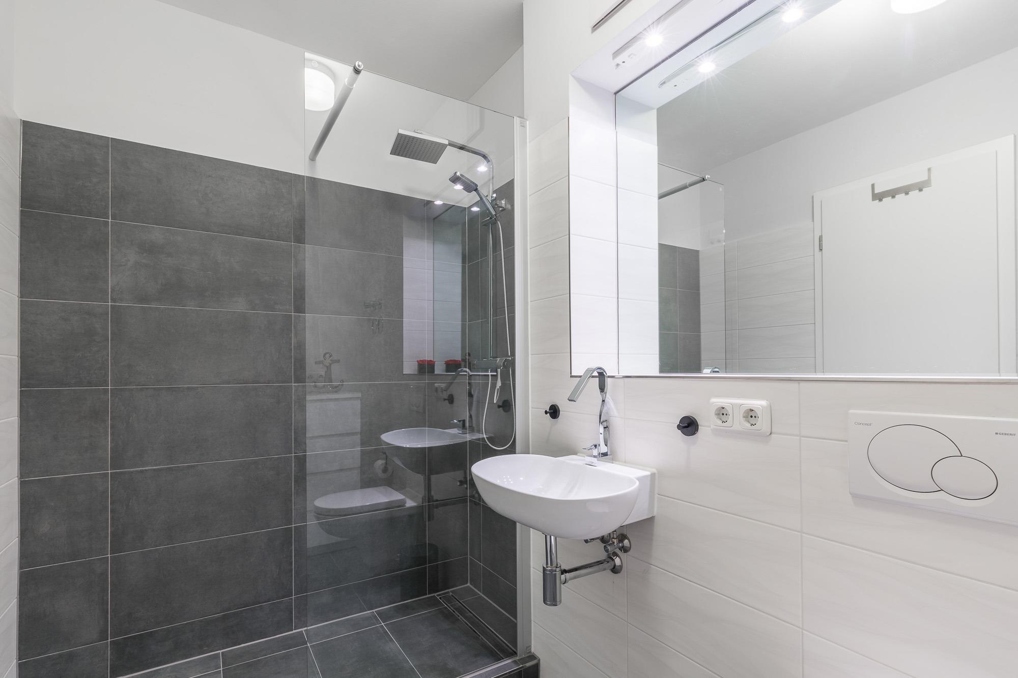 In modernen Grautönen gefliest ist die barrierefreie Walk-In Dusche ist. Sie bietet viel Platz und angenehmes Duschvergnügen nach dem Tag am Strand.