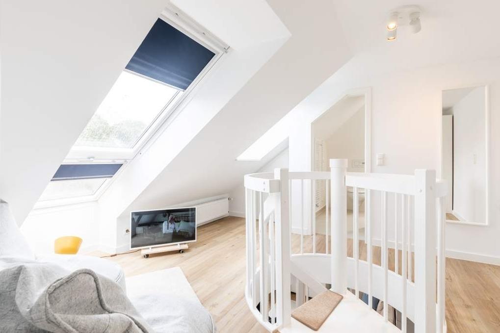 Zur zweiten Ebene (DG) gelangen Sie über eine offene Holzwendeltreppe vom Wohnzimmer aus.