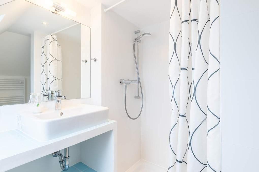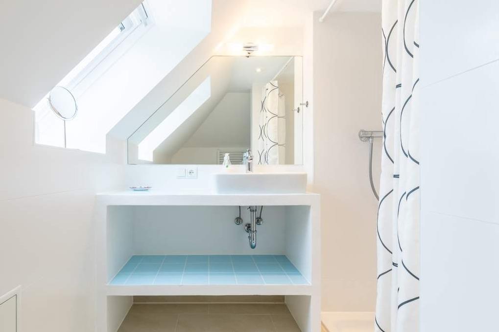 Weiterhin finden Sie auf dieser Etage das Gäste-/ Kinderzimmer mit zwei Einzelbetten (je 80x200cm/ Höhe 65cm) und auch das Badezimmer mit Dusche und WC. Das Fenster hilft beim Lüften, z.B. nach dem Duschen und die Handtuchheizung sorgt hier für wohlige Wärme.