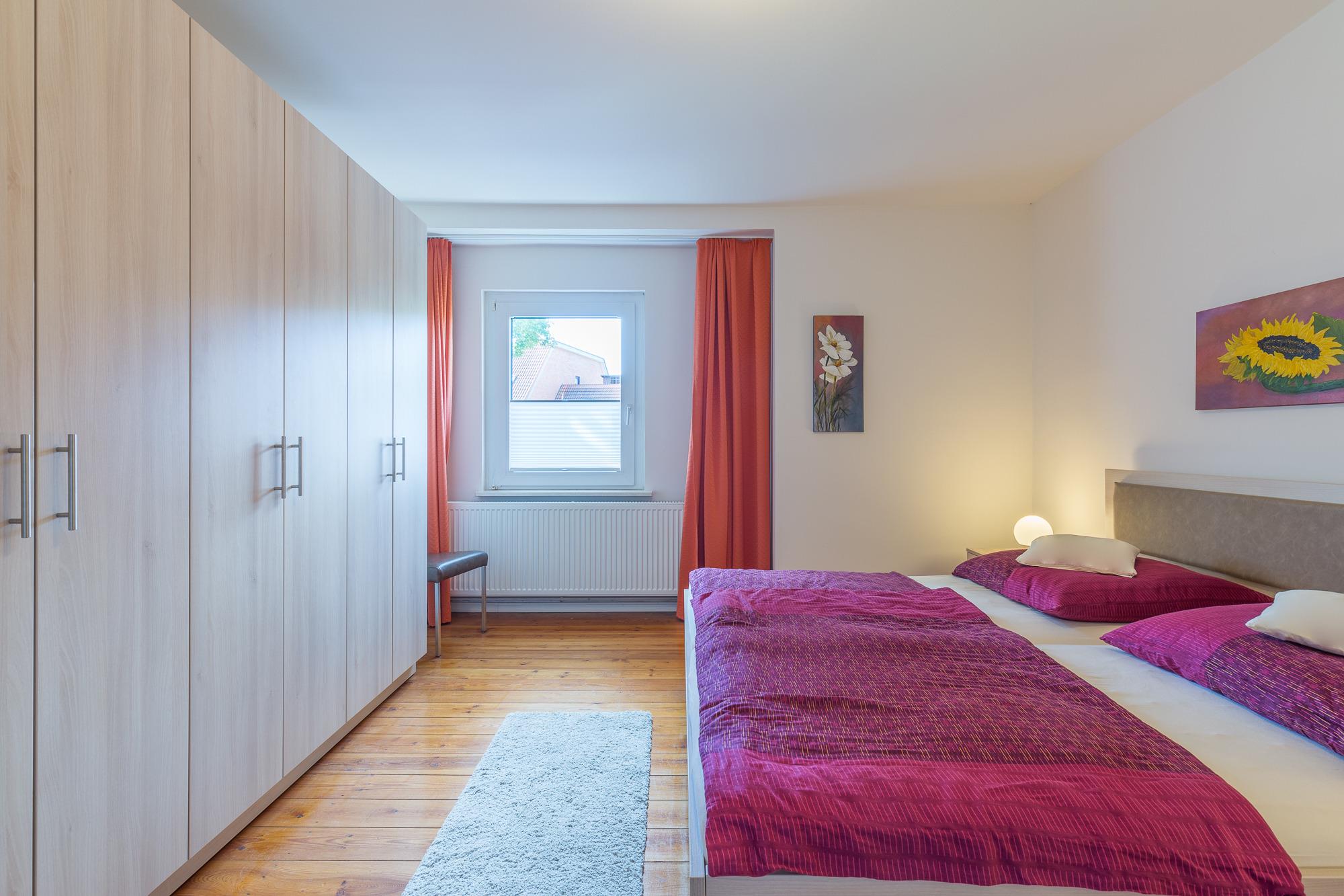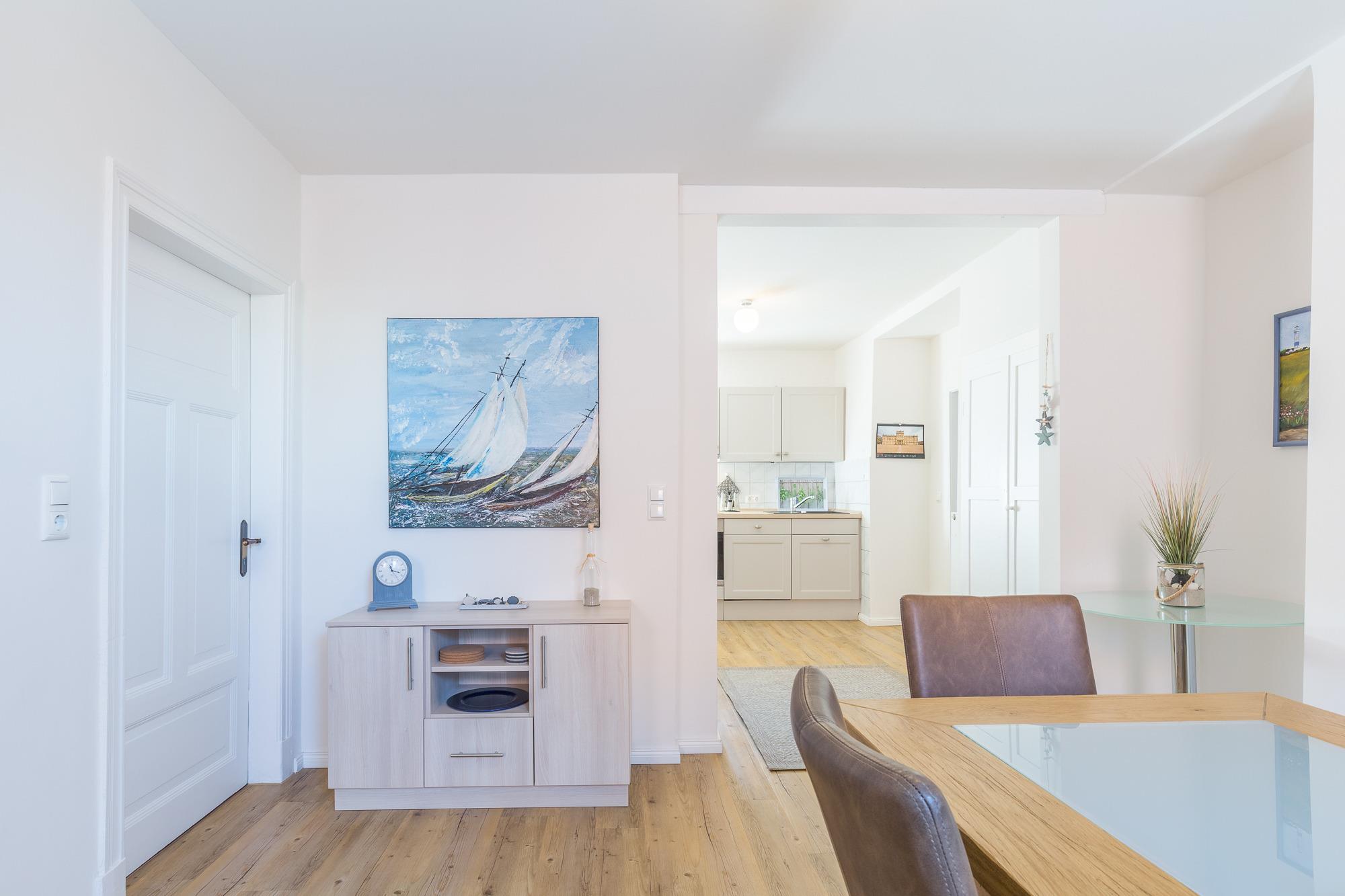 Der angrenzende Essbereich bietet Platz für 4 Personen im Familienurlaub oder im Urlaub mit Freunden. Neben der Wohnküche und dem Essbereich finden Sie hier im 1. OG zwei Schlafzimmer und ein Badezimmer vor.