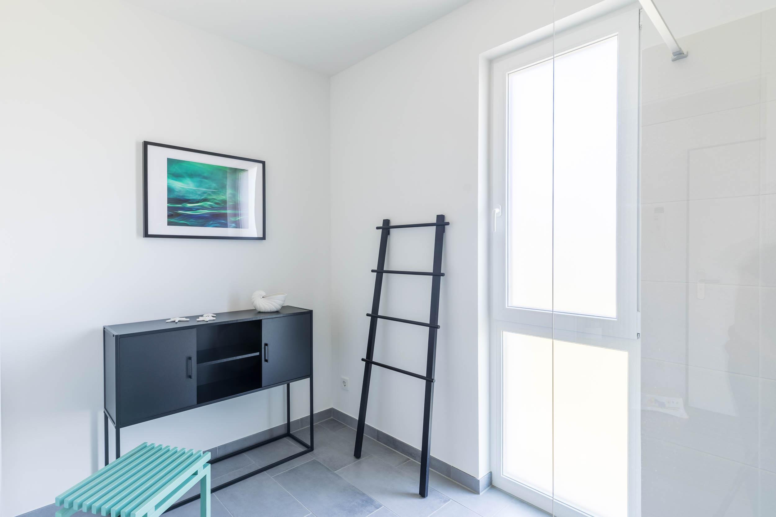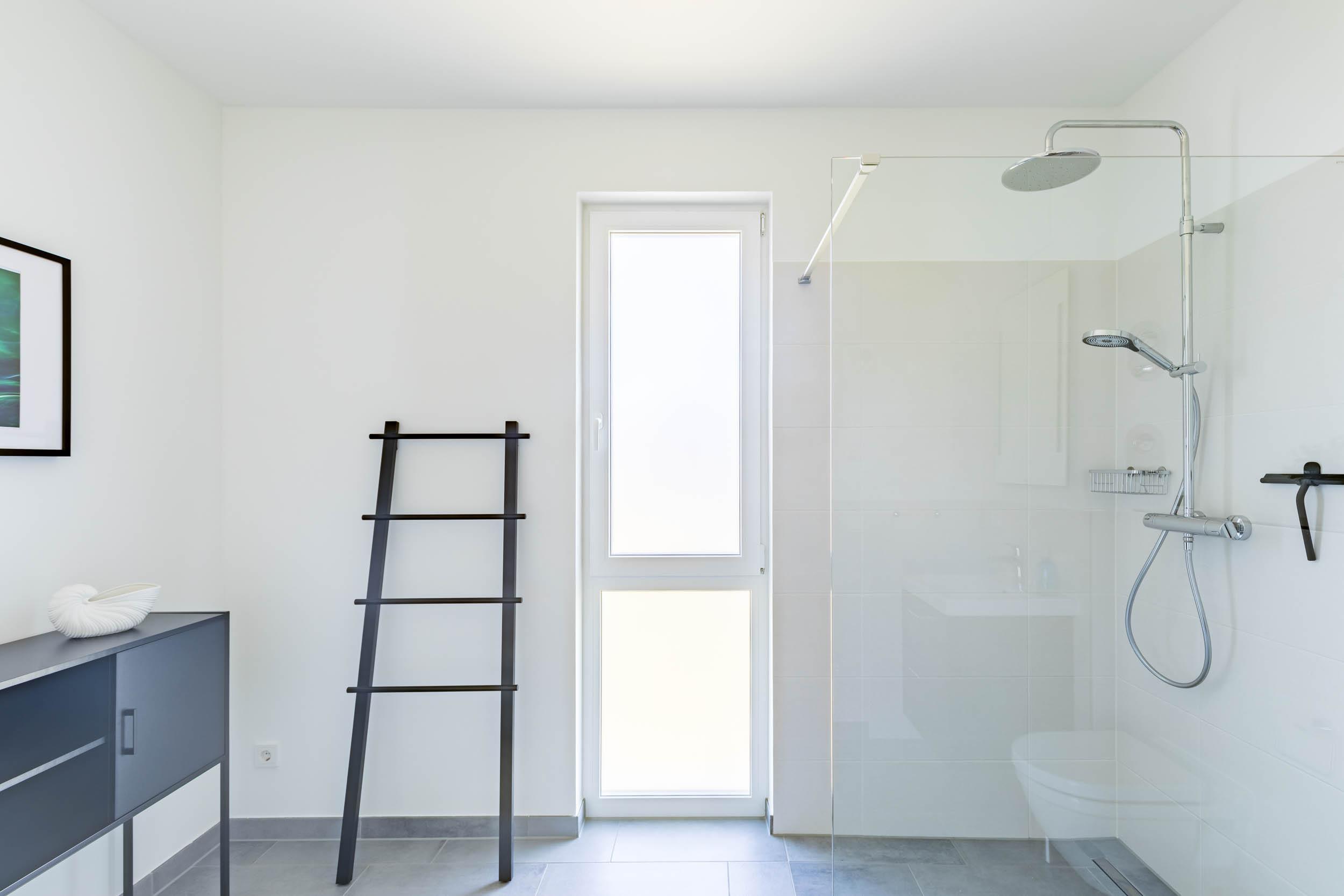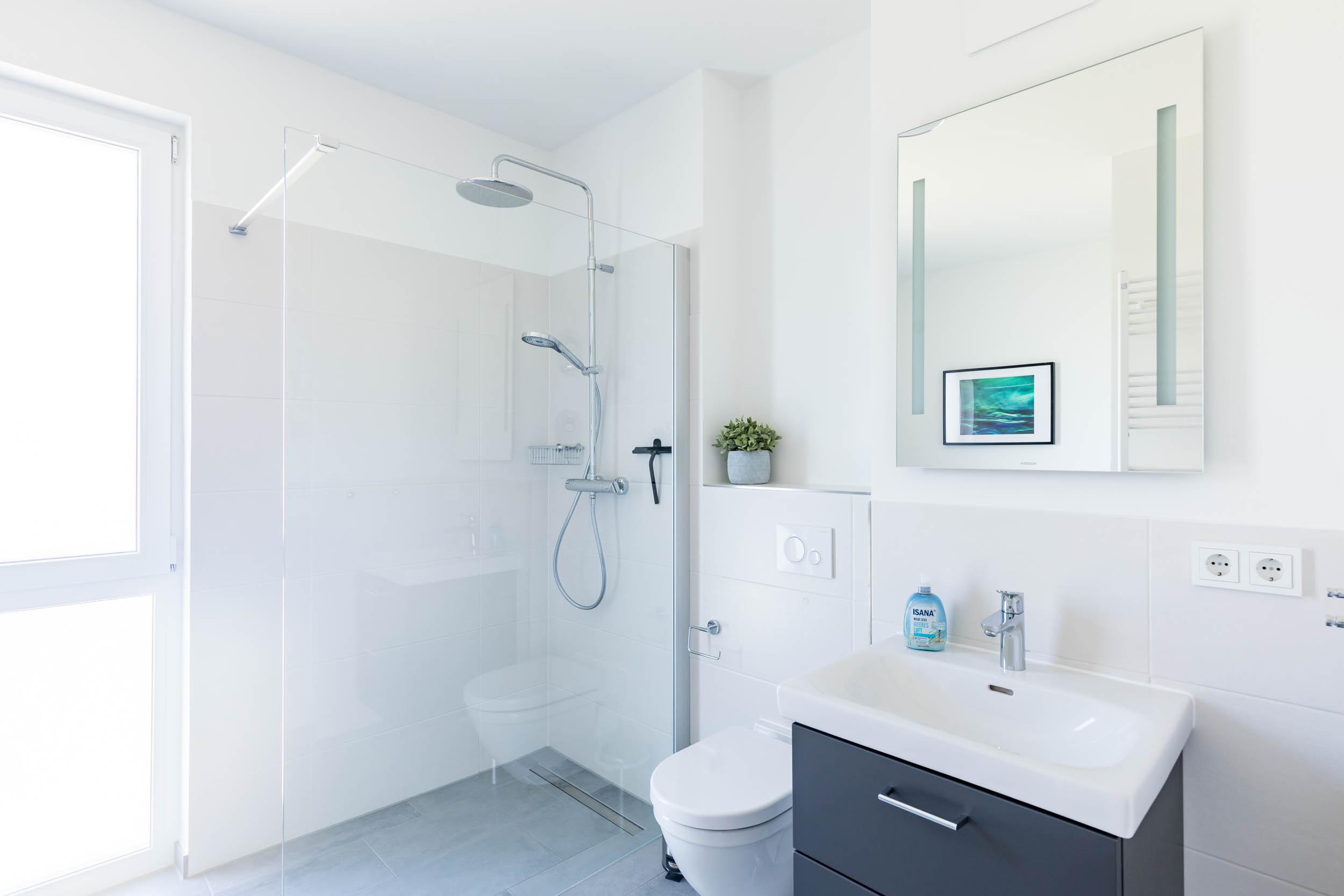 Ein großzügiges modernes Duschbad mit ebenerdiger Dusche und WC schließt sich an. Das Fenster bietet Tageslicht und hilft beim Lüften nach dem Duschen. Eine Handtuchheizung bietet zusätzliche Wärme im Bad.