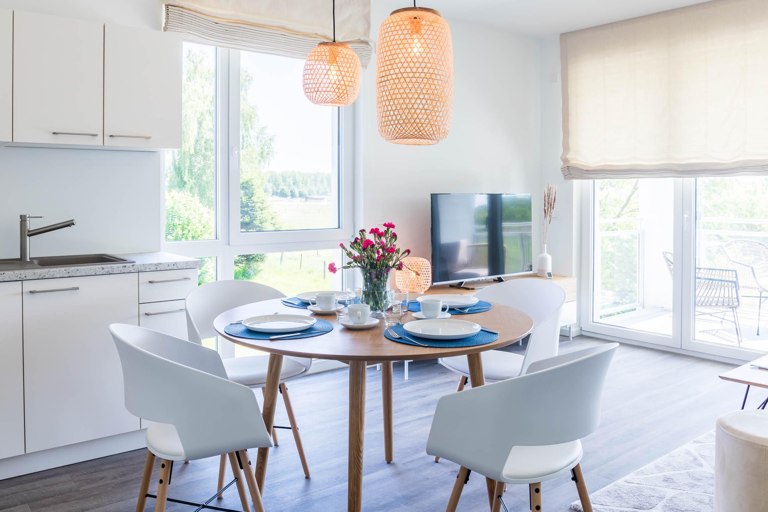 Im kombinierten Wohn- und Essbereich stehen eine komfortable Küchenzeile, eine separate Essecke und eine bequeme Sofaecke mit herrlichem Blick ins Grüne zur Verfügung. Für entspannte Abende sorgt der Flatscreen-TV (Magenta-TV!). Auch diverse Spiele und Bücher stehen Ihnen hier zur Unterhaltung zur Verfügung.