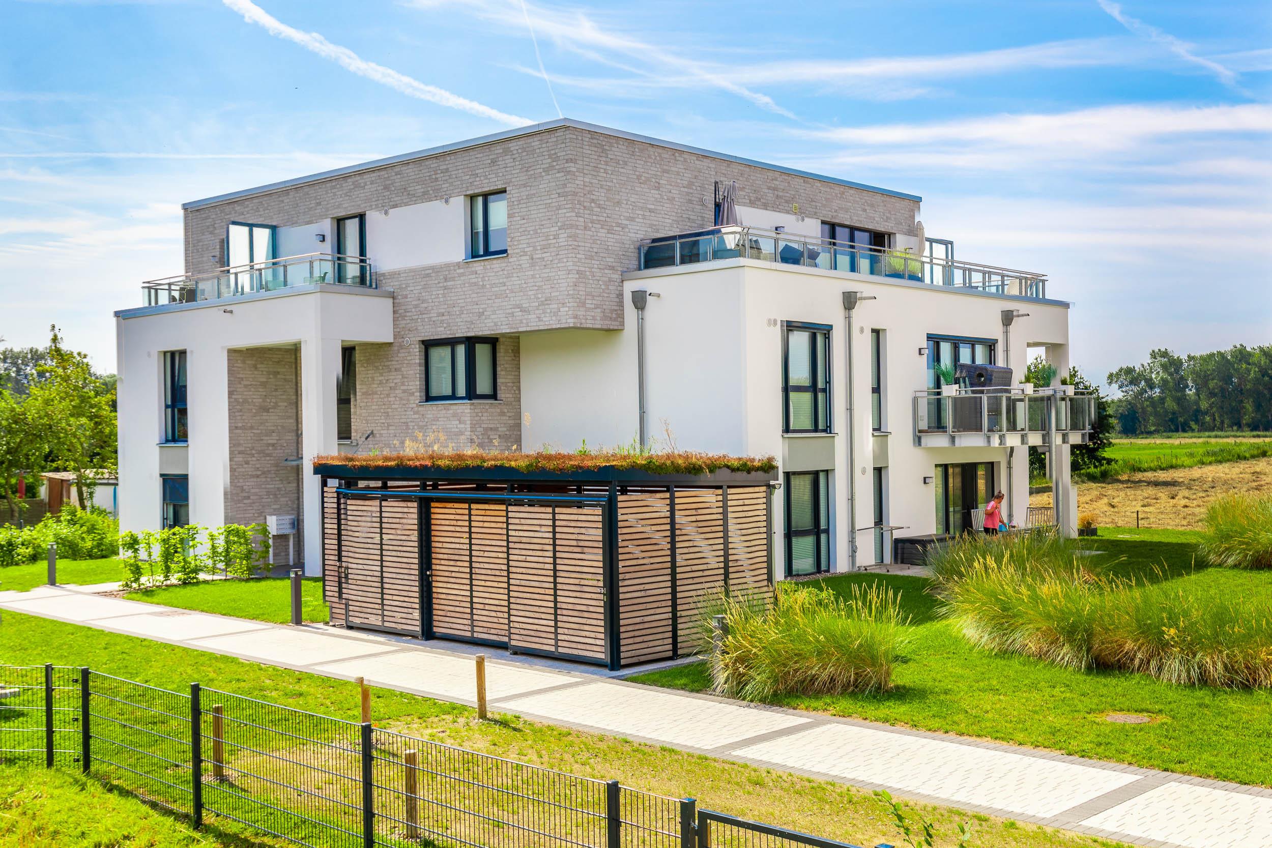 Fahrräder können im hauseigenen allgemeinen Fahrradschuppen untergestellt werden. Hier befinden sich auch 3 Steckdosen zum Laden für E-Bikes. Zudem befindet sich im Erdgeschoss ein hauseigener Abstellraum für Kinderwagen und Rollatoren.