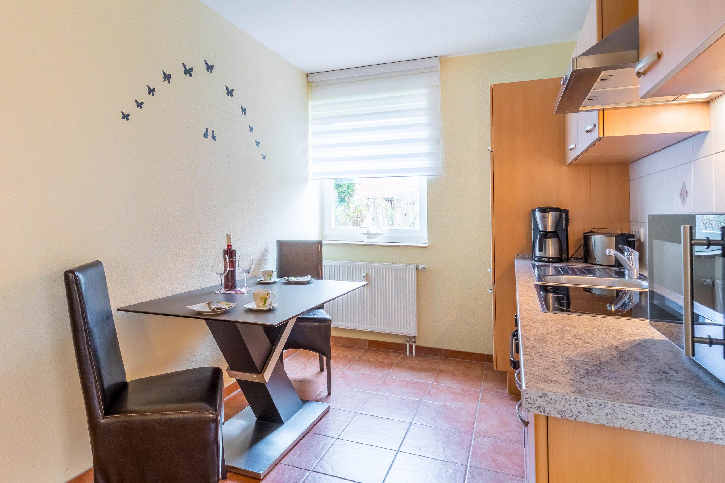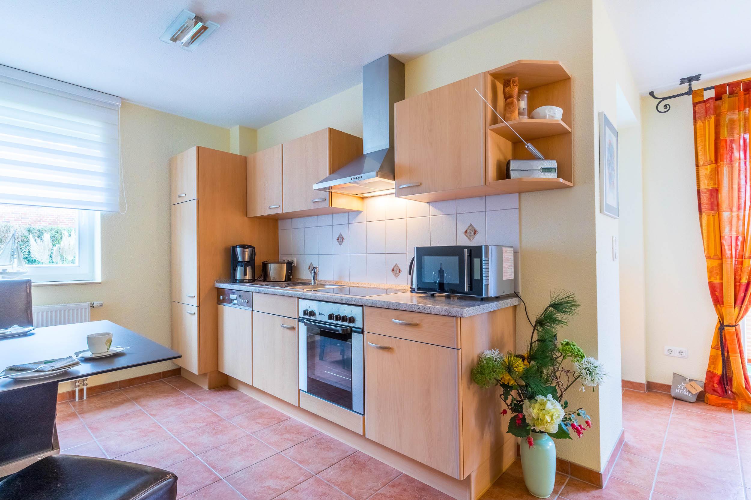 Die moderne Küche bietet eine hervorragende Ausstattung für die Selbstverpflegung. Backofen, Cerankochfeld, Geschirrspüler und Mikrowelle sind ebenso vorhanden wie die Küchengrundausstattung und Elektro-Kleingeräte.