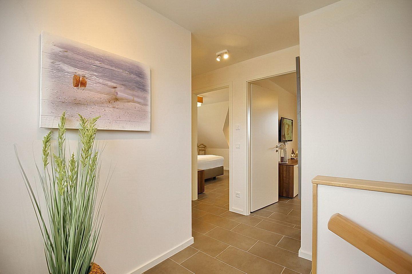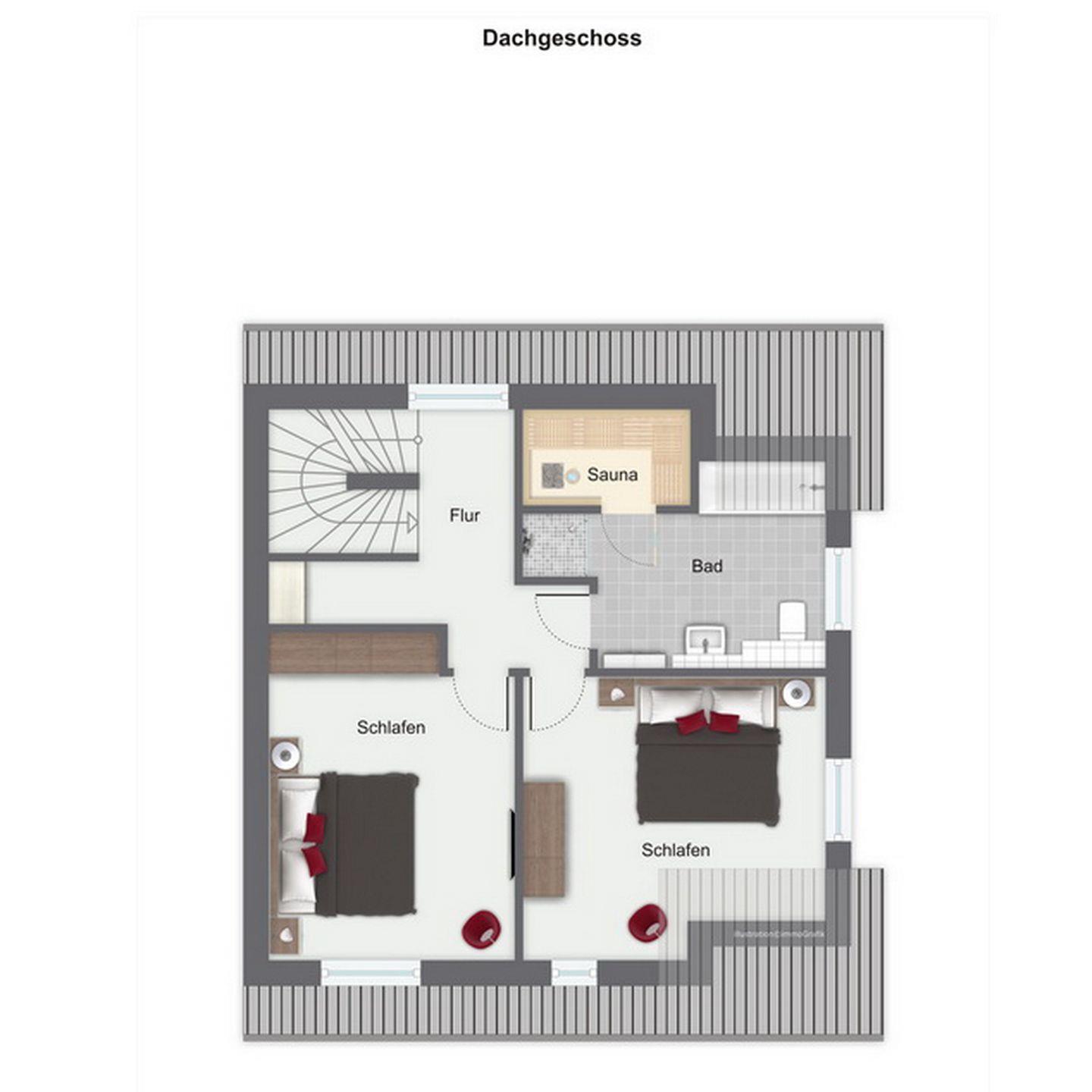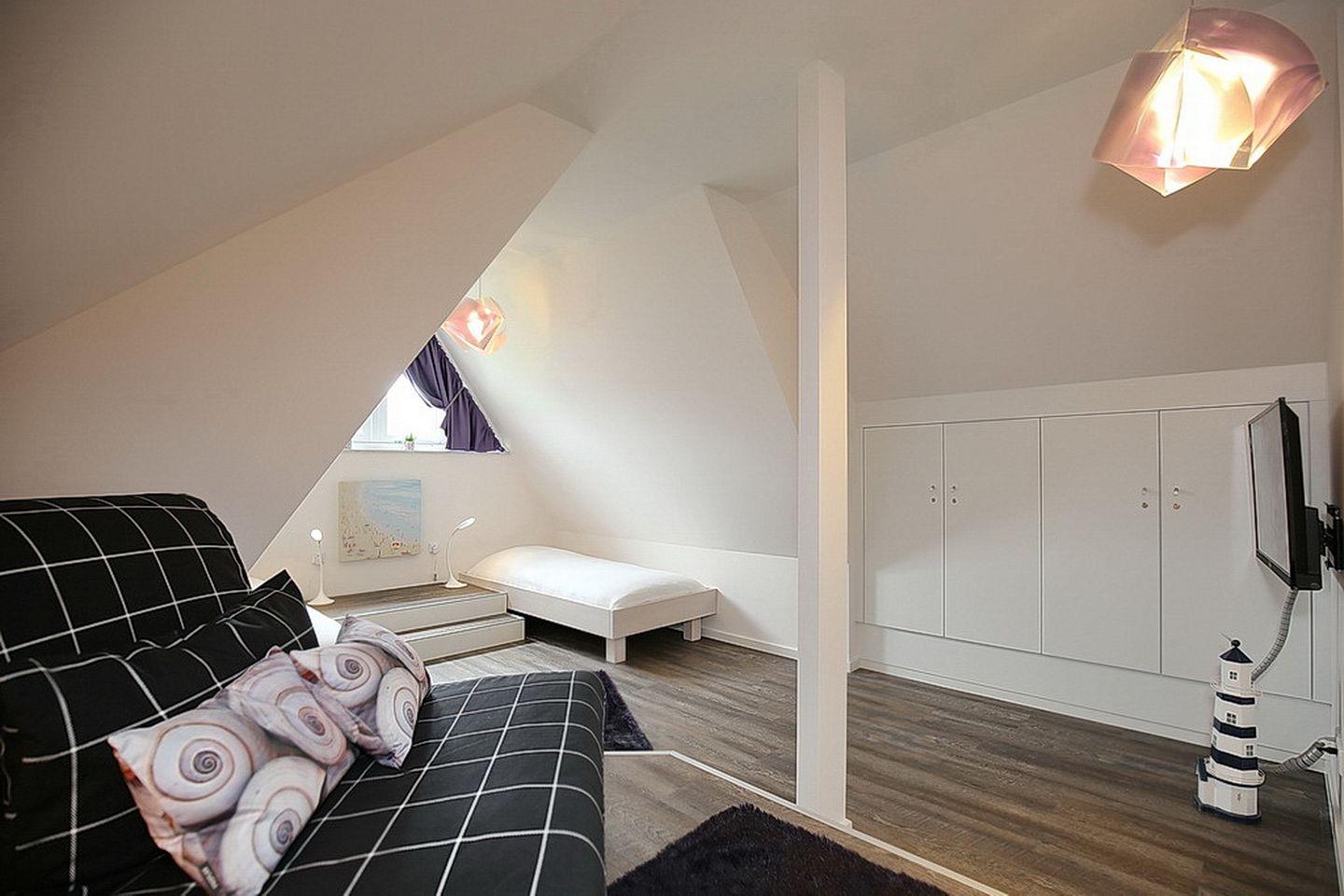 In den zwei Schlafzimmern im Dachgeschoss stehen dir zwei Doppelbetten (180 x 200 cm und 2 x 90 cm x 200 cm), jeweils ein TV und Schränke mit ausreichend Platz für deine Urlaubsgarderobe zur Verfügung. Des Weiteren verfügt das Dachgeschoss über ein Bad mit Badewanne und Sauna sowie den Flur.