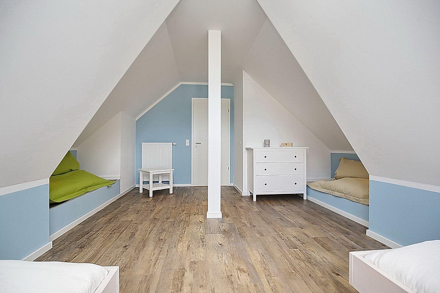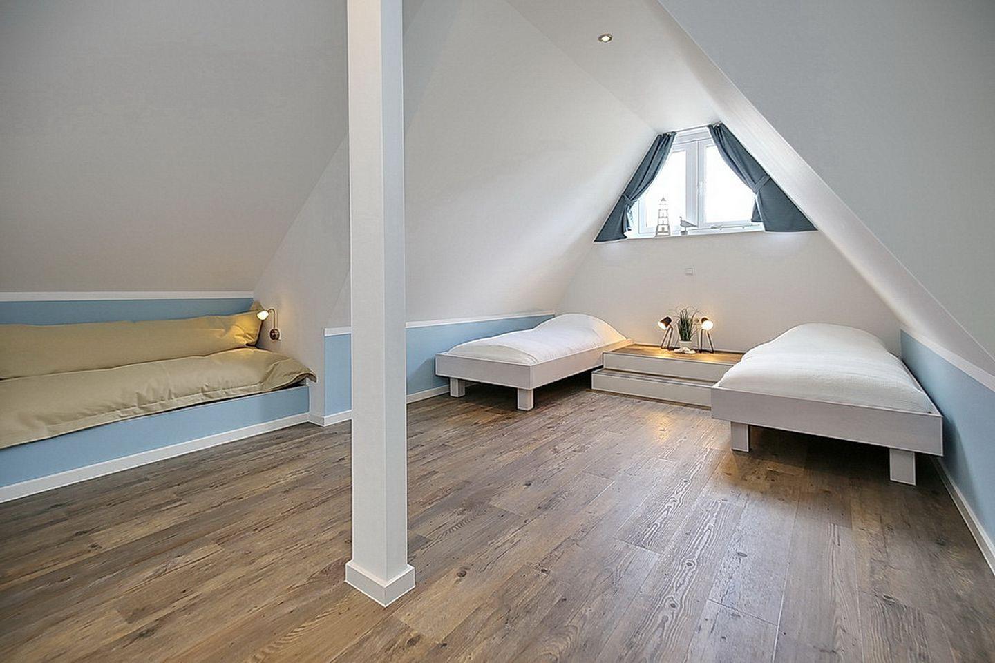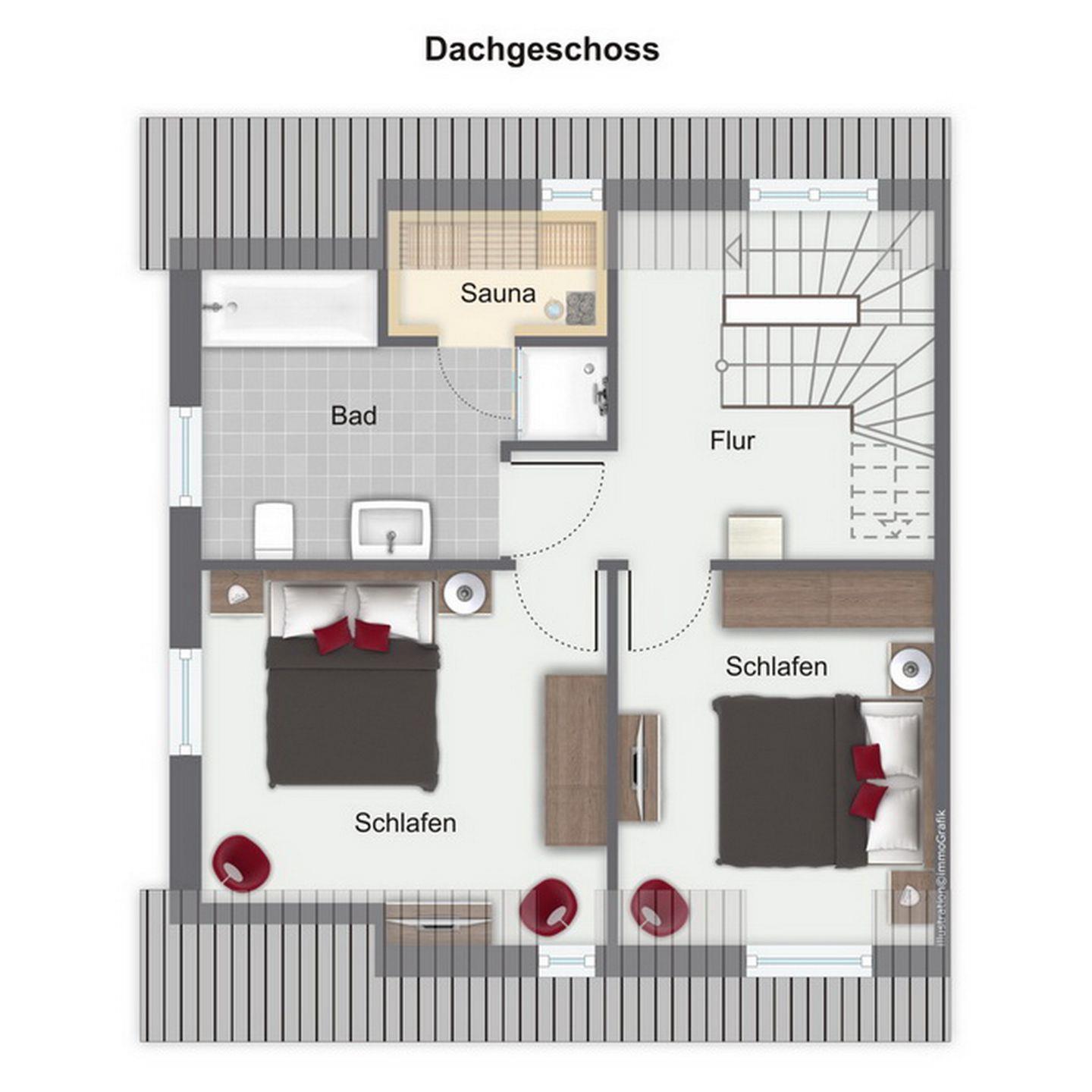 In den zwei Schlafzimmern im Dachgeschoss stehen dir ein Doppelbett (1x 180 cm x 210 cm), zwei zusammenstehende Einzelbetten (90 cm x 210 cm) und Schränke mit ausreichend Platz für deine Urlaubsgarderobe zur Verfügung. Des Weiteren verfügt das Dachgeschoss über ein Bad mit Badewanne, Dusche, Sauna und den Flur. Im Spitzboden befindet sich ein weiteres Schlafzimmer mit zwei Einzelbetten (90 x 200 cm). Zwei Schlafzimmer verfügen zusätzlich über jeweils einen Fernseher.
