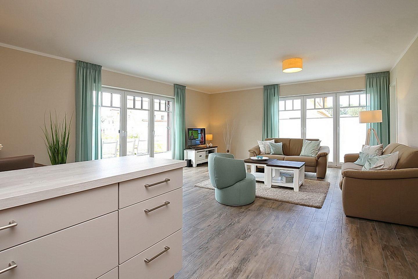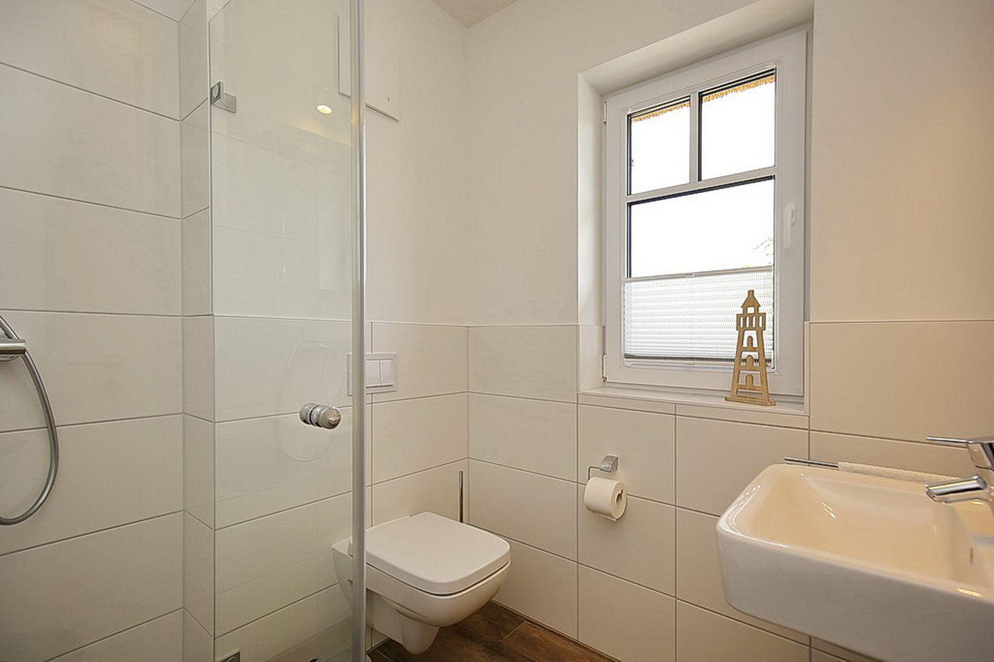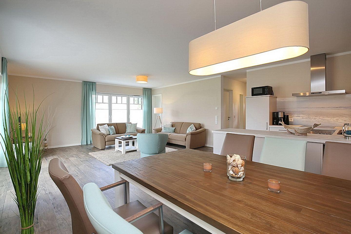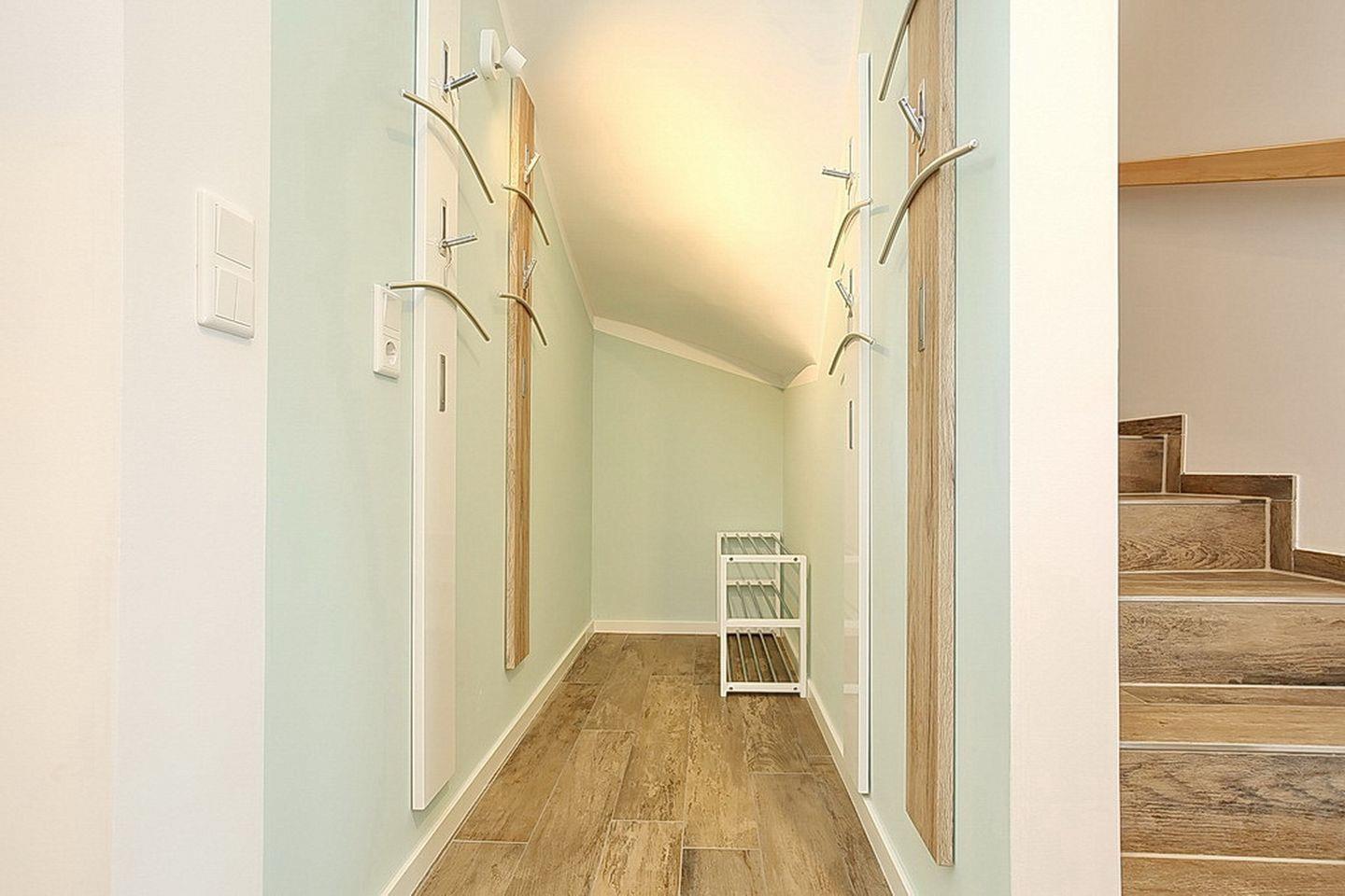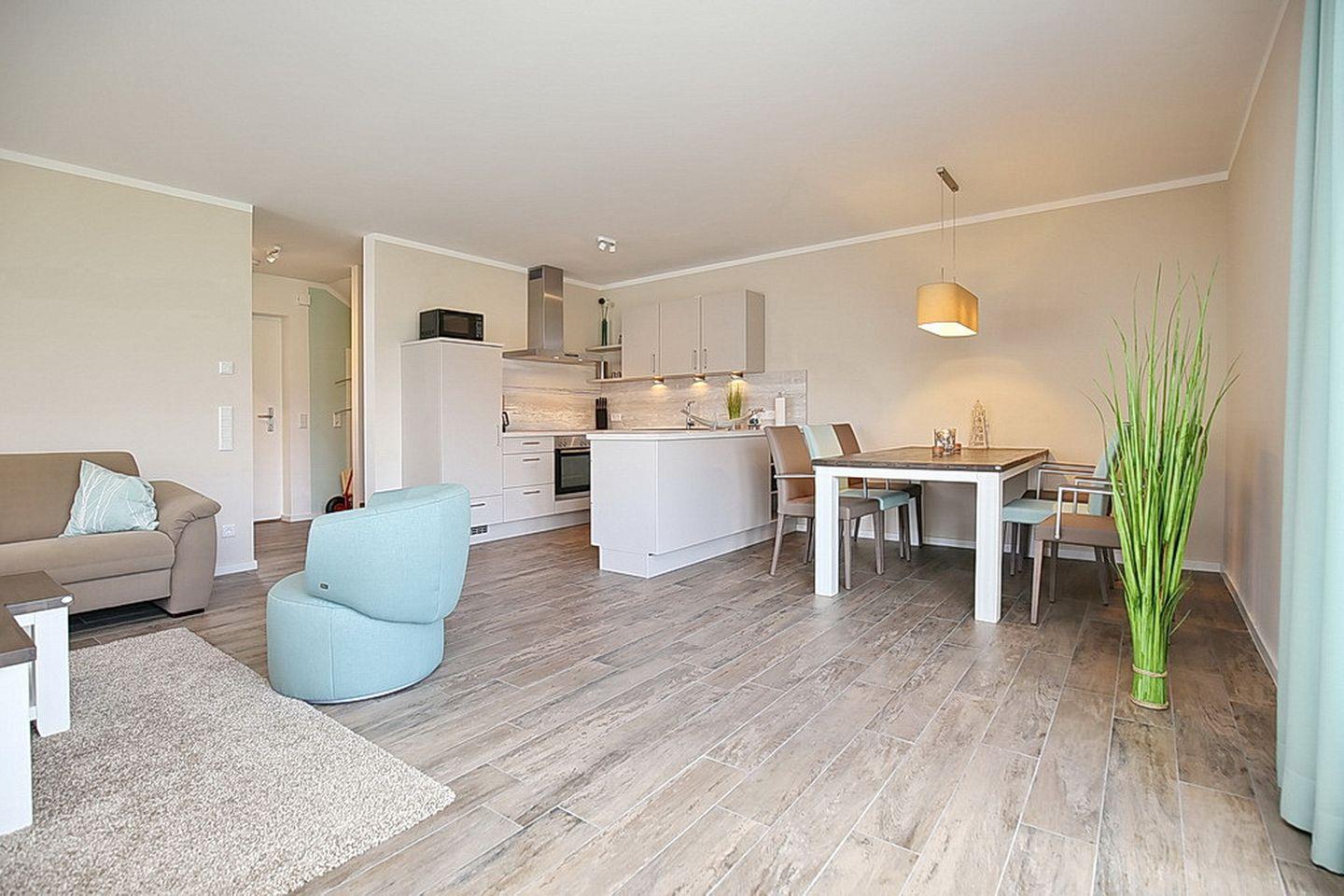 Im Erdgeschoss des Ferienhauses befinden sich der Wohnraum, eine gemütliche Essgruppe, ein Sofa sowie die integrierte Küchenzeile. Auch das Gäste-WC mit bodengleicher Dusche sowie der Eingangsbereich befinden sich hier.