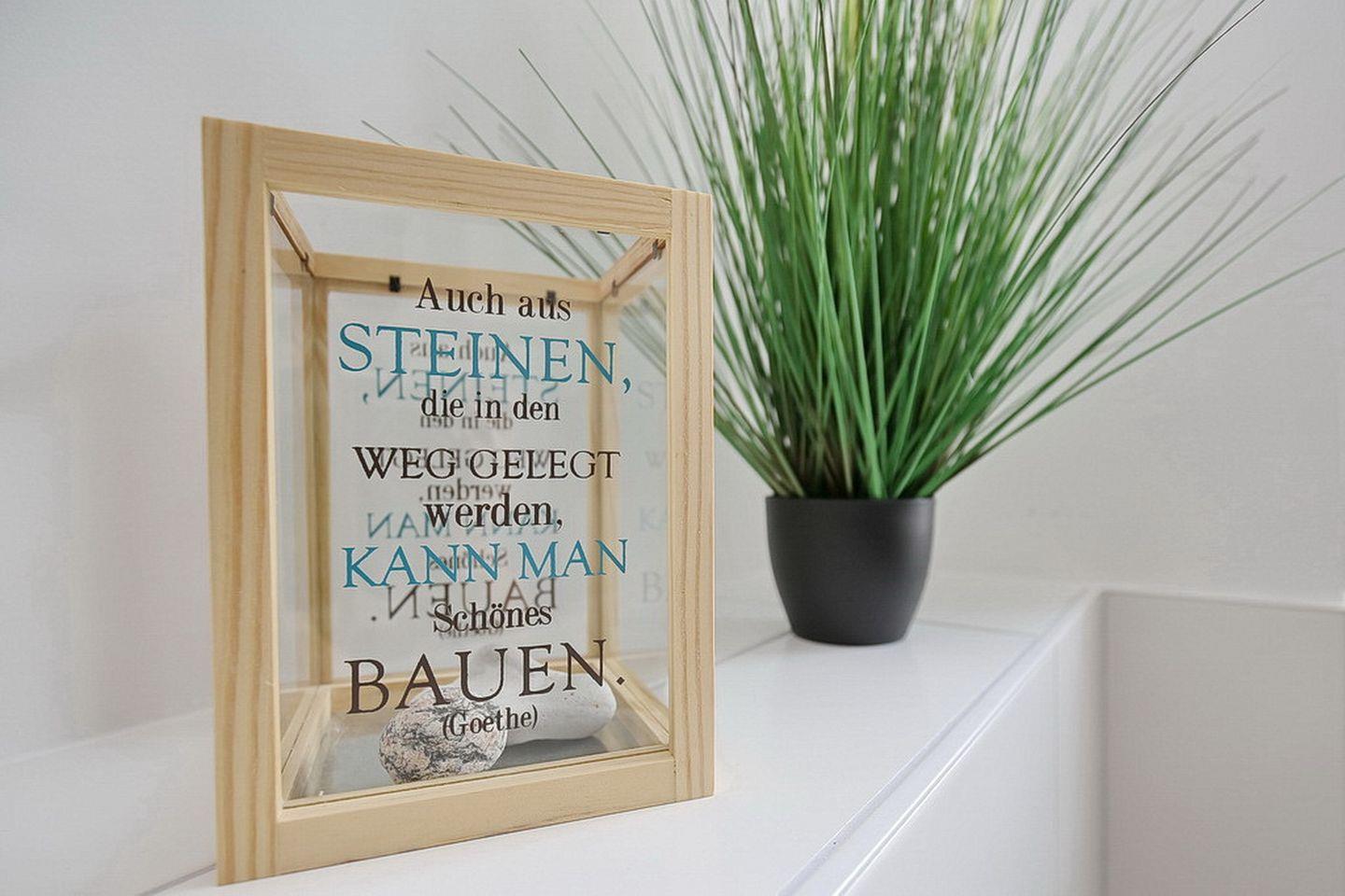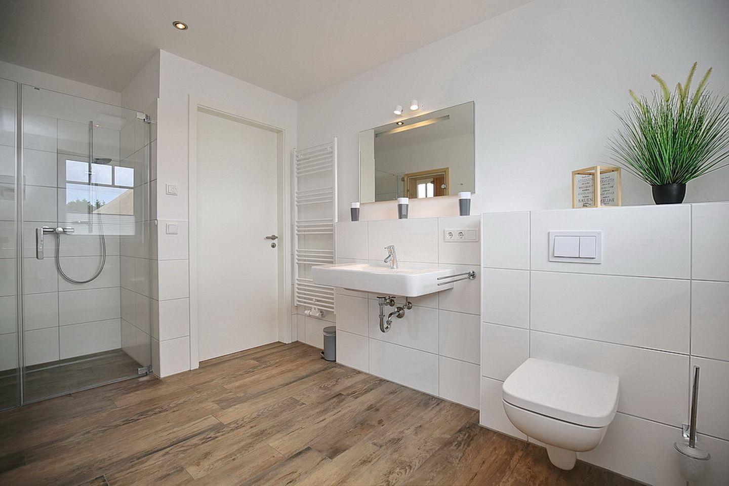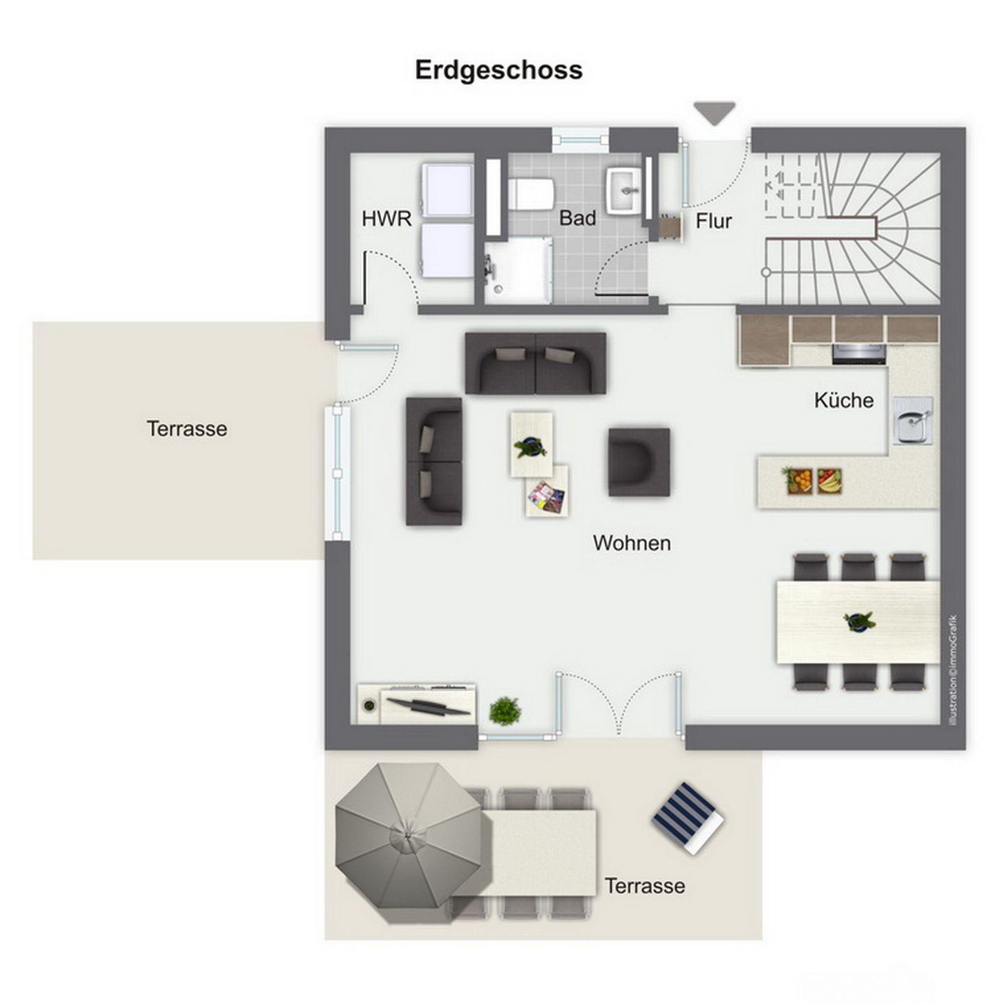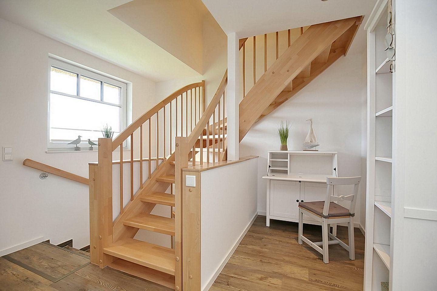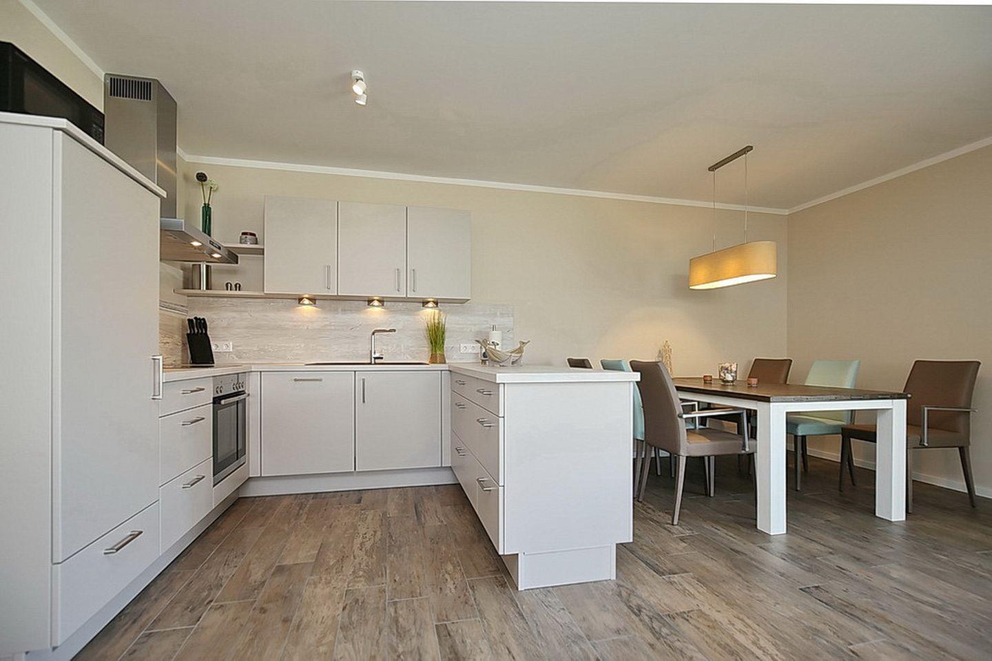 Im Erdgeschoss des Ferienhauses befinden sich der Wohnraum, eine gemütliche Essgruppe, ein Sofa sowie die integrierte Küchenzeile. Auch das Gäste-WC mit bodengleicher Dusche sowie der Eingangsbereich befinden sich hier.