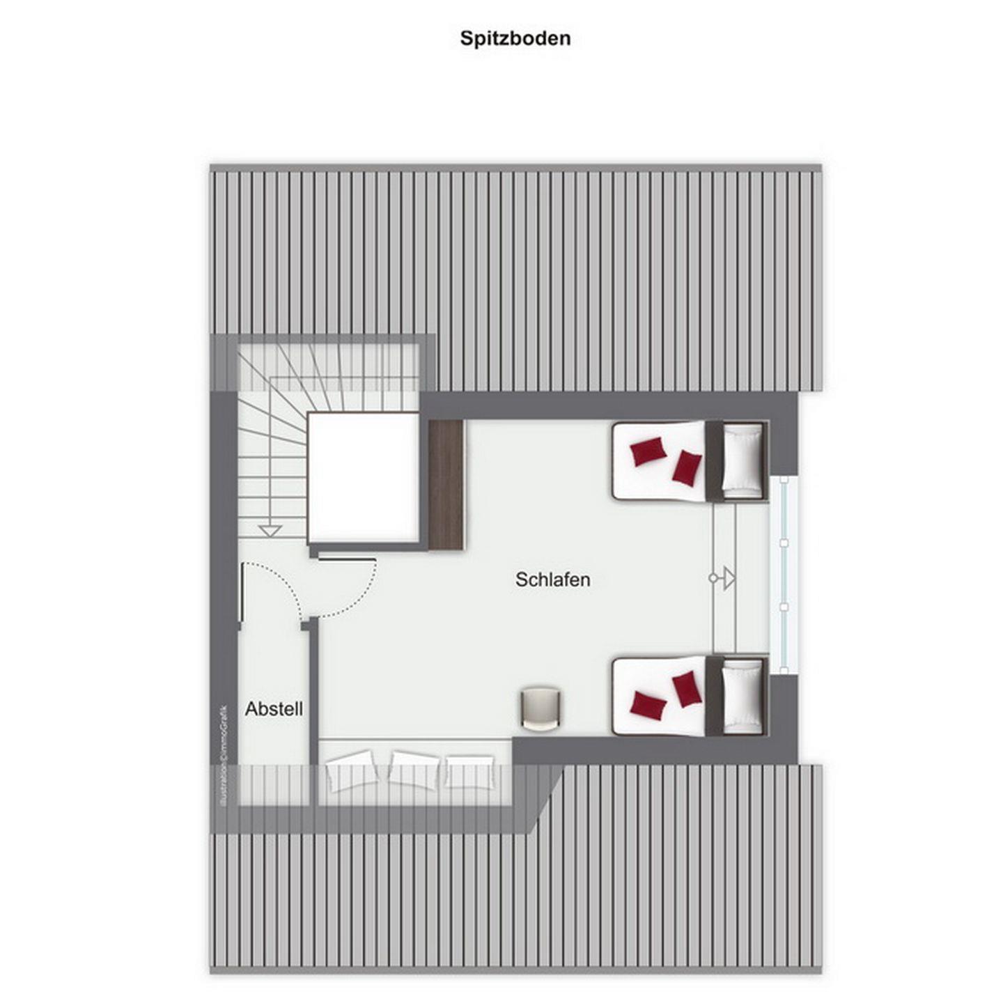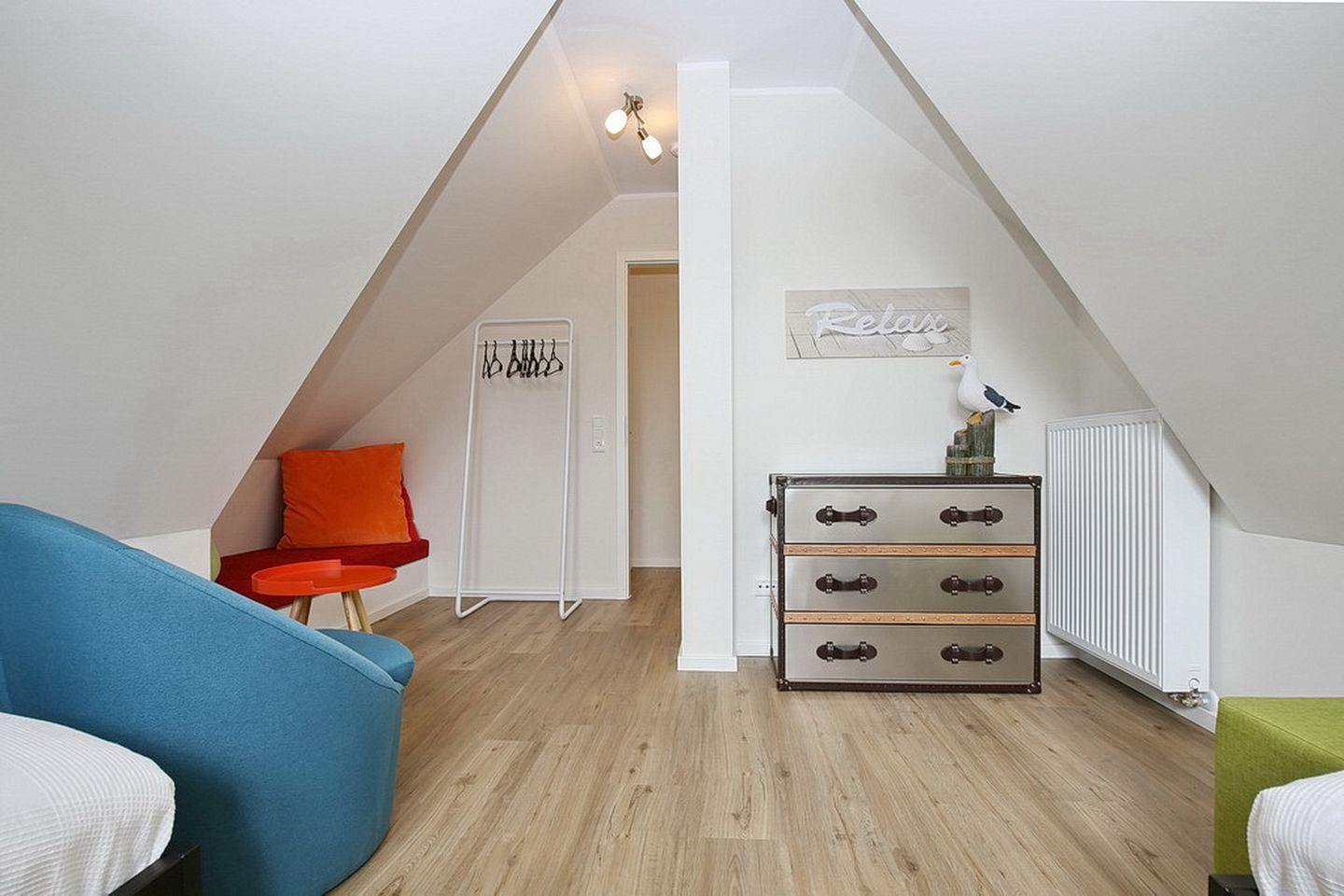 Vom Flur aus kommst du über die Treppe in den Spitzboden, wo sich das dritte Schlafzimmer mit zwei Einzelbetten (90 x 200 cm) und einer Lounge - Matratze (75 x 190 cm) für einen weiteren, kleinen Schlafgast befinden. Zur weiteren Ausstattung des Ferienhauses gehören eine Waschmaschine, ein Kinderbett und ein Kinderhochstuhl. Das gesamte Haus verfügt über WLAN (ohne Gewähr). In diesem Nichtraucherhaus sind maximal zwei Haustiere erlaubt.