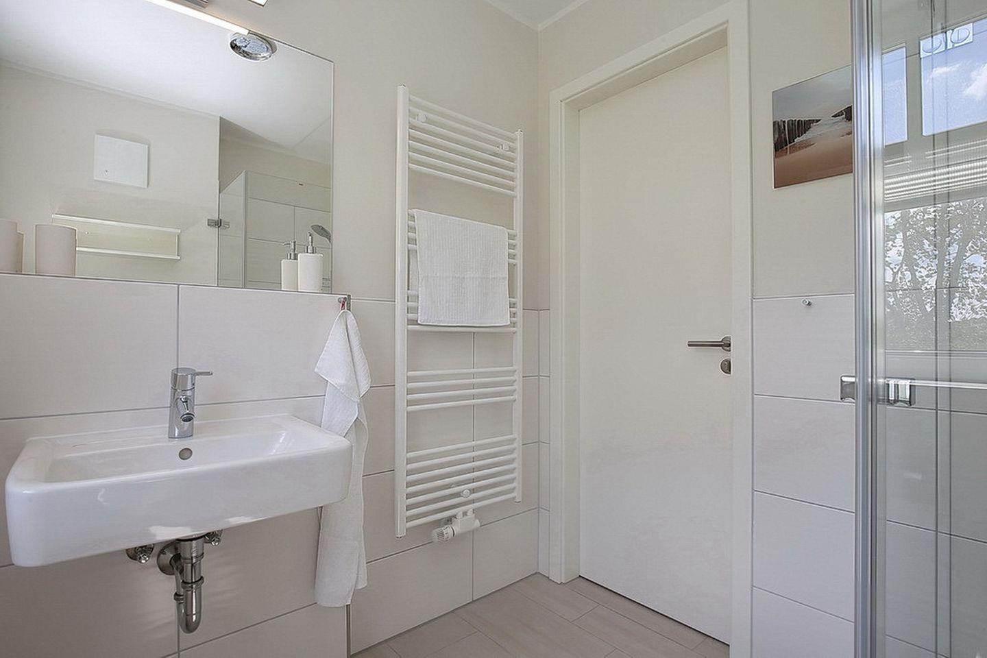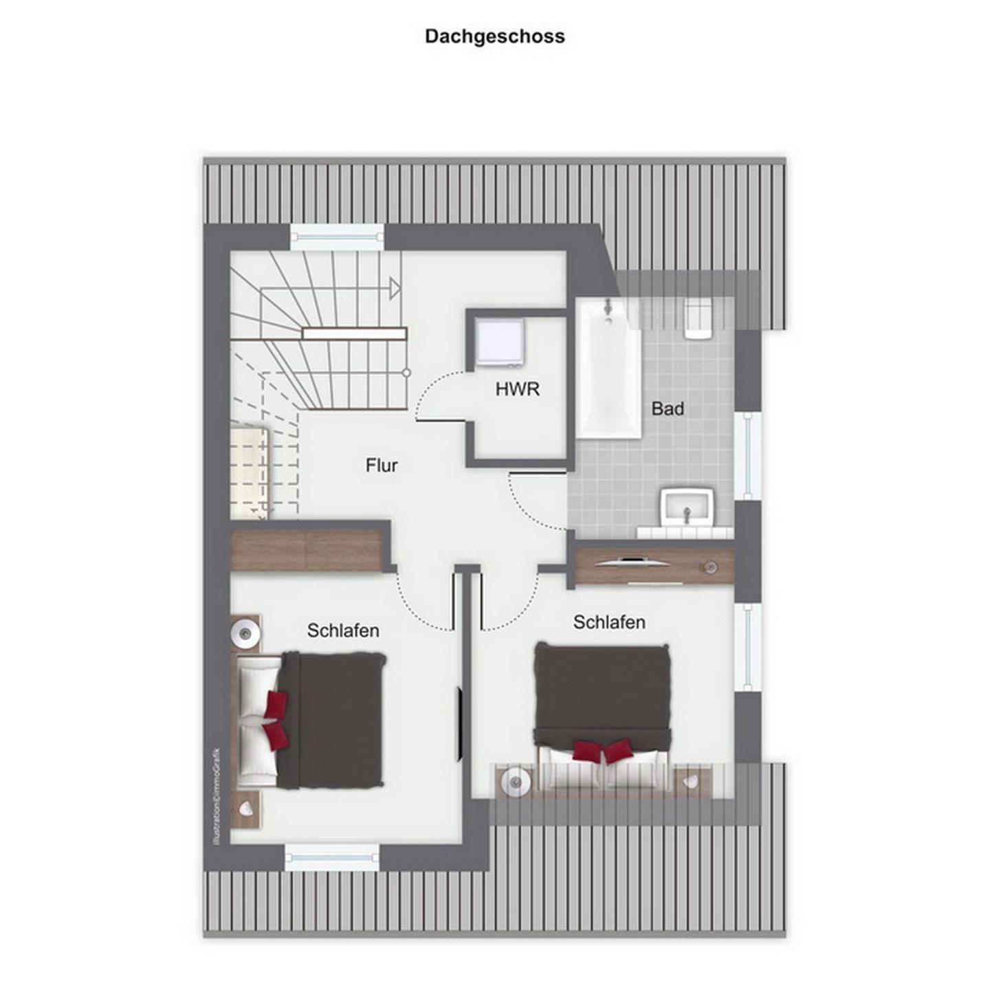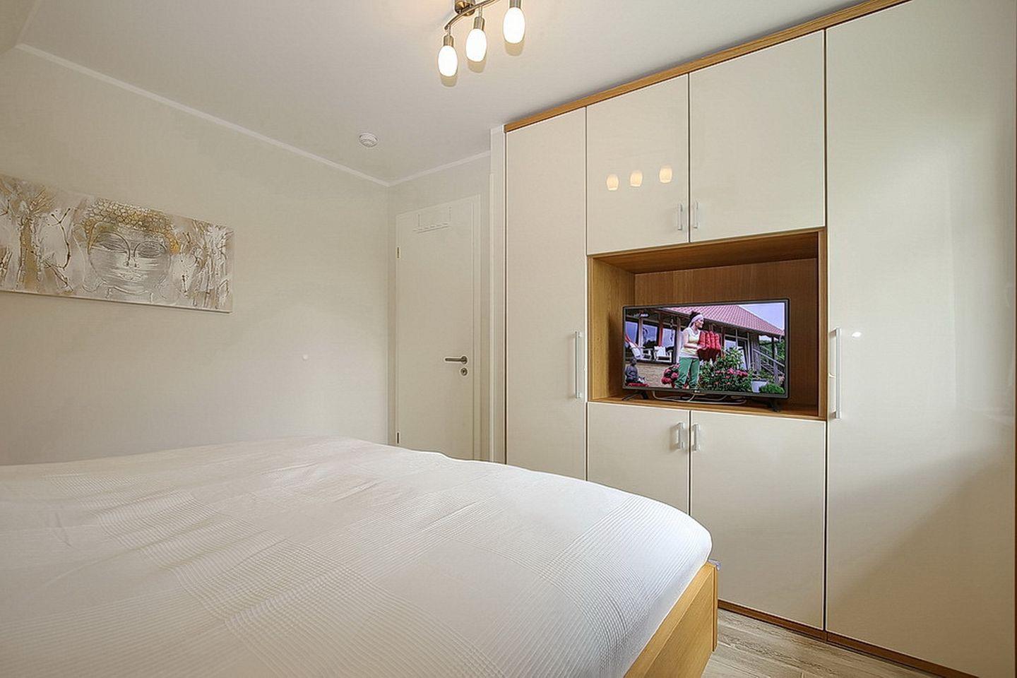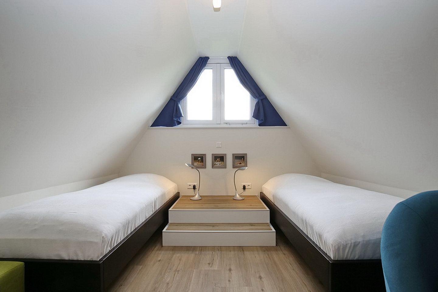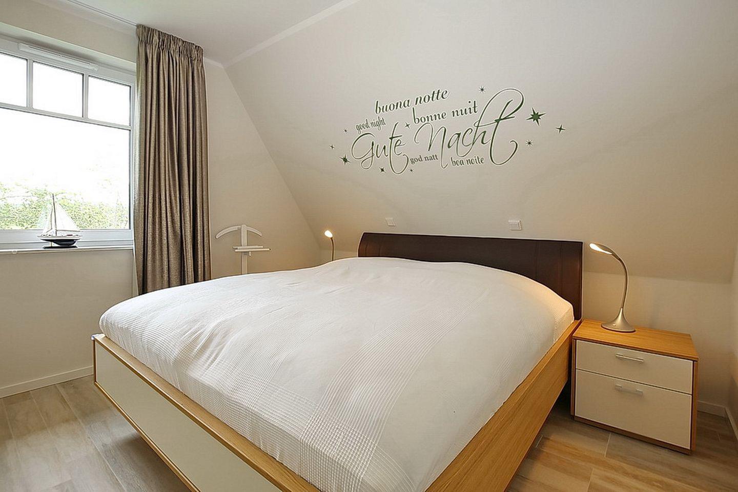 In den zwei Schlafzimmern im Dachgeschoss schläfst du im komfortablen Boxspringbett mit durchgängigem Topper (1 x 180 x 200 cm) und im Doppelbett mit zwei einzelnen Matratzen (2 x 90 x 200 cm). Jeweils ein Flachbild-TV sowie Schränke mit ausreichend Platz für deine Urlaubsgarderobe stehen hier zur Verfügung. Neben den Schlafzimmern liegt auf der gleichen Etage ein Bad mit Badewanne.