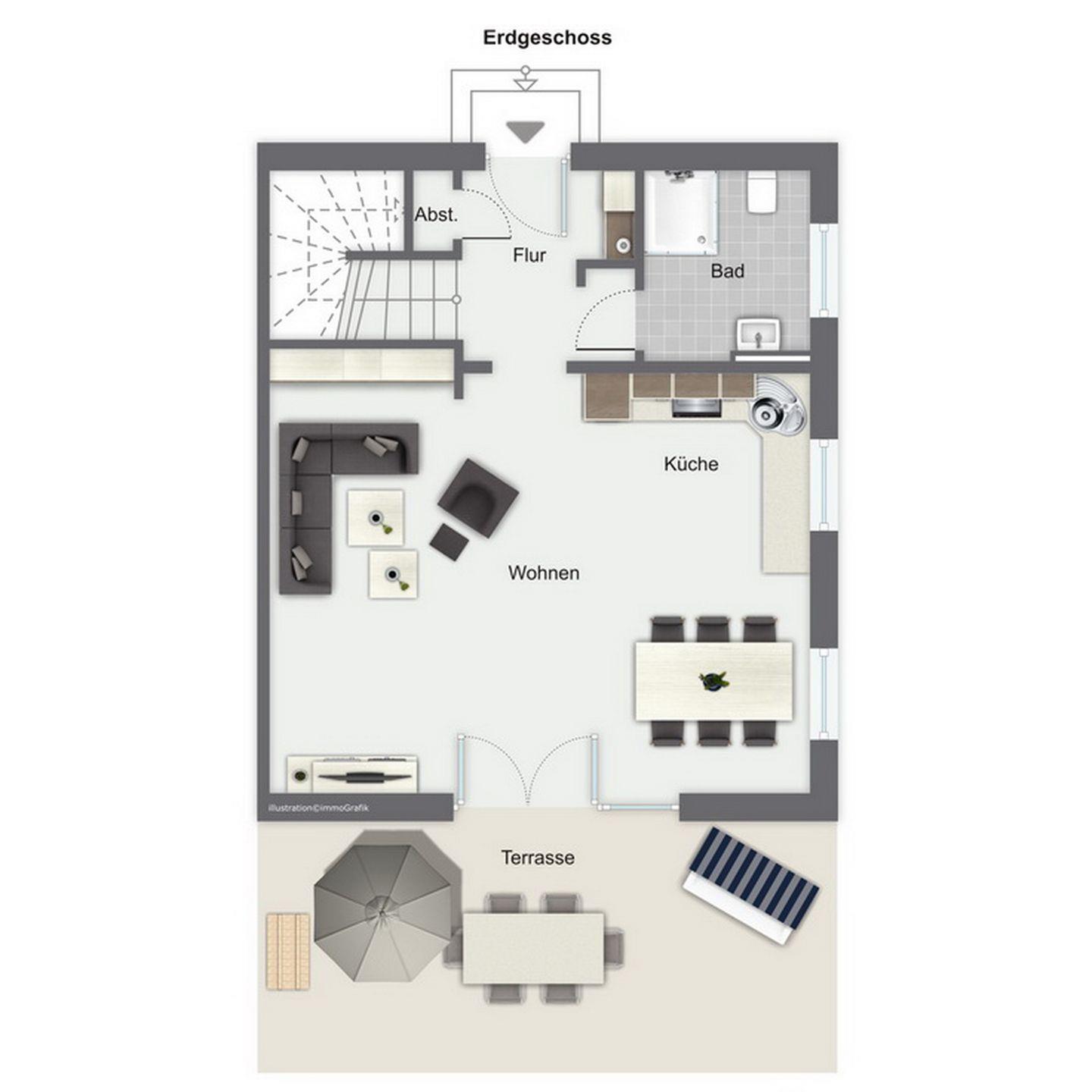 Für deine Unterhaltung im Haus stehen dir ein Flachbild-TV und eine Stereoanlage zur Verfügung. In der modernen Küchenzeile findest du Geschirrspüler, 4-Platten-Ceranherd mit Backofen und Kühlschrank mit Gefrierfach vor. Die möblierte Süd-West Terrasse erreichst du direkt vom Wohnzimmer aus.