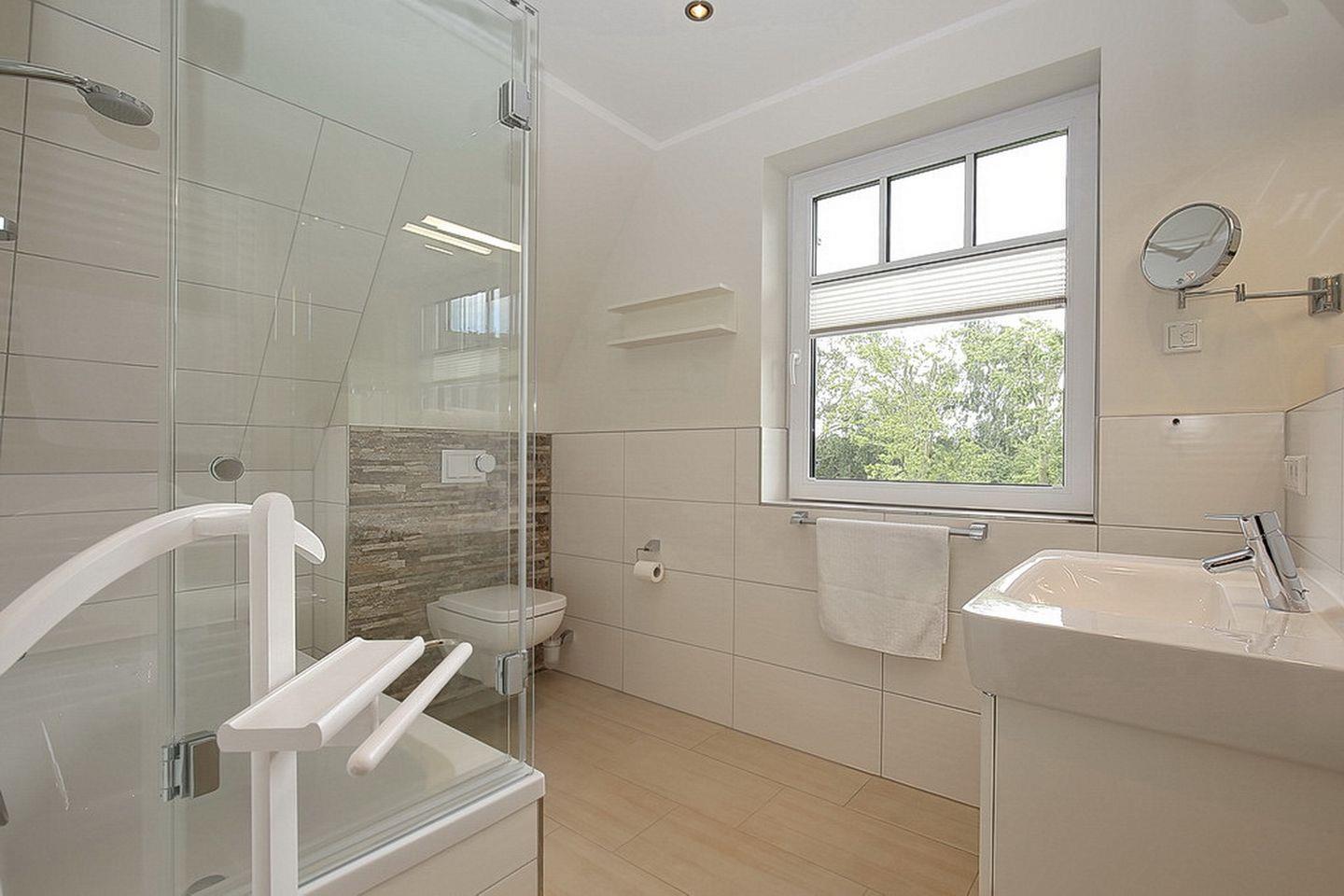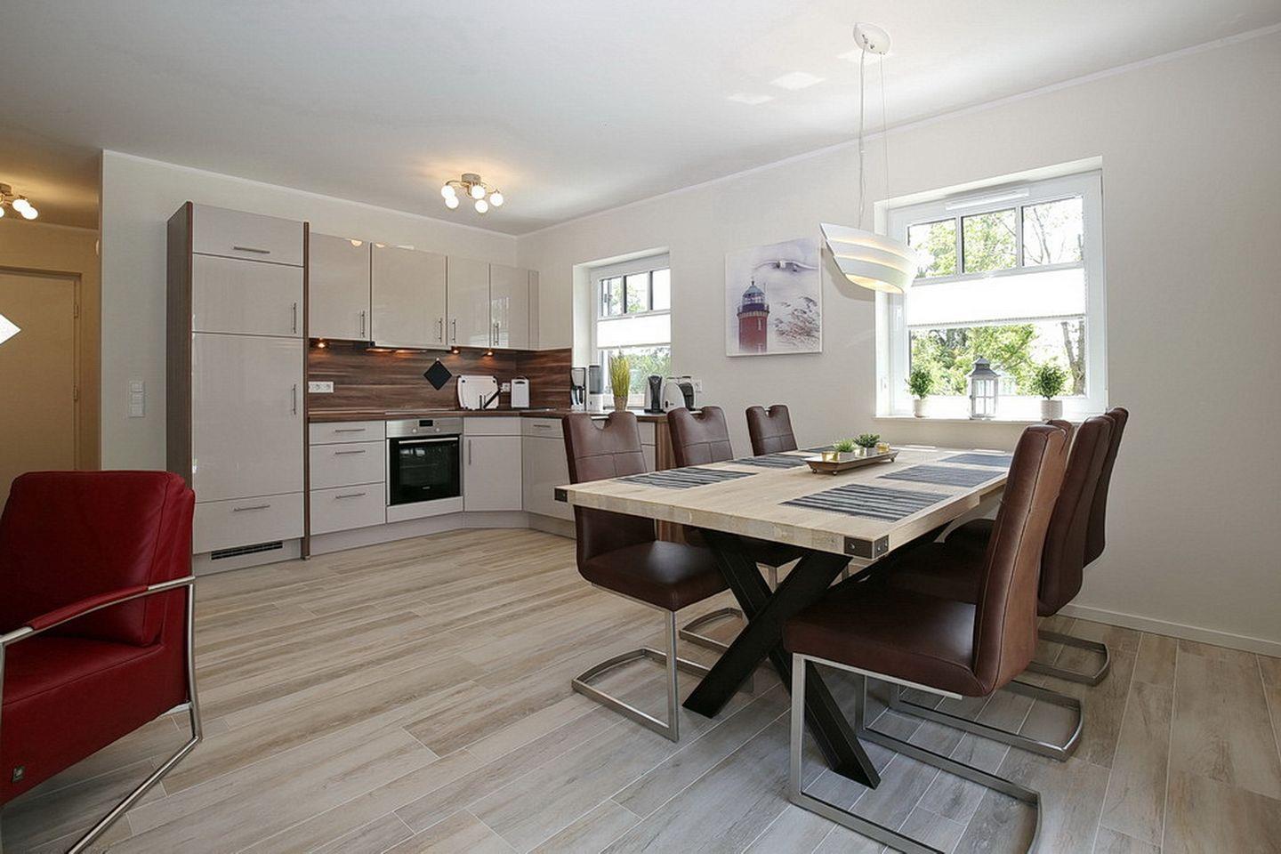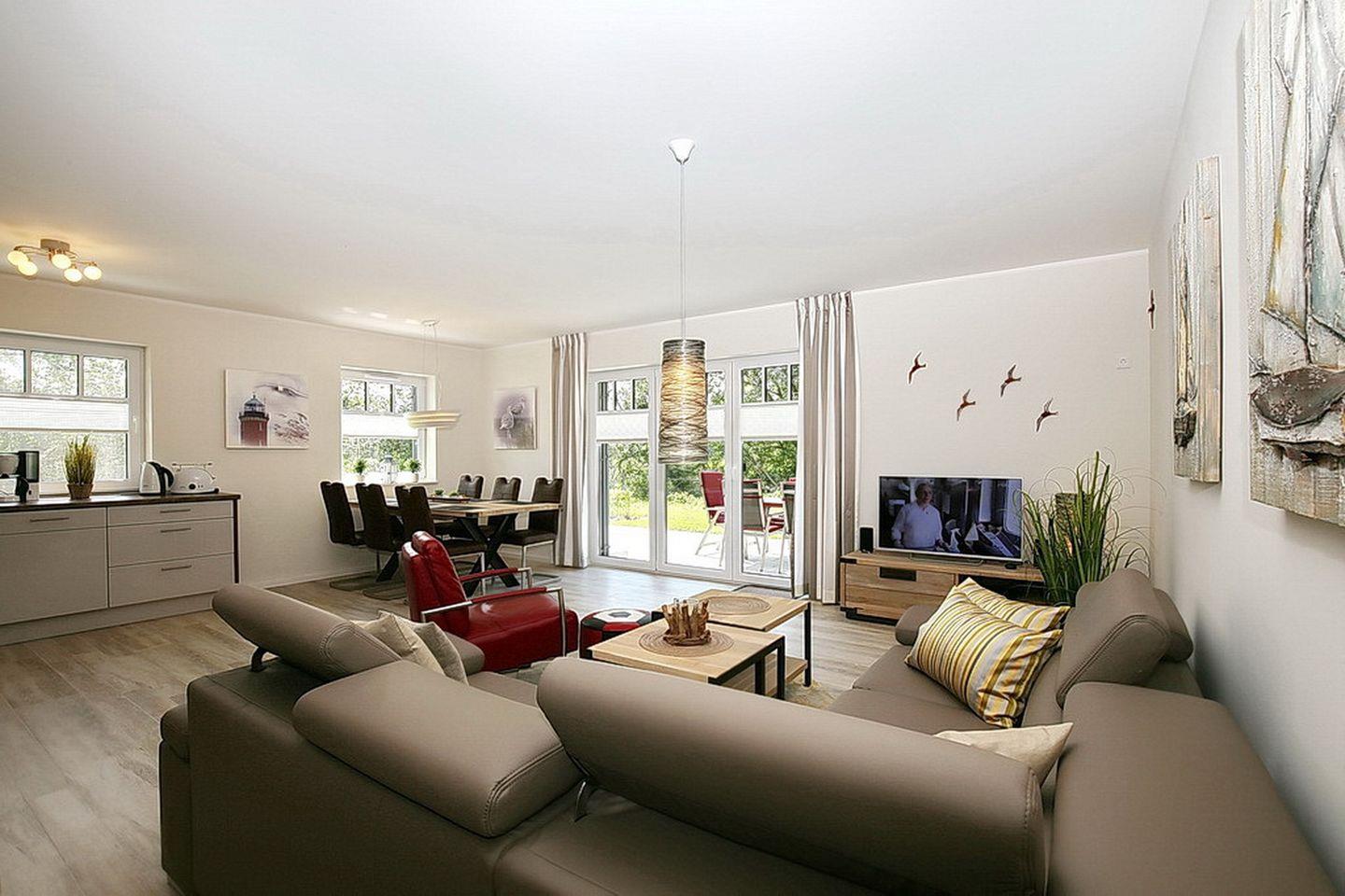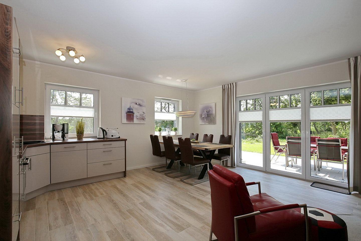 Im Erdgeschoss des Ferienhauses befinden sich der kombinierte Wohn-Essbereich mit offener, moderner Küchenzeile. Nimm Platz auf der Leder-Eckcouch und genieße dein Frühstück am modernen Esstisch mit Lederstühlen. Ebenfalls im Erdgeschoss befindet sich das Gäste-Bad mit bodengleicher Dusche.