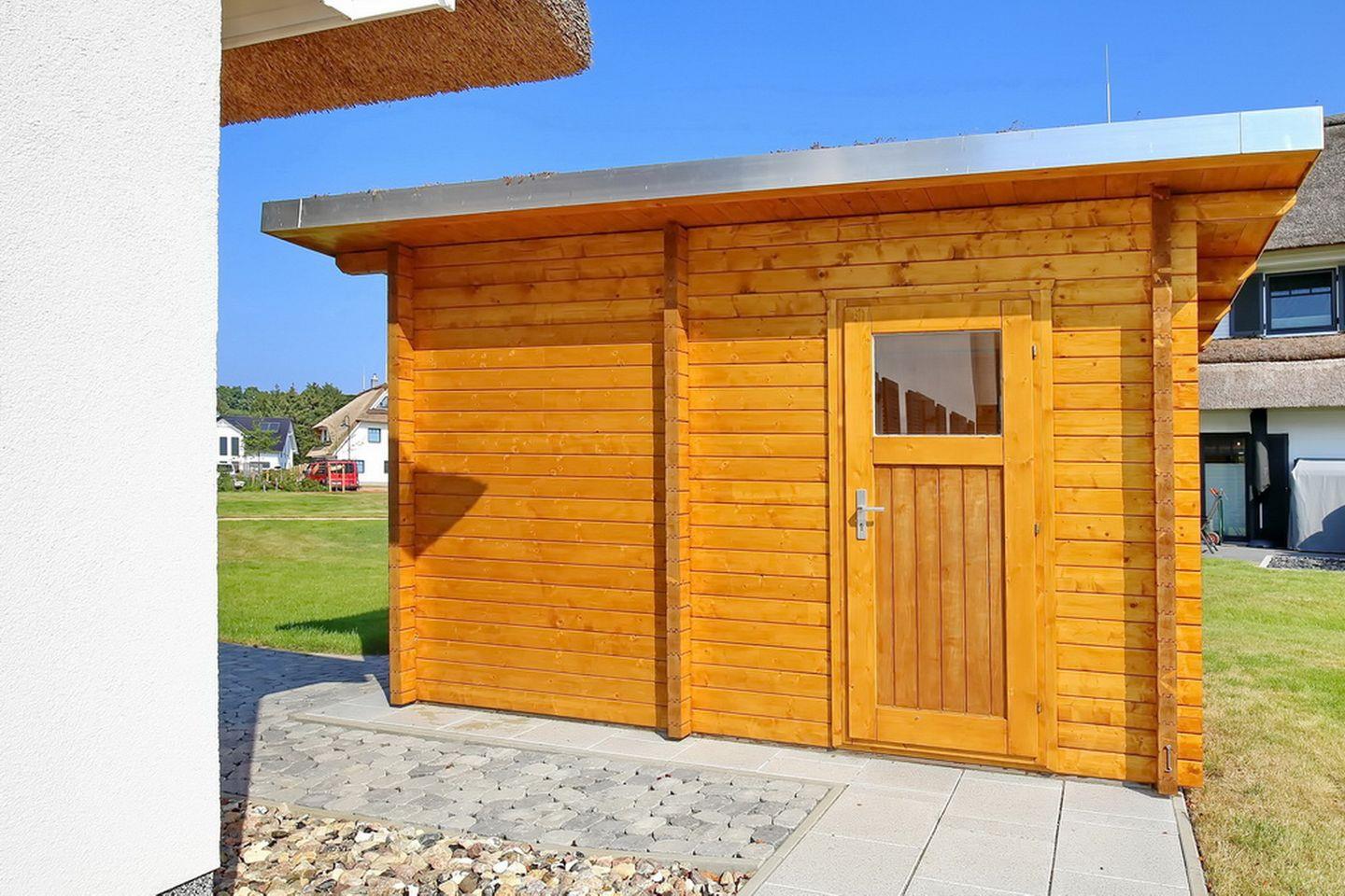 Das Ferienresort am Mariannenweg liegt in verkehrsberuhigter Lage in zweiter Reihe. Zum Strand sind es nur ca. 400 m. Direkt an der Einfahrt des Resorts liegt der Parkplatz mit einer Schranke, so dass nur die Gäste des Ferienhausgebietes hier Zugang haben. Diesem Ferienhaus sind 2 PKW-Stellplätze zugeordnet. Weitere Autos kannst du auf dem nahegelegenen öffentlichen Parkplatz gegen Gebühr abstellen. Der Schuppen, um mitgebrachte Fahrräder abstellen zu können, befindet sich direkt am Haus.