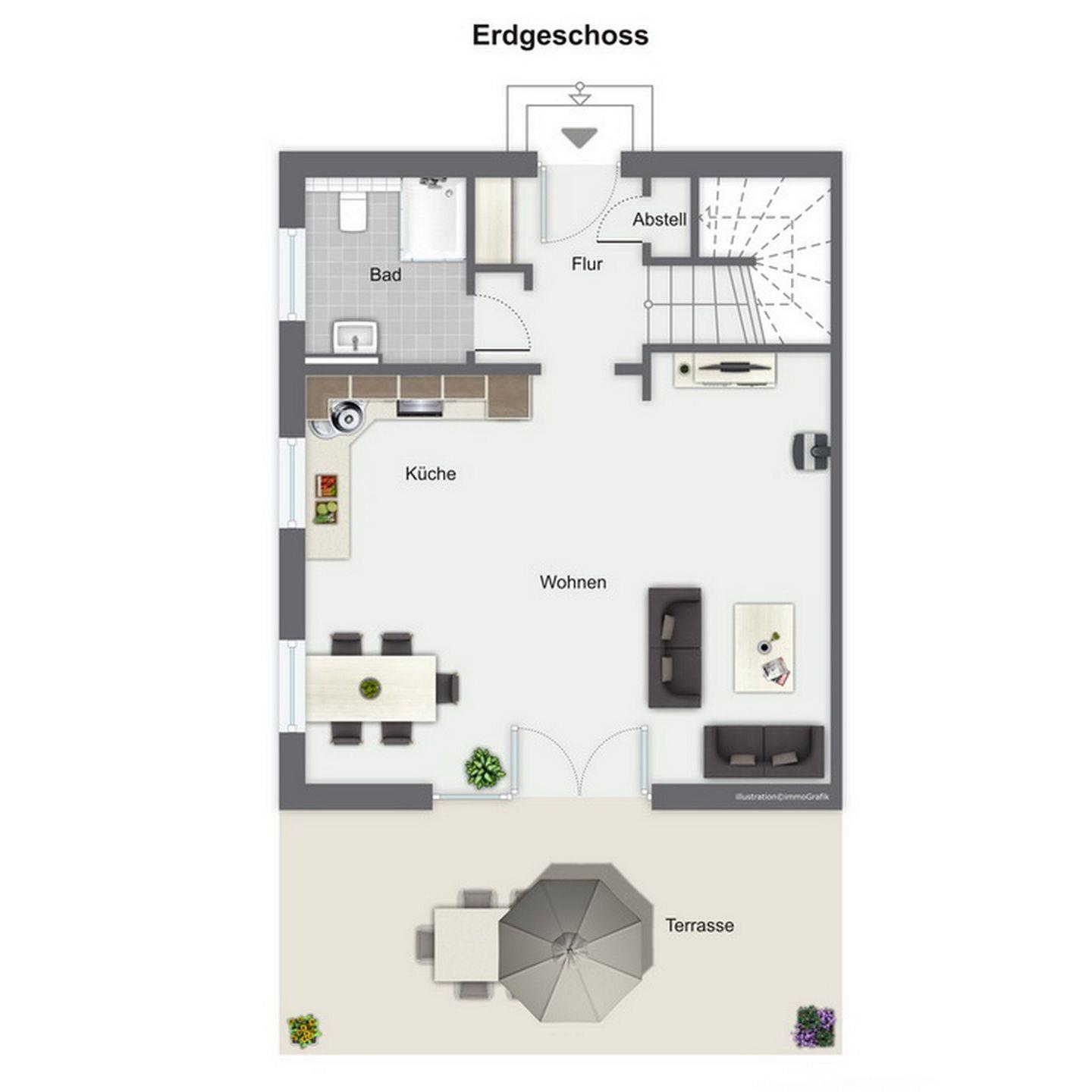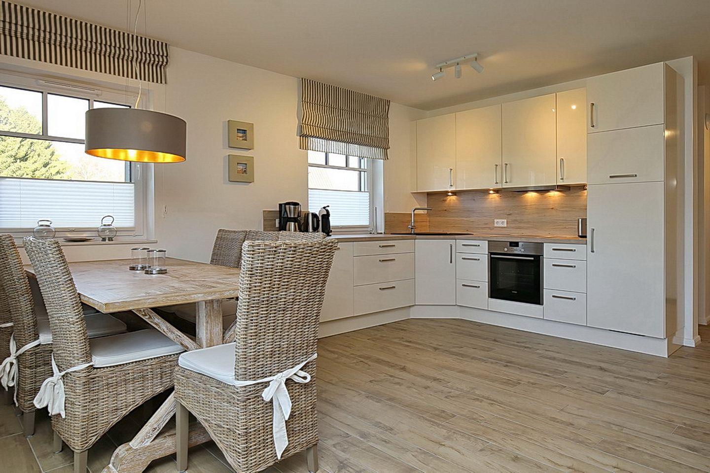 Im Erdgeschoss des Ferienhauses befinden sich im Wohnraum ein gemütlicher Essbereich sowie die integrierte Küchenzeile. Die moderne Kücheneinrichtung bietet den Herd mit Backofen und 4- Platten- Induktionskochfeld, Geschirrspüler, Kühlschrank mit Gefrierfach und eine Mikrowelle.