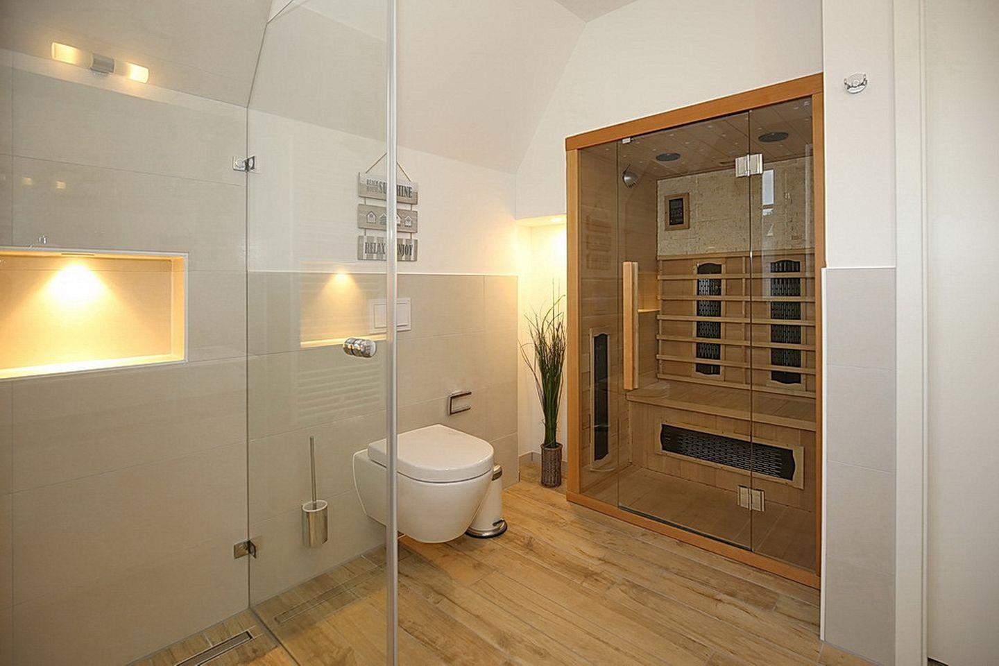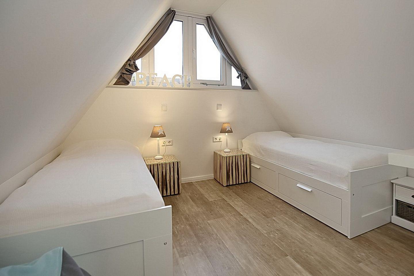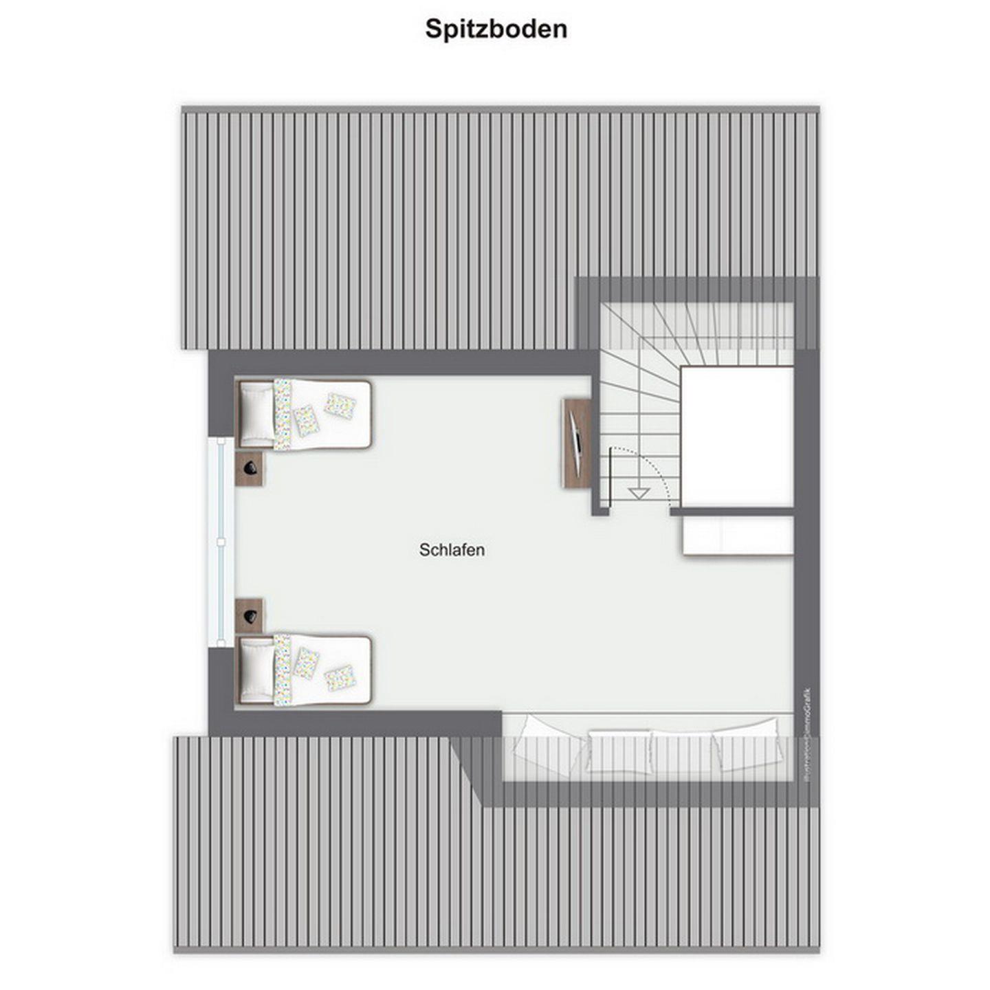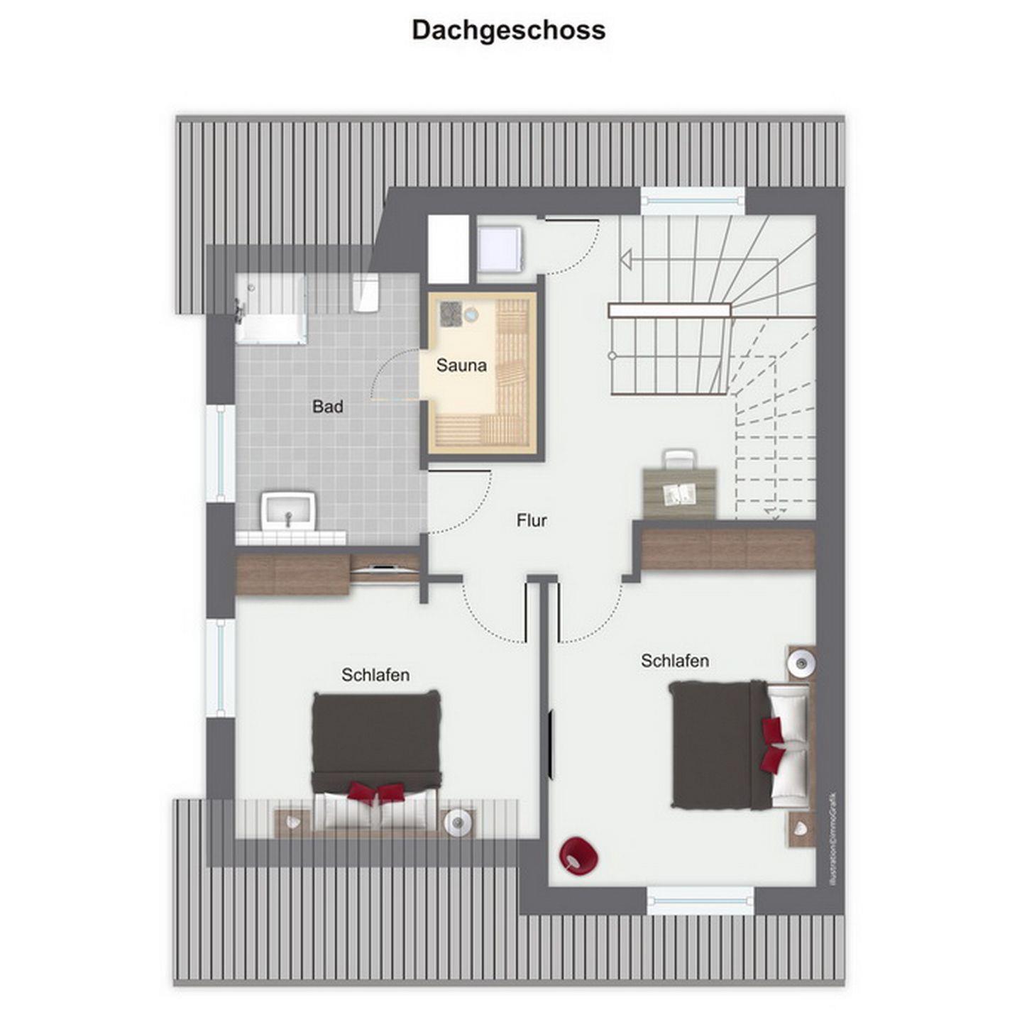 Im Dachgeschoss befinden sich zwei Schlafzimmer. Diese sind mit einem Boxspringbett (2 x 90 x 200 cm) bzw. zwei Einzelboxspringbetten (90 x 200 cm) und Fliegengitter ausgestattet. Weiter verfügt das Dachgeschoss über eine kleine Infrarotsauna mit Farbtherapie, eine Waschmaschine und einen Trockner. Im Spitzboden findest du das dritte Schlafzimmer mit zwei Einzelbetten (90 x 200 cm).