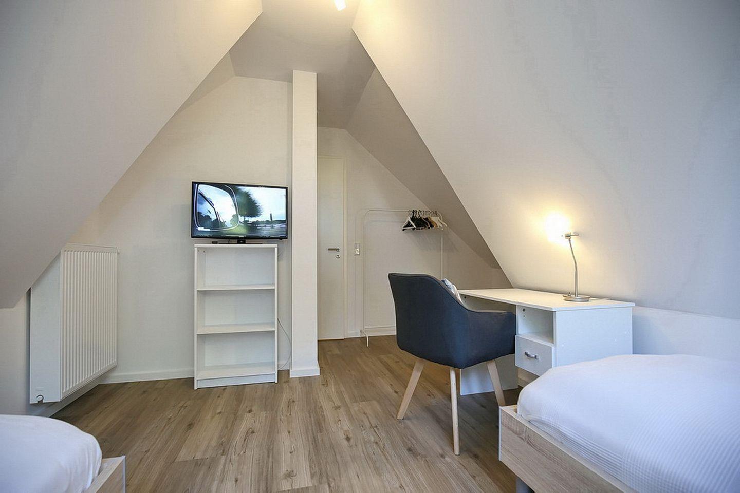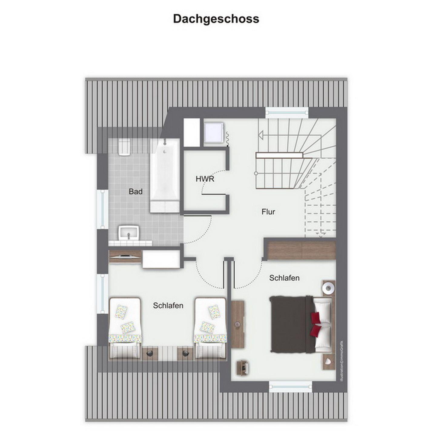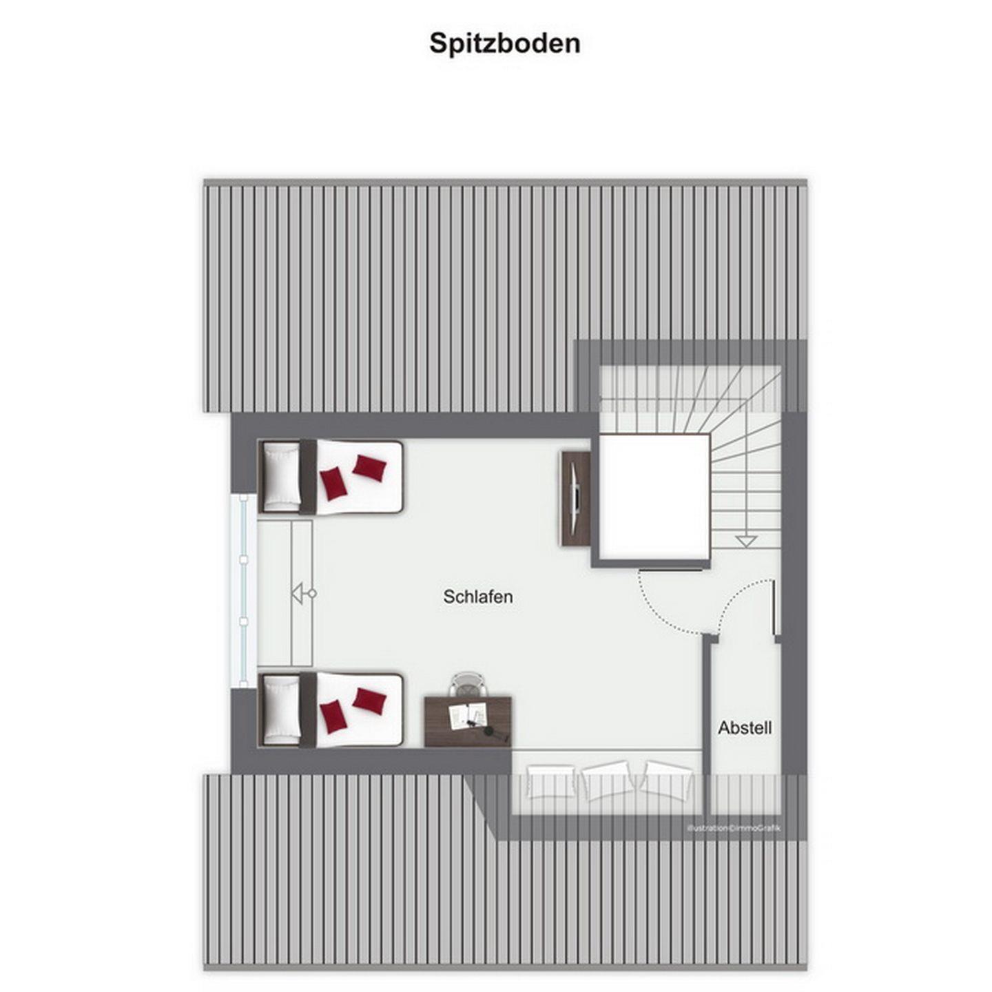 Im Spitzboden befindet sich ein weiteres Schlafzimmer, welches über zwei Einzelbetten (90 x 200 cm) und zusätzlich über einen weiteren Fernseher verfügt. Zur weiteren Ausstattung des Ferienhauses gehören ein Gemeinschaftsschuppen, eine Waschmaschine und ein Trockner sowie ein Kinderreisebett, ein Hochstuhl und ein Bollerwagen (ohne Gewähr) für die kleinen Gäste. Das gesamte Haus verfügt über WLAN (ohne Gewähr). In diesem Nichtraucherhaus sind Haustiere nicht erlaubt.