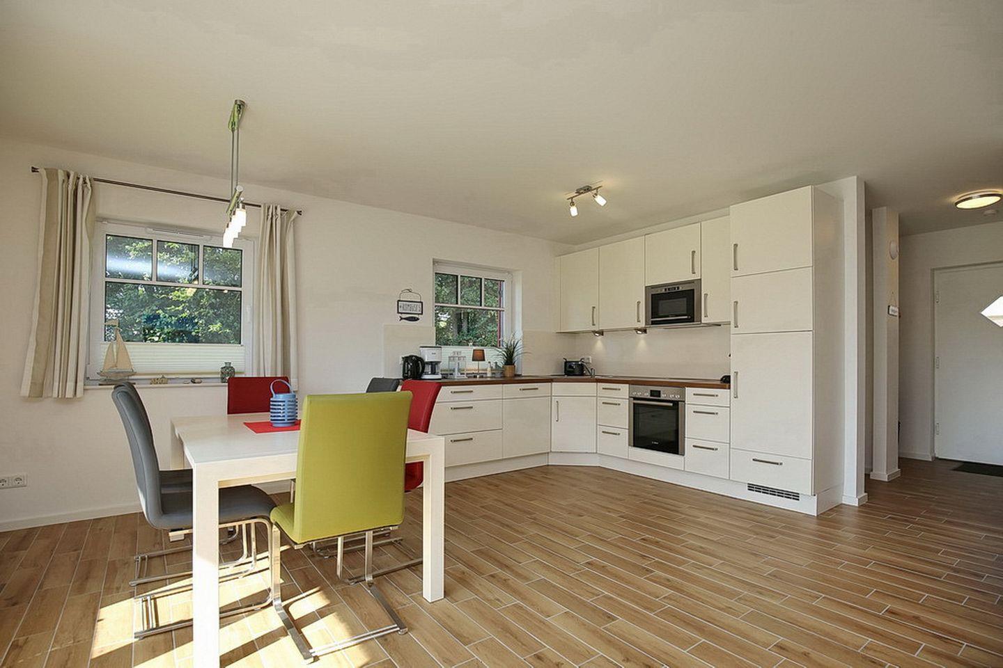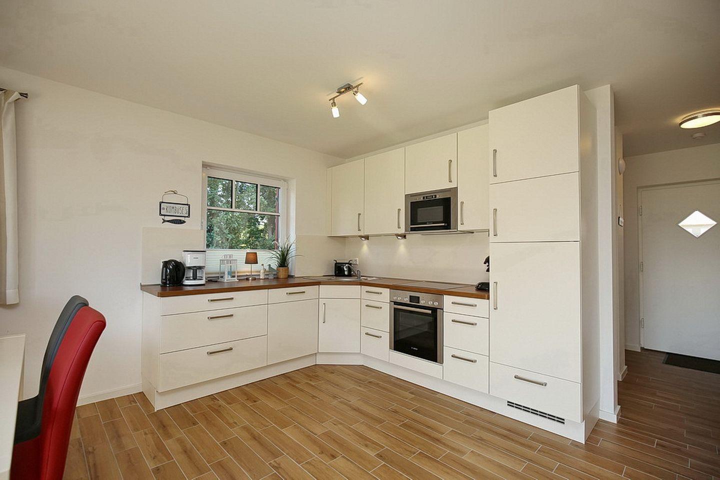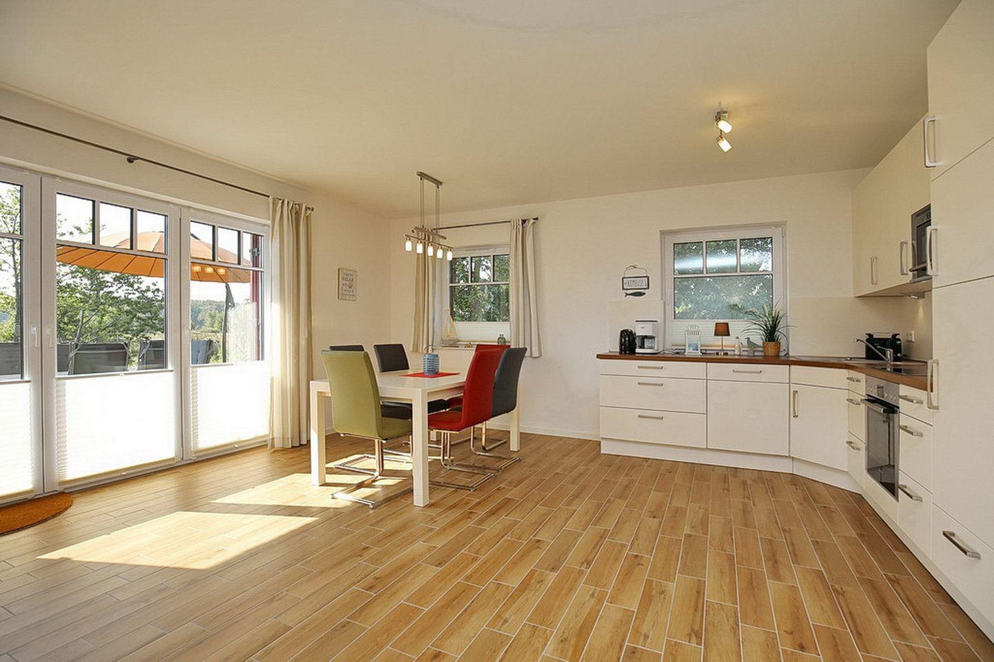 Im Erdgeschoss des Ferienhauses befinden sich der großzügige Wohnraum mit gemütlicher Essgruppe, sowie die integrierte Küchenzeile. In der modernen Küchenzeile findest du Geschirrspüler, Mikrowelle, Ceranherd mit Backofen, Kühlschrank mit Gefrierfach vor.