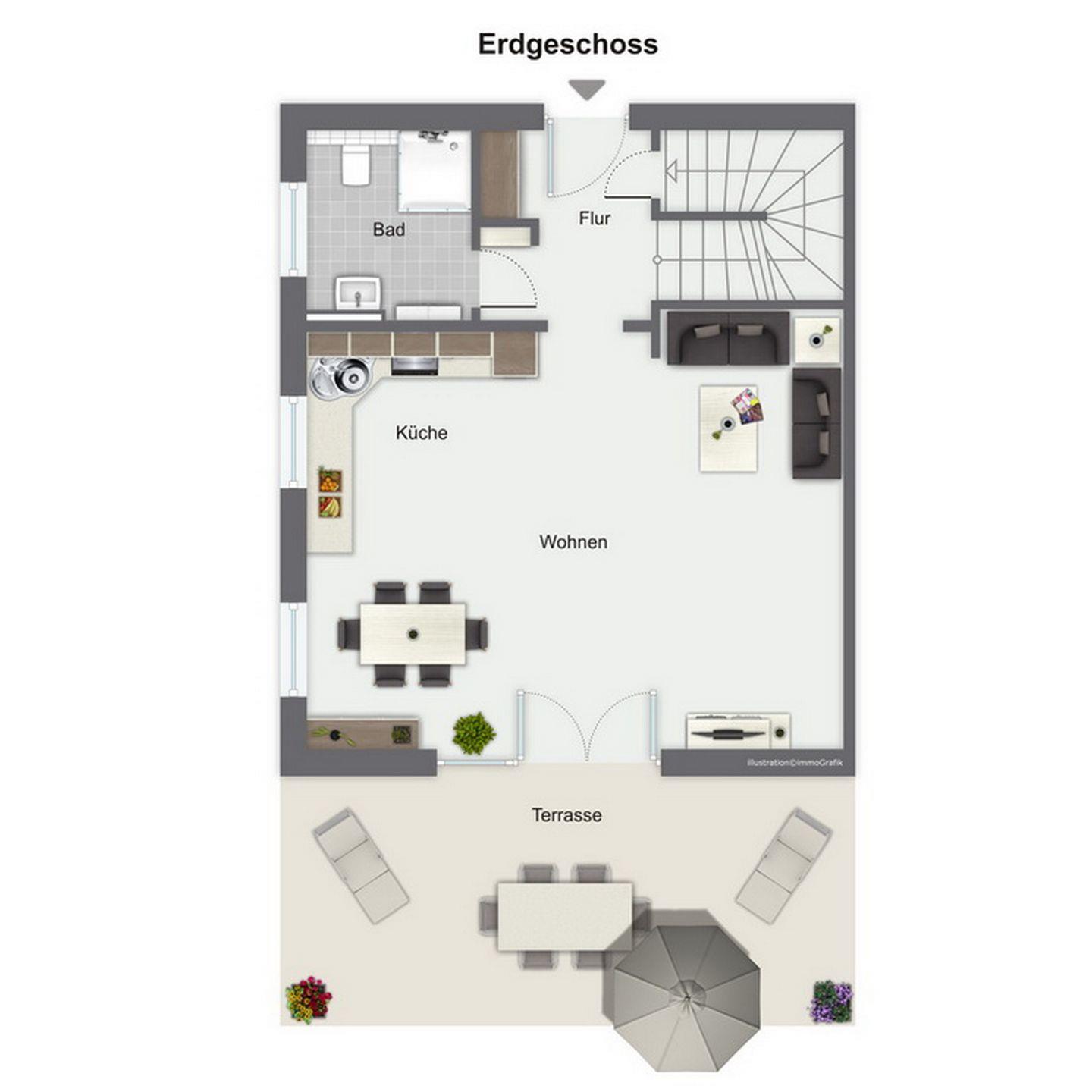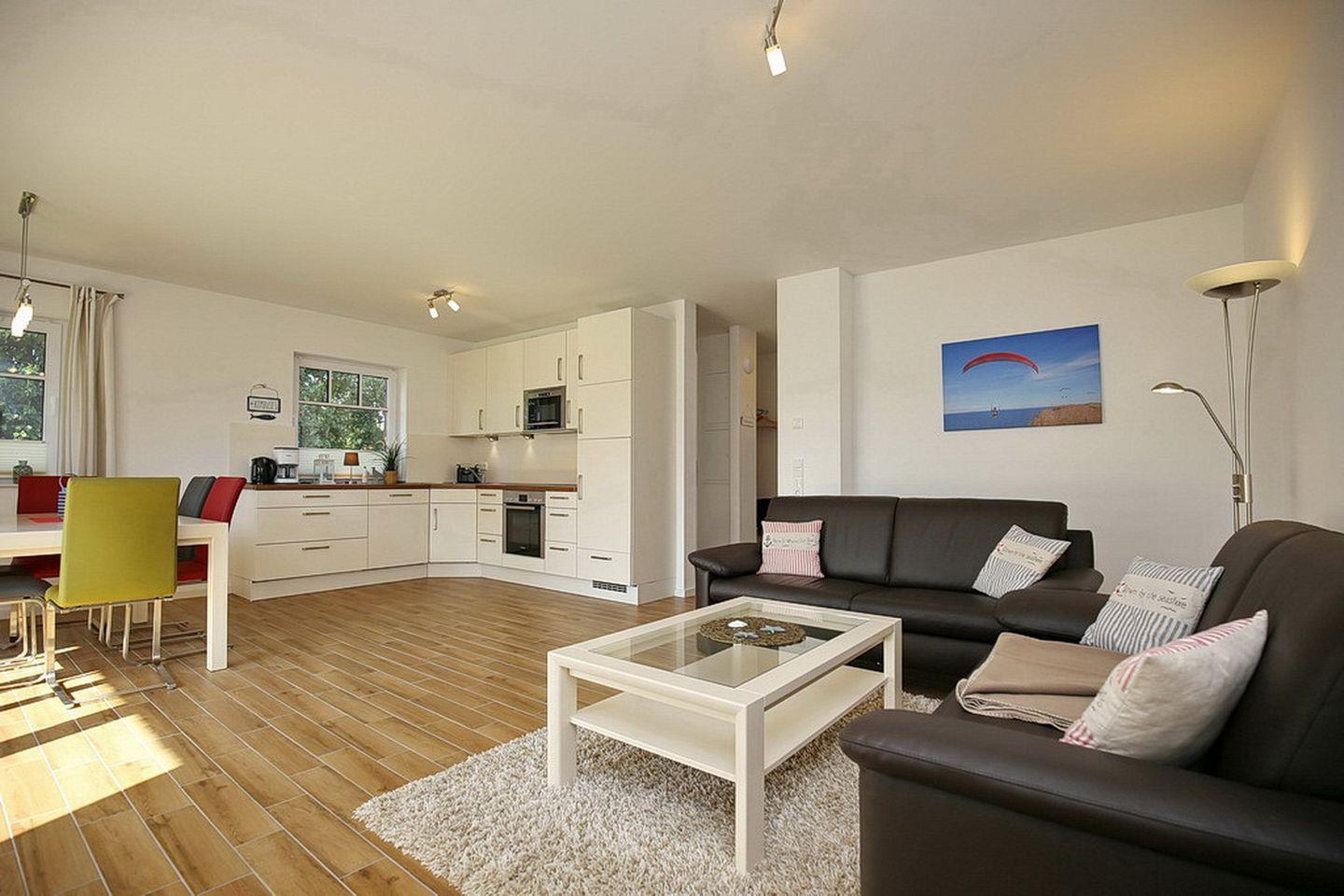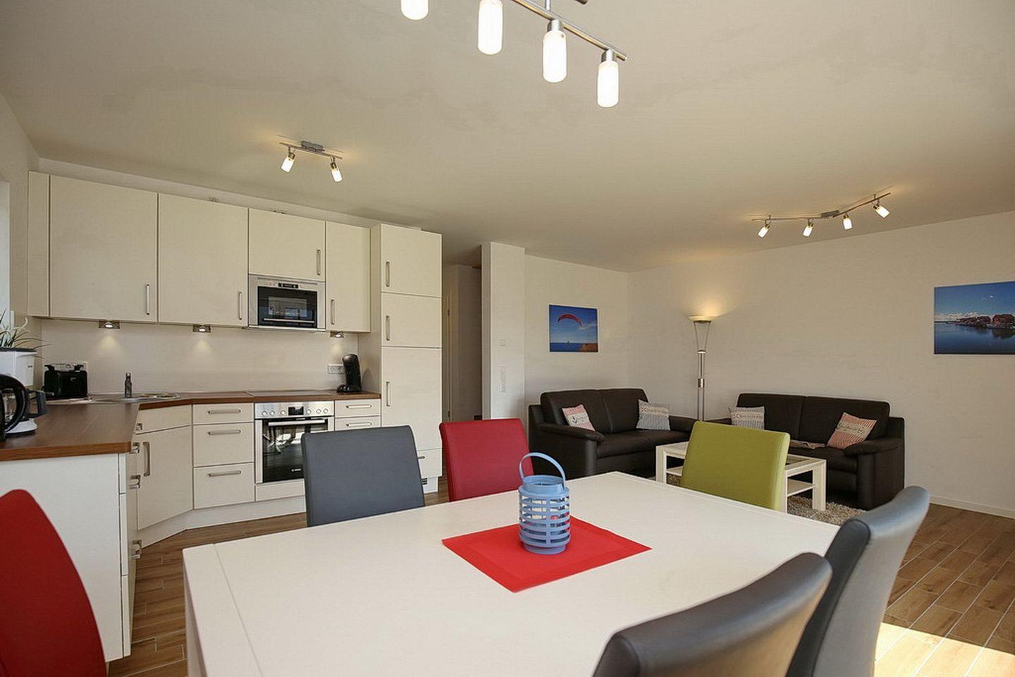 Im Erdgeschoss des Ferienhauses befinden sich der großzügige Wohnraum mit gemütlicher Essgruppe, sowie die integrierte Küchenzeile. In der modernen Küchenzeile findest du Geschirrspüler, Mikrowelle, Ceranherd mit Backofen, Kühlschrank mit Gefrierfach vor.