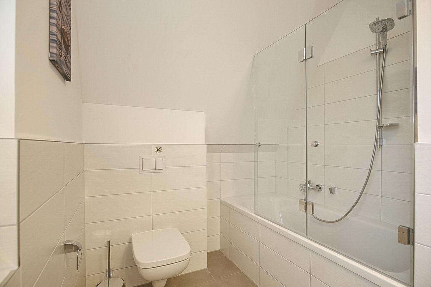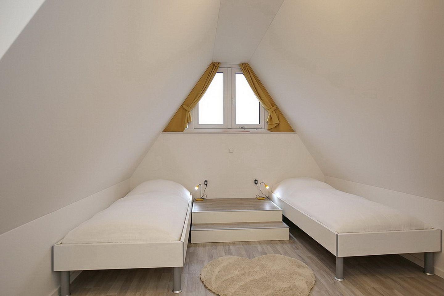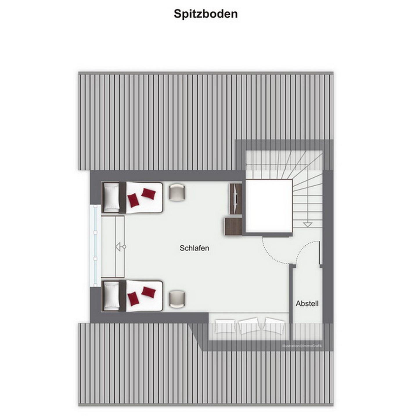 In den Schlafzimmern im Dachgeschoss stehen dir zwei Doppelbetten (2 x 90 x 200 cm) sowie Kleiderschränke mit ausreichend Platz zur Verfügung. In einem der beiden Schlafzimmer findest du einen Fernseher vor. Des Weiteren verfügt das Dachgeschoss über ein Bad mit Badewanne und Duschabtrennung sowie den Flur. Zusätzlich bietet dir dieses Haus einen Abstellraum, eine zweite Garderobe und eine Schreibtischecke.
