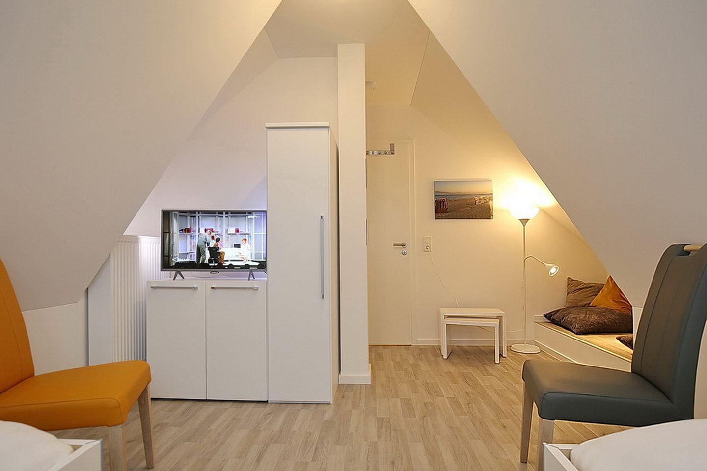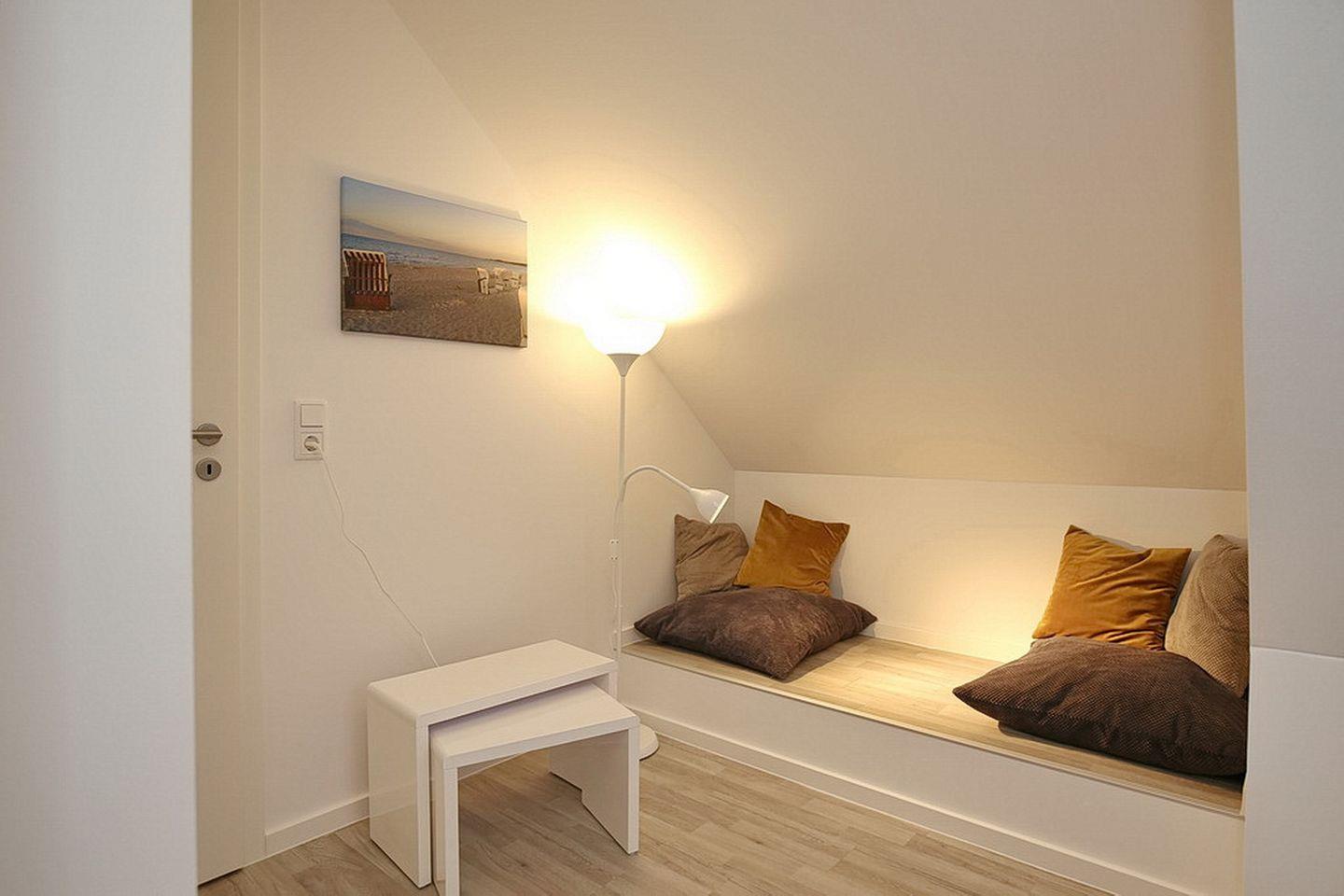 Im Spitzboden befindet sich ein weiteres Schlafzimmer mit zwei Einzelbetten (90 x 200 cm). Das Schlafzimmer ist u.a. mit einem Fernseher ausgestattet. In dieser Nichtraucher-Wohnung sind Haustiere nicht erlaubt. Ein integrierter Waschtrockner und ein Elektrogrill sind vorhanden, ebenso ein Kinderreisebett und ein Kinderhochstuhl für unsere kleinen Gäste. Ein Bollerwagen (ohne Gewähr) kann genutzt werden. Ein Fahrradständer befindet sich direkt vor dem Haus. WLAN (ohne Gewähr) steht dir kostenlos zur Verfügung. Das Ferienhaus verfügt im Wohnzimmer und den Schlafzimmern im 1. Obergeschoss über einen Insektenschutz.