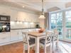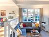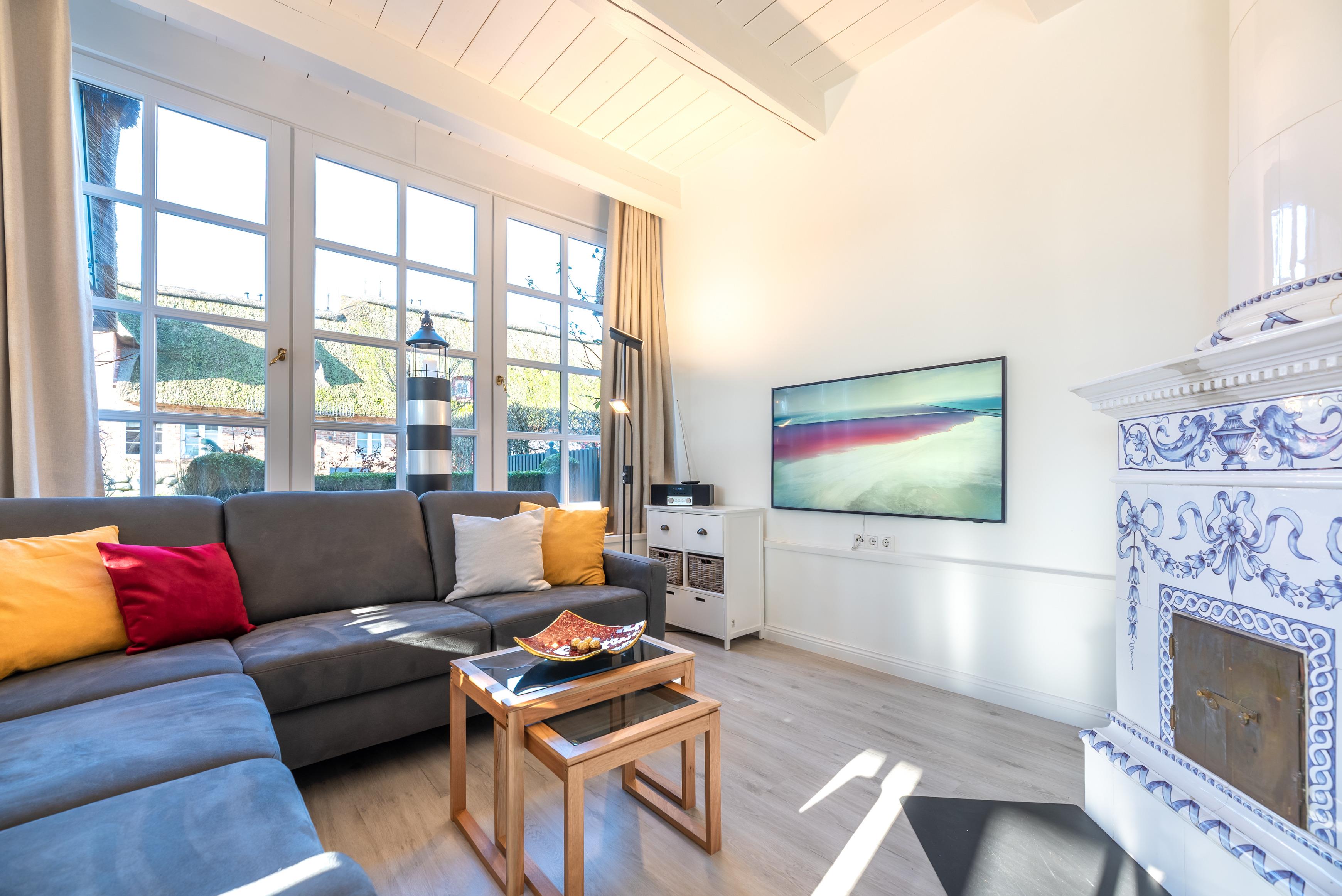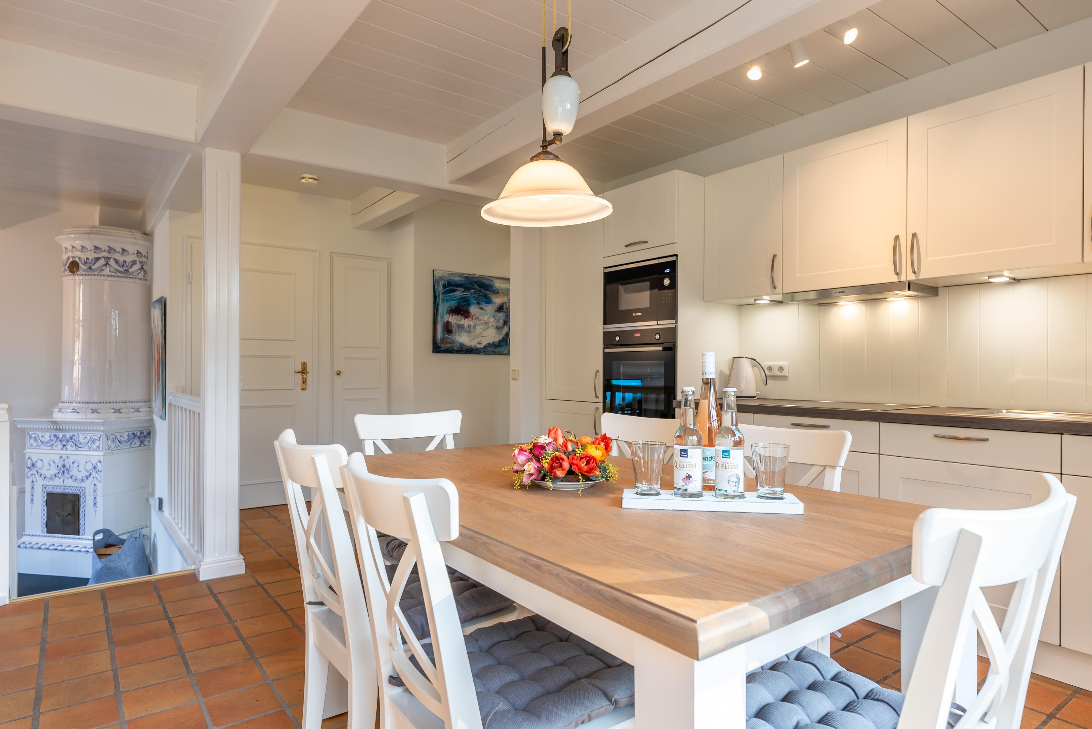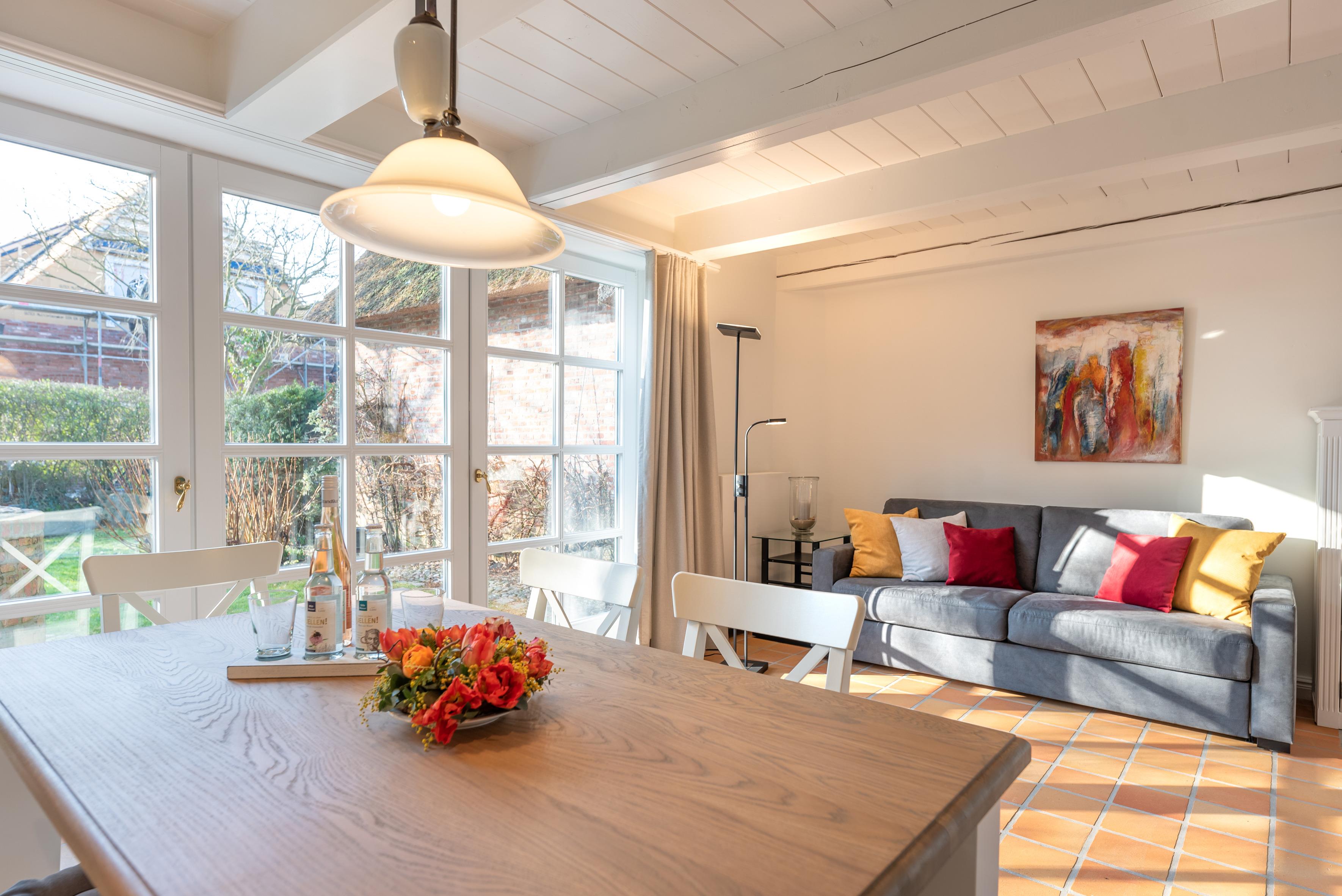 helles Wohn-Esszimmer mit integrierter Küche und Ausgang in den Garten und auf die eigene Südterrasse mit Gartenmöbeln und Strandkorb,alter Kachelofen im Wohnbereich - ideal für gemütliche Abende, Schlafzimmer mit Doppelbett und im Wohnbereich ein Schlafsofa bieten auch vier Personen ausreichend Platz für einen erholsamen Urlaub, Duschbad/WC, Abstellraum für die Garderobe, weiterer Abstellraum.