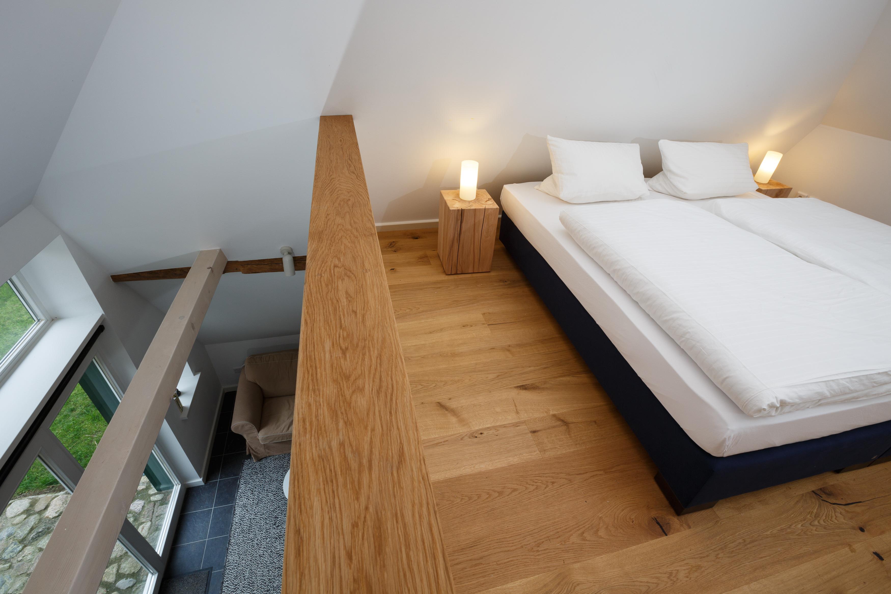 Es handelt sich um eine ca. 75 qm große Ferienwohnung über zwei Etagen mit zwei Schlafbereichen. Ein Schlafzimmer mit Doppelbett findet man im Erdgeschoss mit anschließenden Gäste-WC. Sie betreten die Wohnküche mit Esstisch und dem Wohnzimmer mit großer Fensterfront und Kaminofen für gemütliche Stunden. Über einen Treppenaufgang erreichen Sie die Schlafgalerie mit großem Doppelbett, welche auch getrennt als Einzelbetten genutzt werden können. Auch das Duschbad mit viel Ablagefläche und großer Spiegelfront ist hier zu finden.
