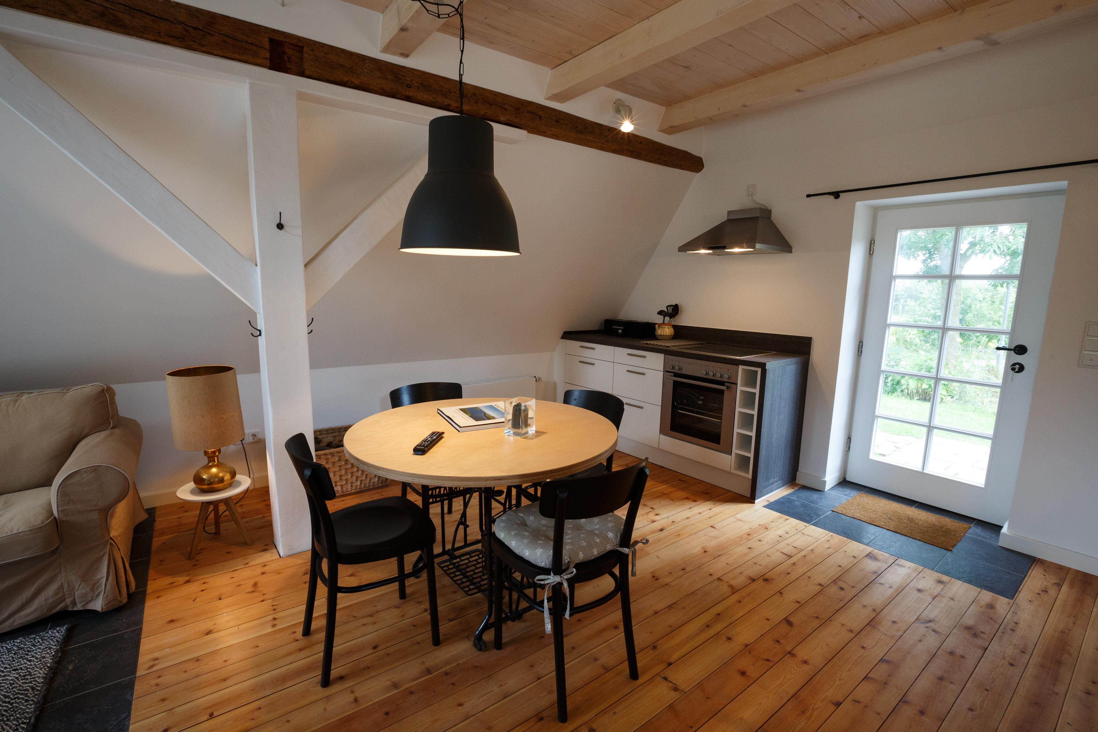 Ausstattung der Ferienwohnung: Geschirrspülmaschine, Backofen, Herd mit vier Herdplatten, Kaffeemaschine, Wasserkocher, Wäscheständer, Waschmaschine und Trockner im Gemeinschafts-Wirtschaftsraum, Parkplatz am Haus. Für unsere kleinsten Gäste stellen wir gern einen Kinderhochstuhl und ein Babyreisebett zur Verfügung.