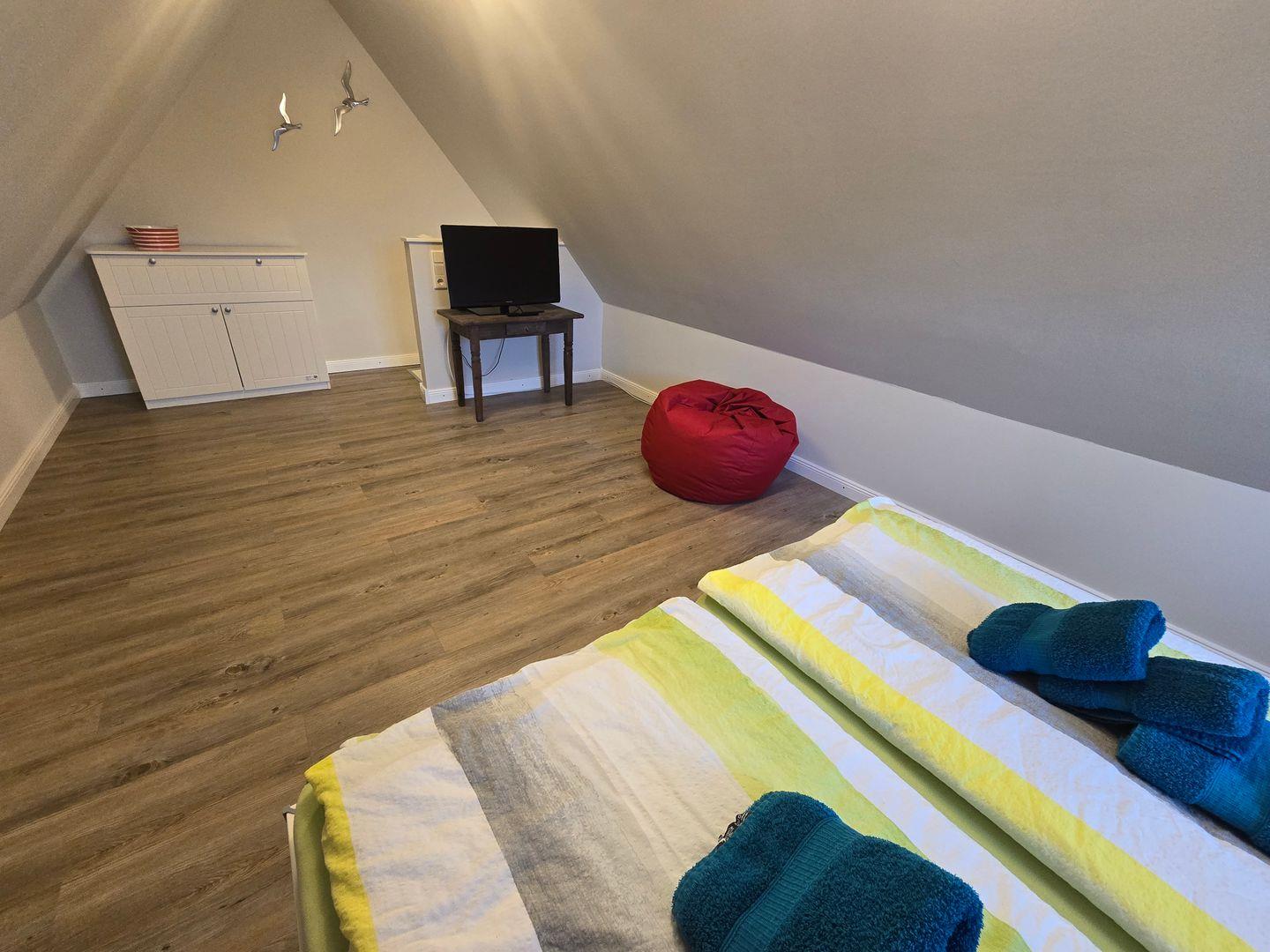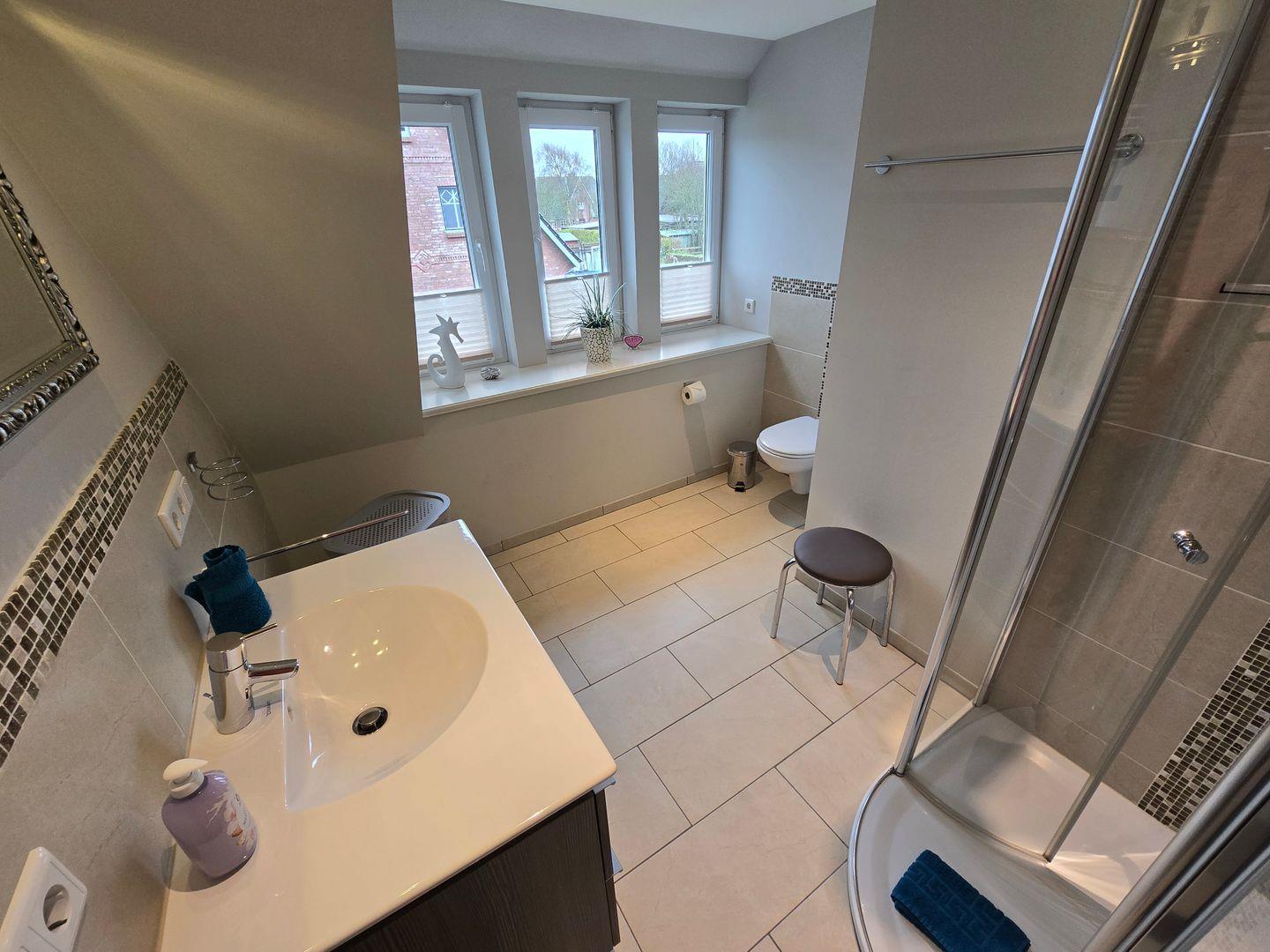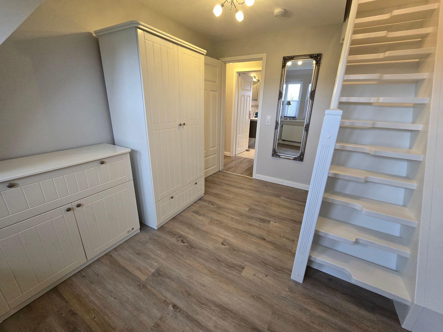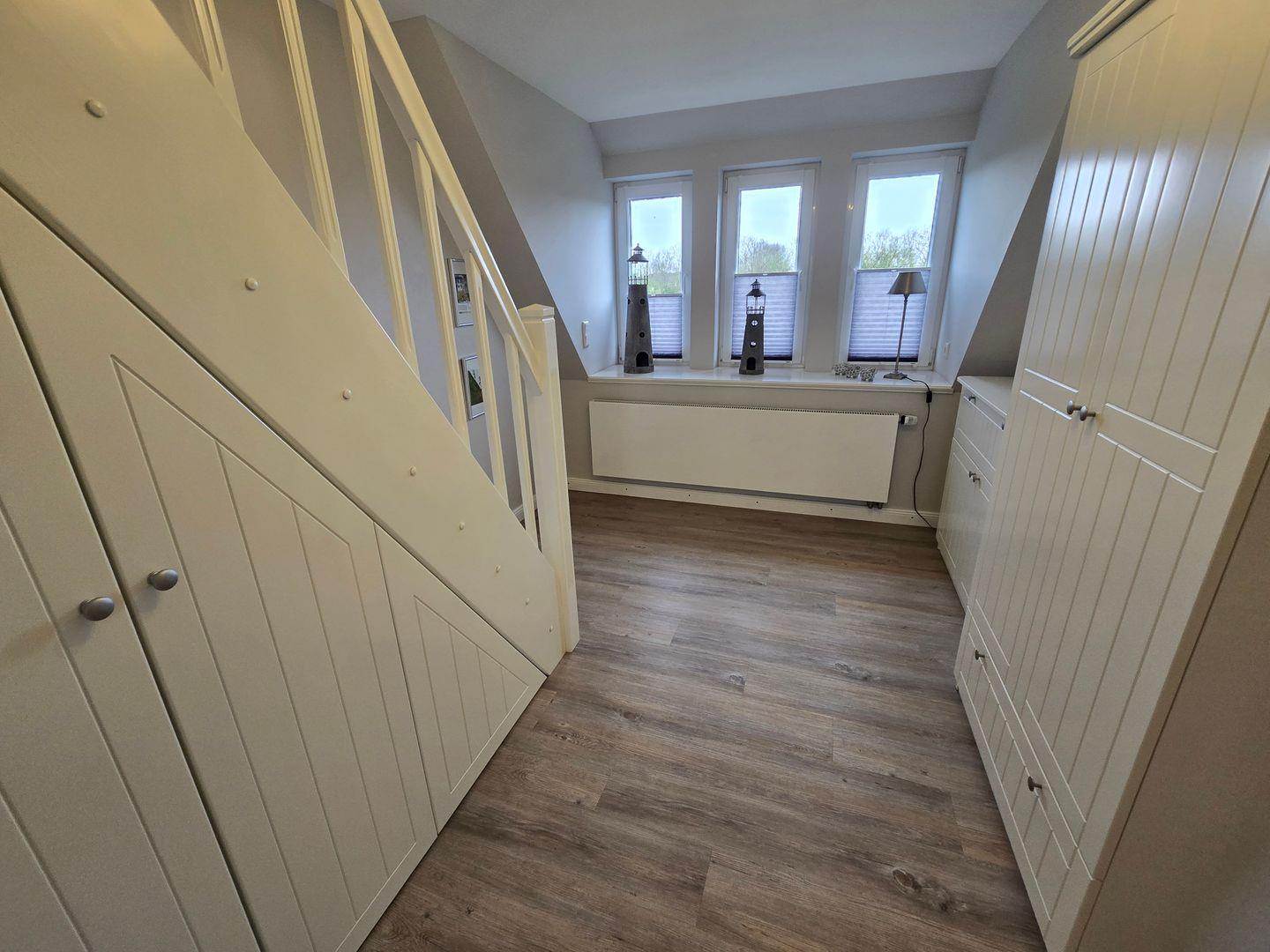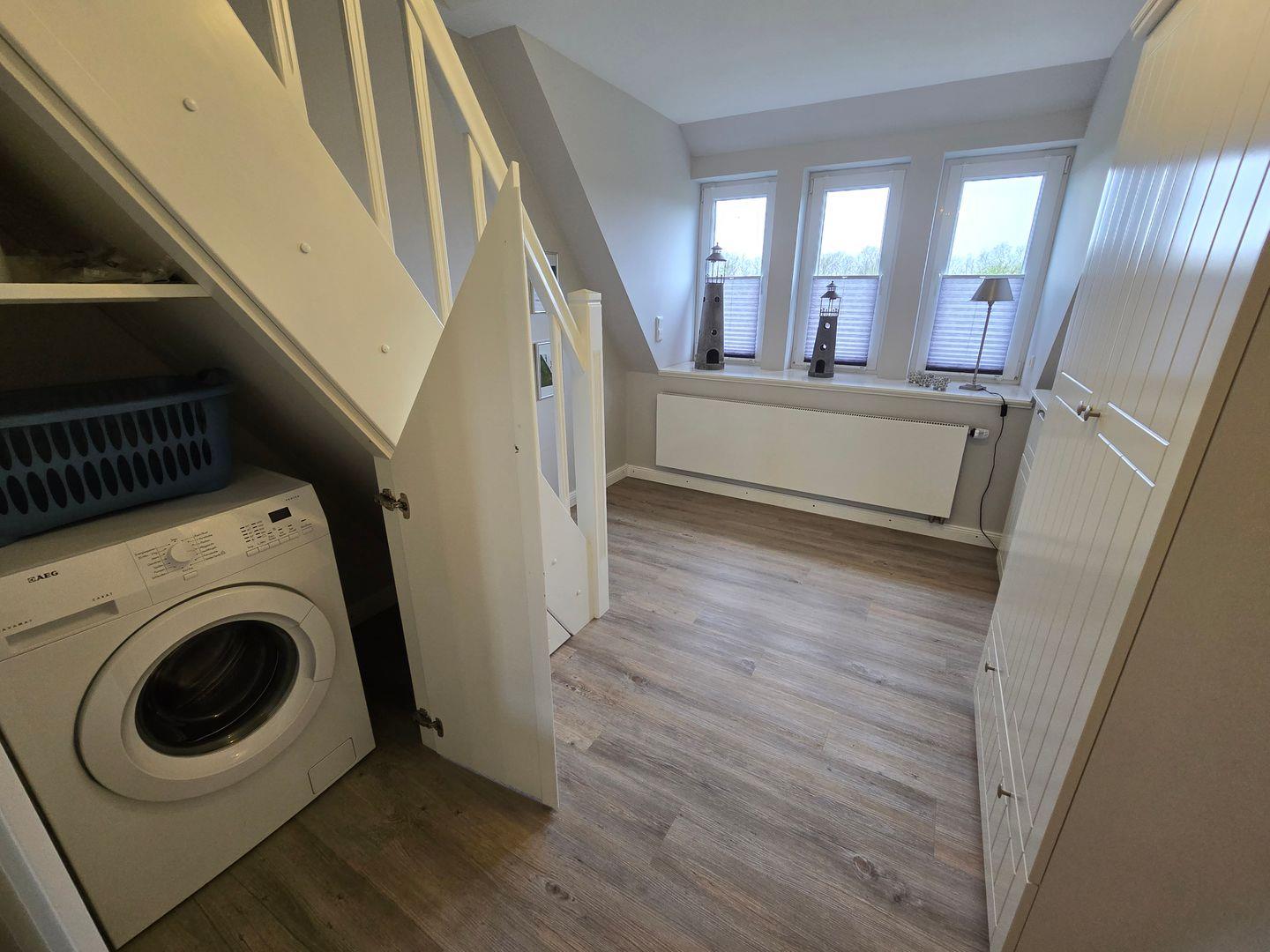 Im Erdgeschoss befinden sich: das Wohnzimmer mit angrenzendem Esszimmer, die sehr gut ausgestattete Küche, das Badezimmer mit einer bodengleichen Dusche, Föhn und Fenster, sowie der Flur mit Garderobe. Im 1.OG finden Sie ein Schlafzimmer mit einem Doppelbett (180 x 200 cm) und einem TV, ein zweites Schlafzimmer mit einem Einzelbett (90 x 200 cm), einem Einbauschrank und einem TV, das zweite Badezimmer mit einer bodengleichen Dusche, Föhn und Fenster und ein Ankleideraum mit einem Schrank, einer Kommode und einer Waschmaschine. Von diesem Zimmer aus führt eine Treppe zum Dachgeschoss in dem sich das dritte Schlafzimmer mit einem Doppelbett (140 x 200 cm), einer Kommode und einem TV befindet. WLAN, CD-Spieler, Radio, Bücher, DVD´s und Gesellschaftsspiele sorgen für die Unterhaltung. Ein PKW-Stellplatz gehört zum Haus. Ihre Fahrräder können direkt am Haus abgestellt werden.
