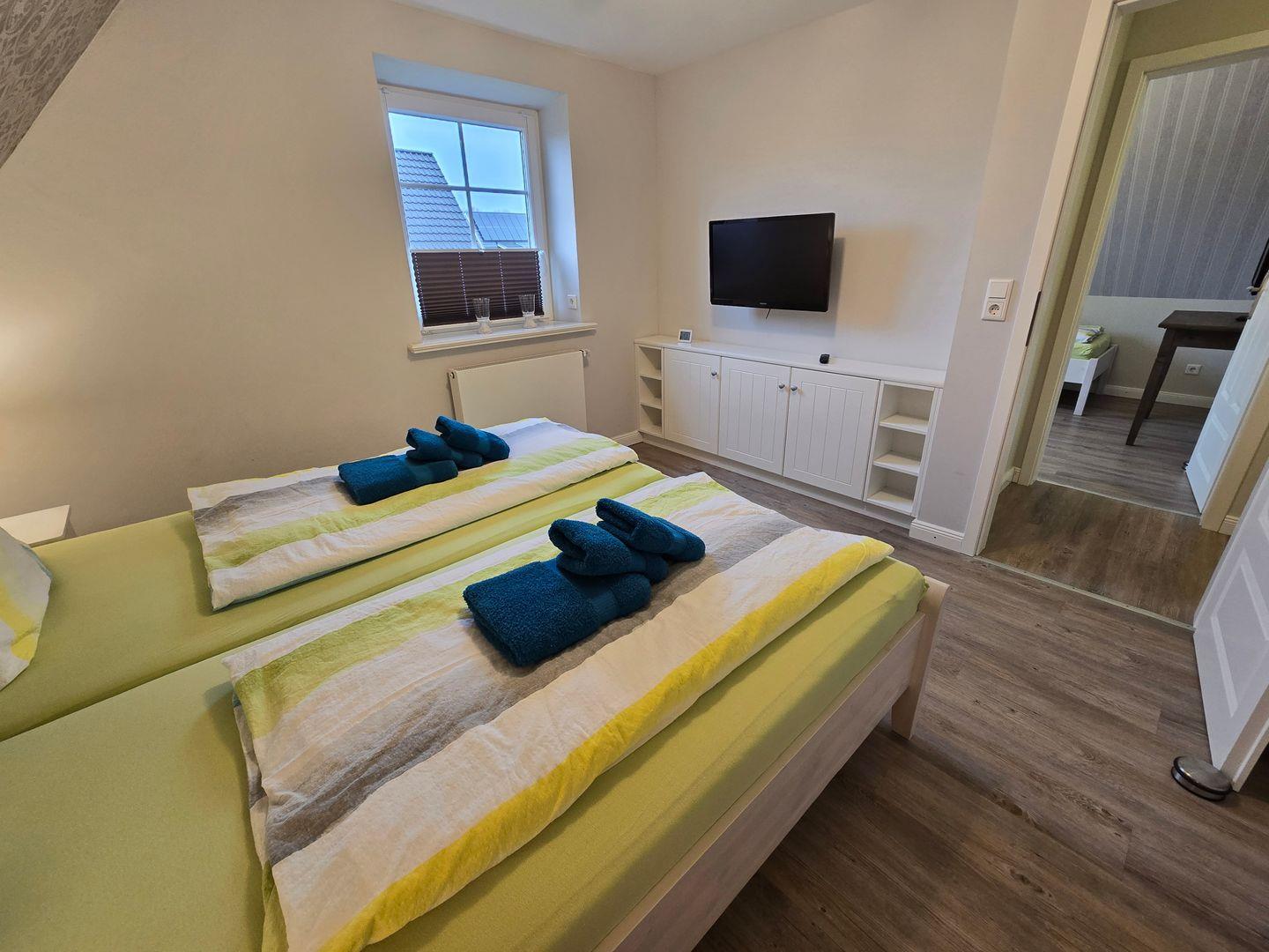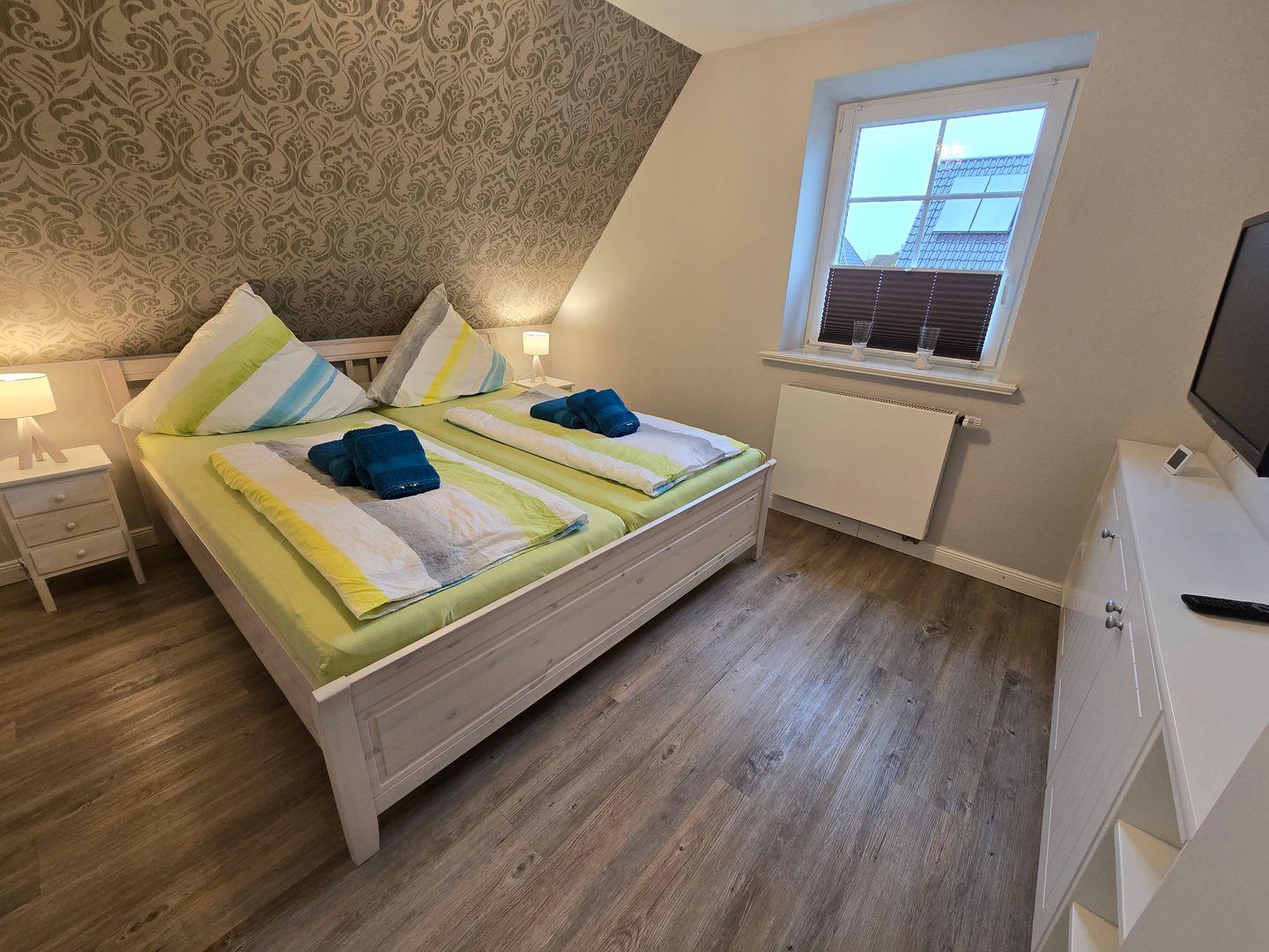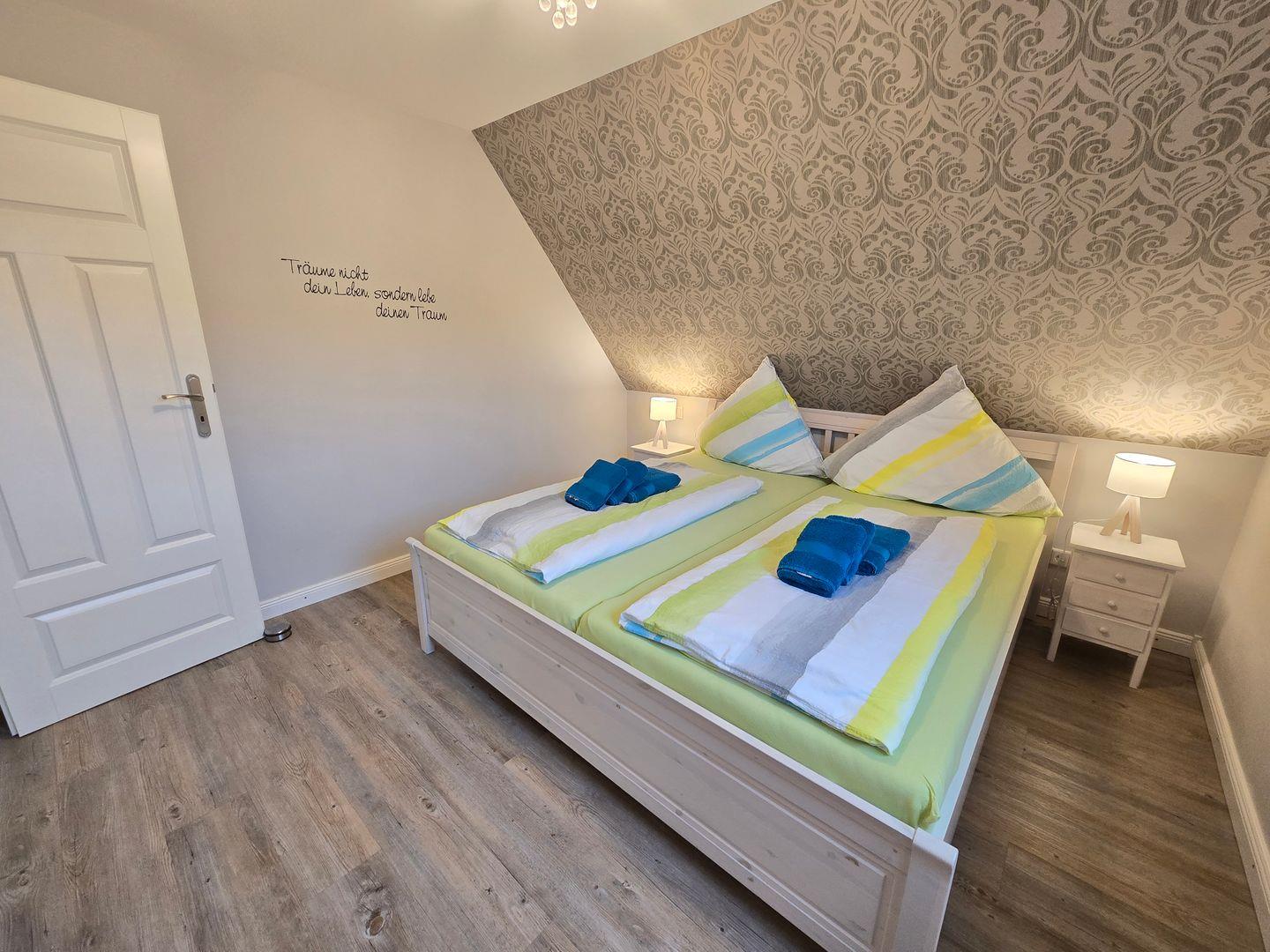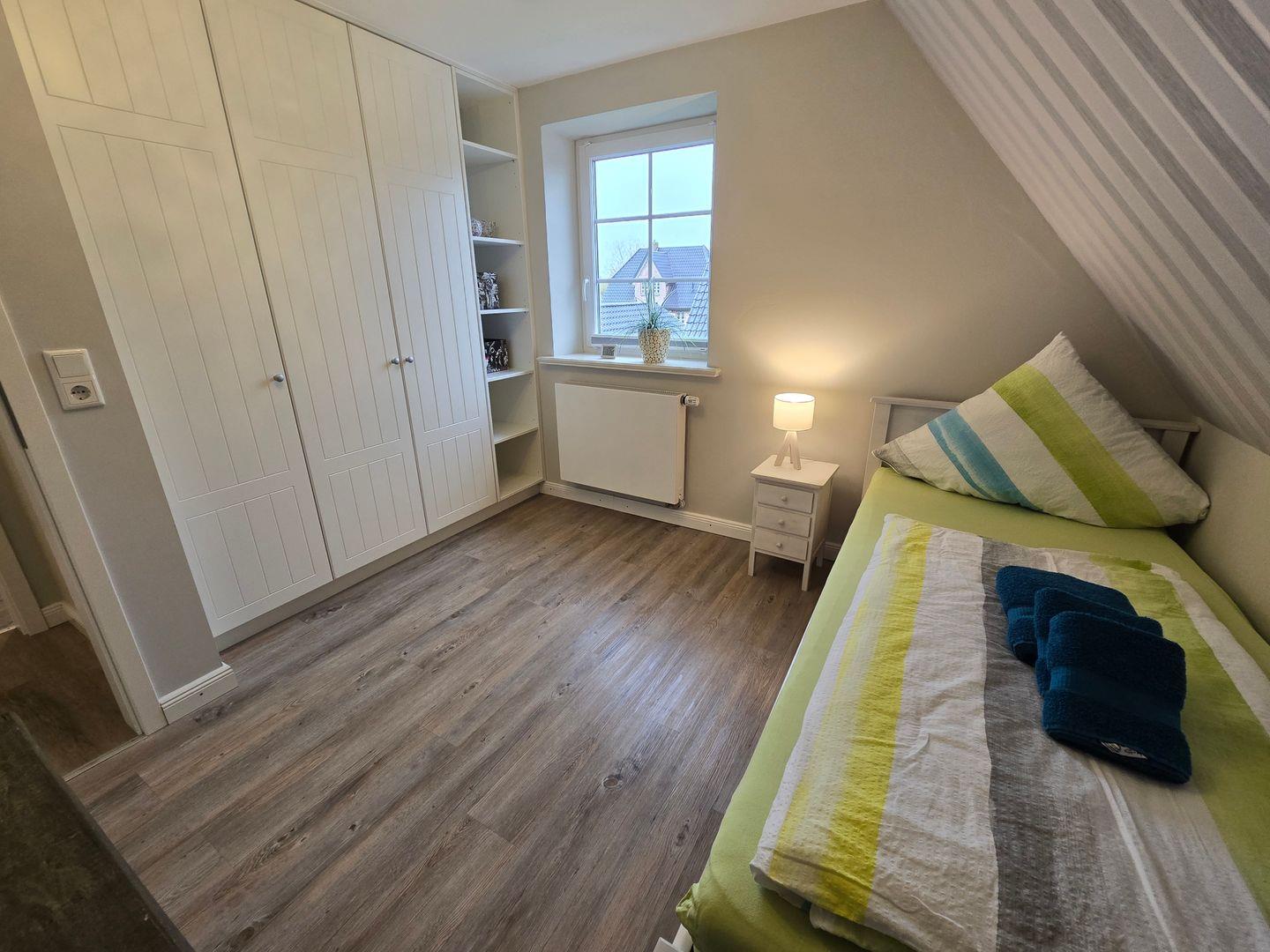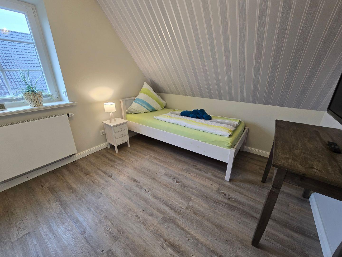 Im Erdgeschoss befinden sich: das Wohnzimmer mit angrenzendem Esszimmer, die sehr gut ausgestattete Küche, das Badezimmer mit einer bodengleichen Dusche, Föhn und Fenster, sowie der Flur mit Garderobe. Im 1.OG finden Sie ein Schlafzimmer mit einem Doppelbett (180 x 200 cm) und einem TV, ein zweites Schlafzimmer mit einem Einzelbett (90 x 200 cm), einem Einbauschrank und einem TV, das zweite Badezimmer mit einer bodengleichen Dusche, Föhn und Fenster und ein Ankleideraum mit einem Schrank, einer Kommode und einer Waschmaschine. Von diesem Zimmer aus führt eine Treppe zum Dachgeschoss in dem sich das dritte Schlafzimmer mit einem Doppelbett (140 x 200 cm), einer Kommode und einem TV befindet. WLAN, CD-Spieler, Radio, Bücher, DVD´s und Gesellschaftsspiele sorgen für die Unterhaltung. Ein PKW-Stellplatz gehört zum Haus. Ihre Fahrräder können direkt am Haus abgestellt werden.