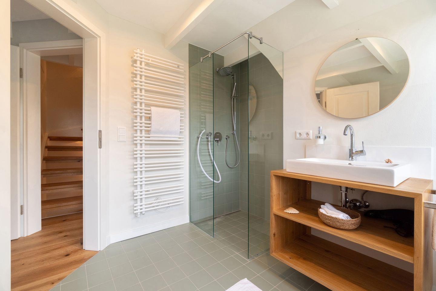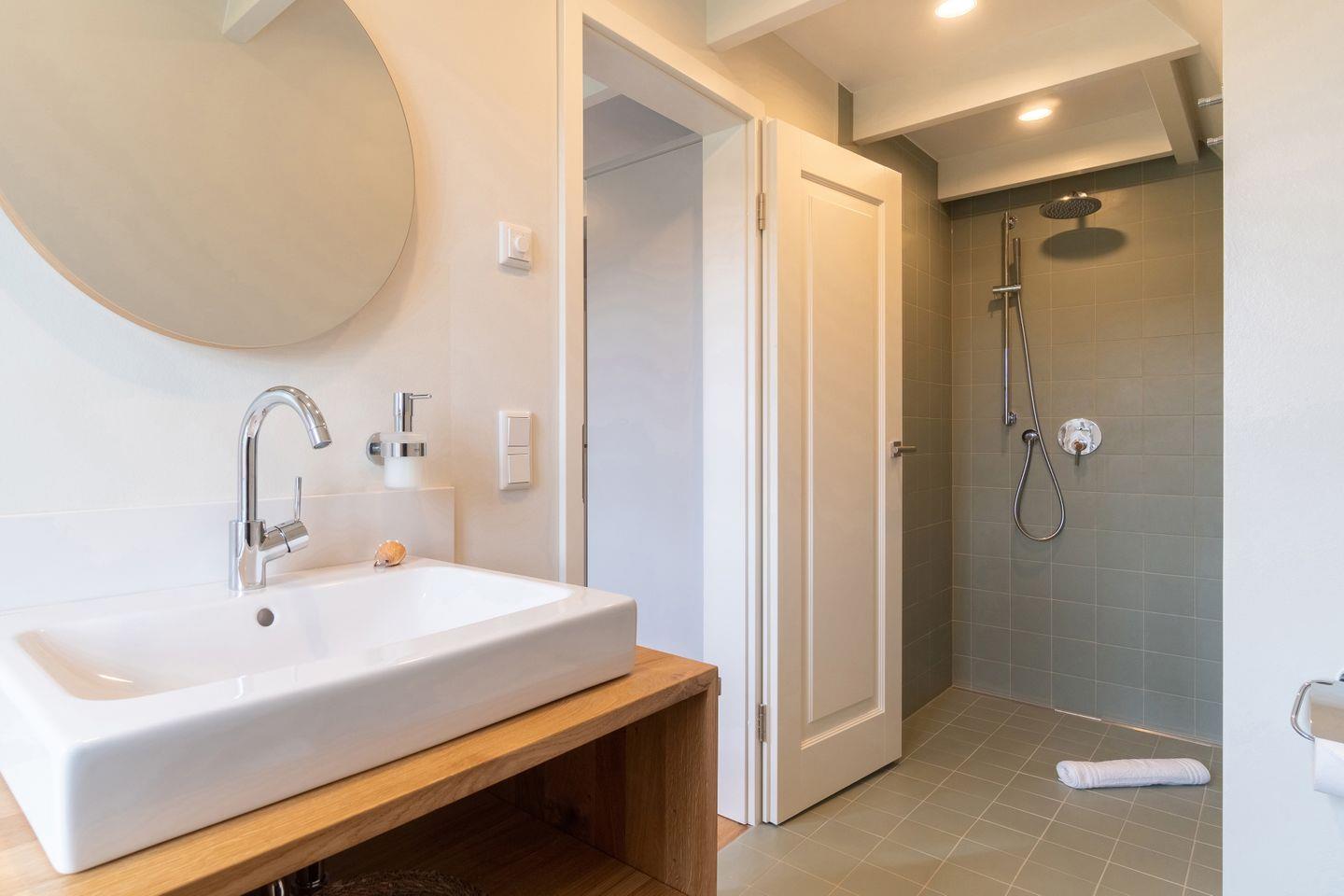 Die Doppelhaushälfte verfügt über zwei Schlafzimmersuiten mit eigenen Bädern, die mit Raindanceduschen ausgestattet sind. Ein Kneippschlauch erfreut die Saunagänger. Vier Personen finden in den Schlafzimmern bequem Platz. Für unsere kleinen Gäste stehen Bettchen und ein Hochstuhl zur Verfügung.