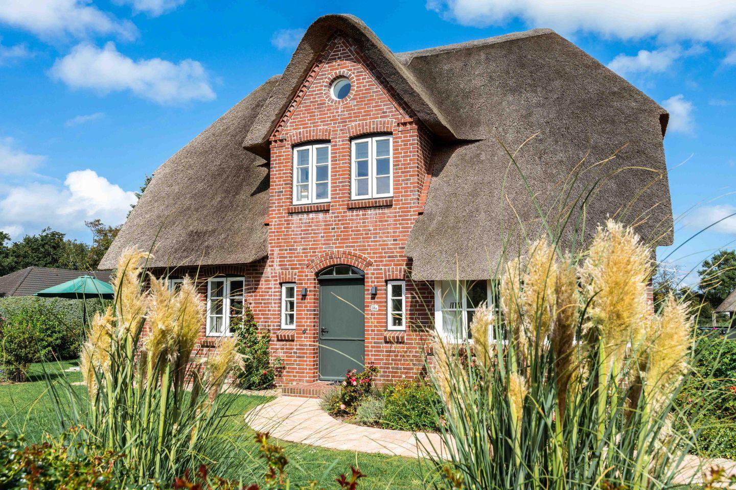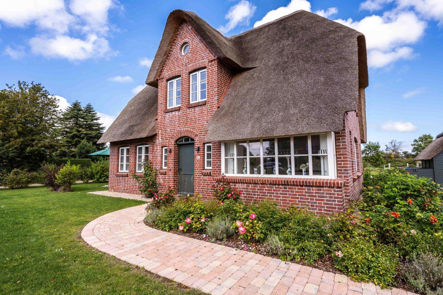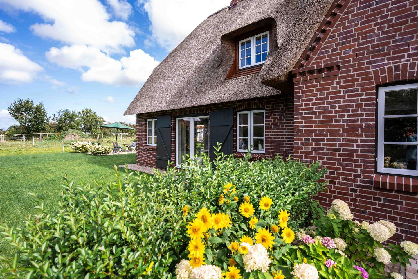 Auf einer ehemaligen Pferdekoppel entstand dieses großzügige Reetdachhaus, umringt von Friesenhäusern am Dorfrand von Borgsum. Das Haus wurde nach altem friesischen Vorbild mit einer Architektin der Insel so geplant, dass Spaziergänger sich oft fragen, ob es sich tatsächlich um einen Neubau handelt. Der Naturstrand des Nachbarortes Witsum ist bequem erreichbar.