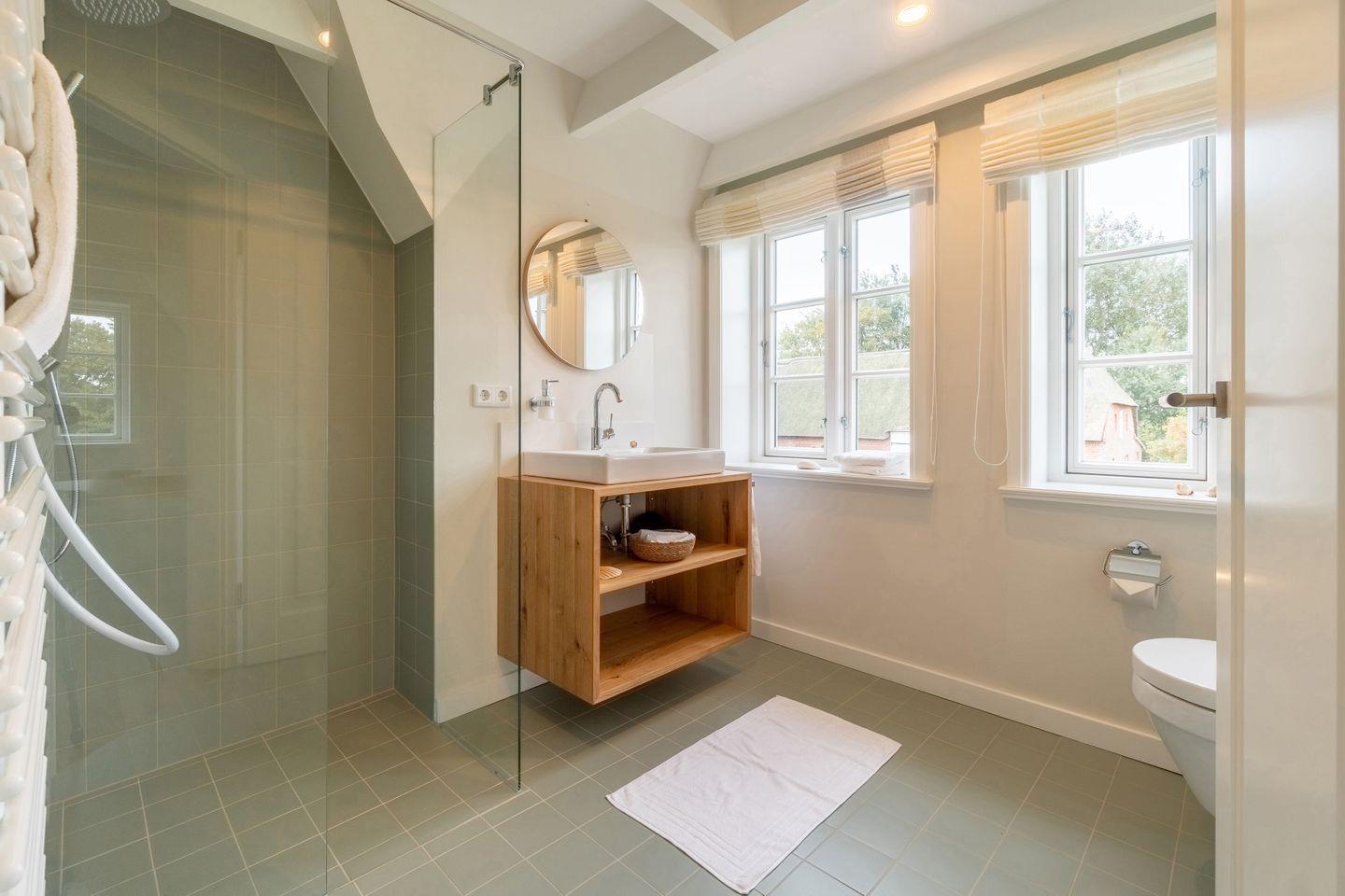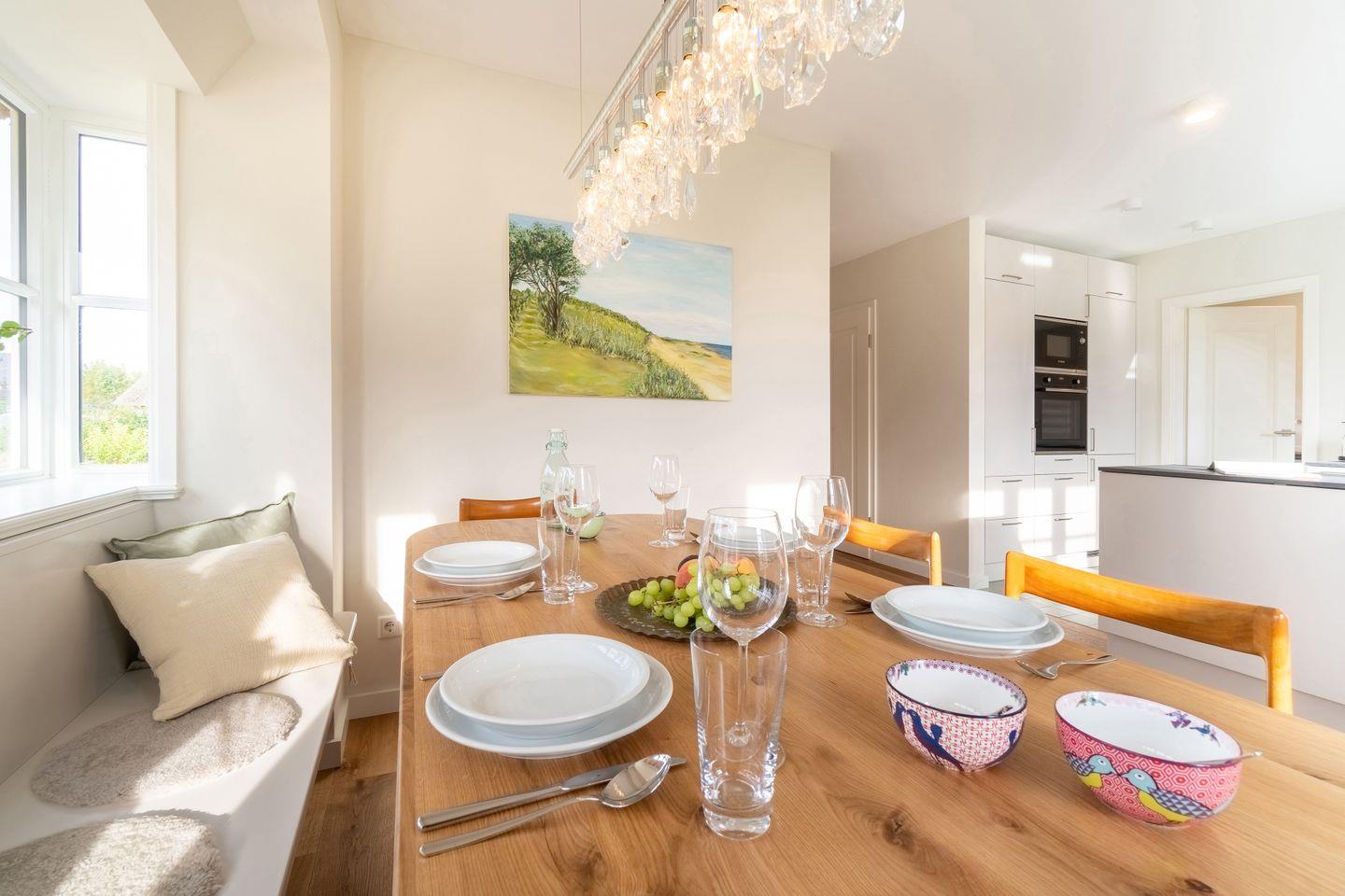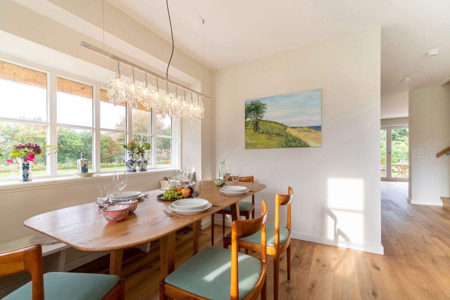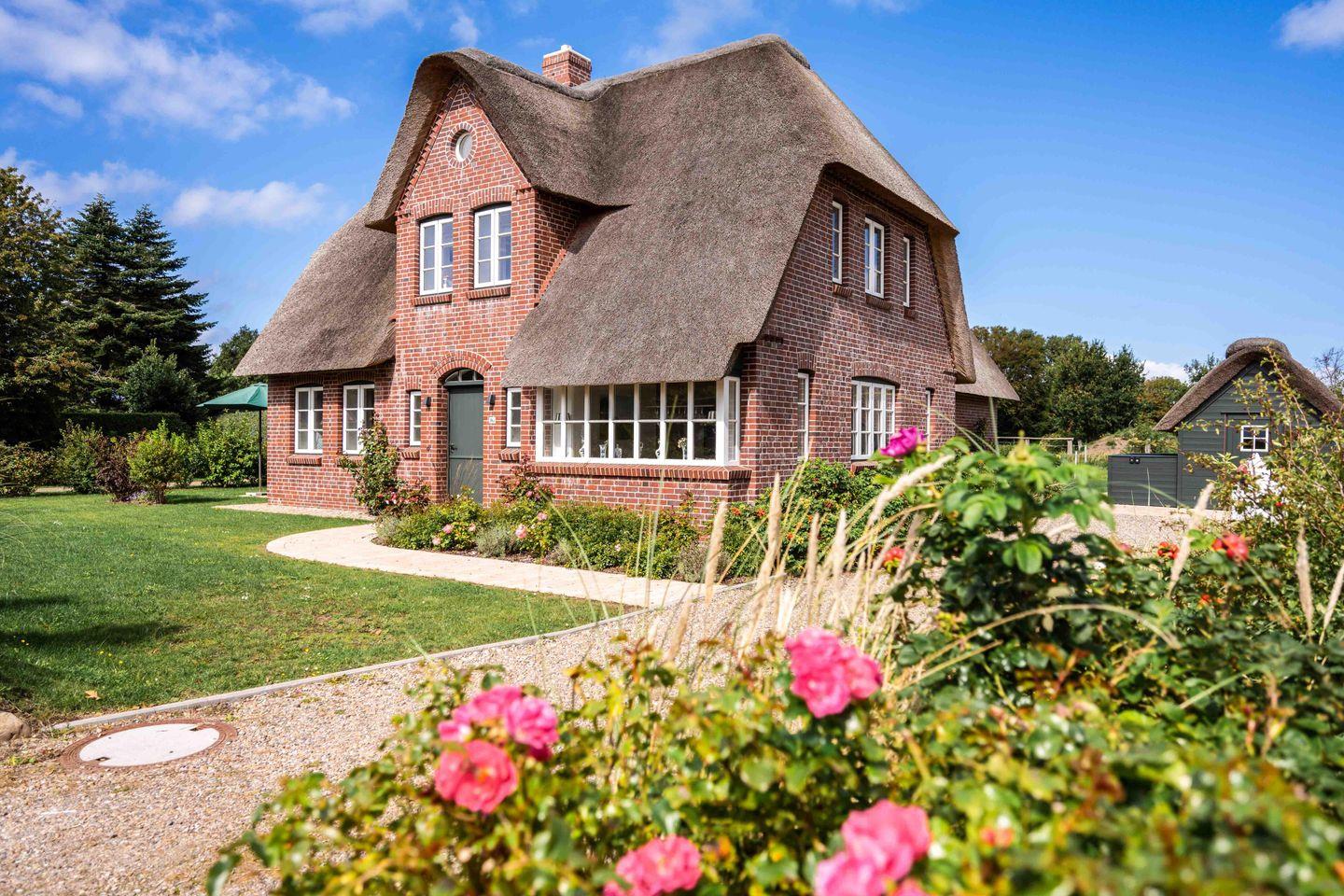 Auf einer ehemaligen Pferdekoppel entstand dieses großzügige Reetdachhaus, umringt von Friesenhäusern am Dorfrand von Borgsum. Das Haus wurde nach altem friesischen Vorbild mit einer Architektin der Insel so geplant, dass Spaziergänger sich oft fragen, ob es sich tatsächlich um einen Neubau handelt. Der Naturstrand des Nachbarortes Witsum ist bequem erreichbar.