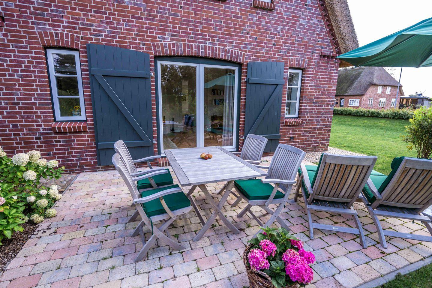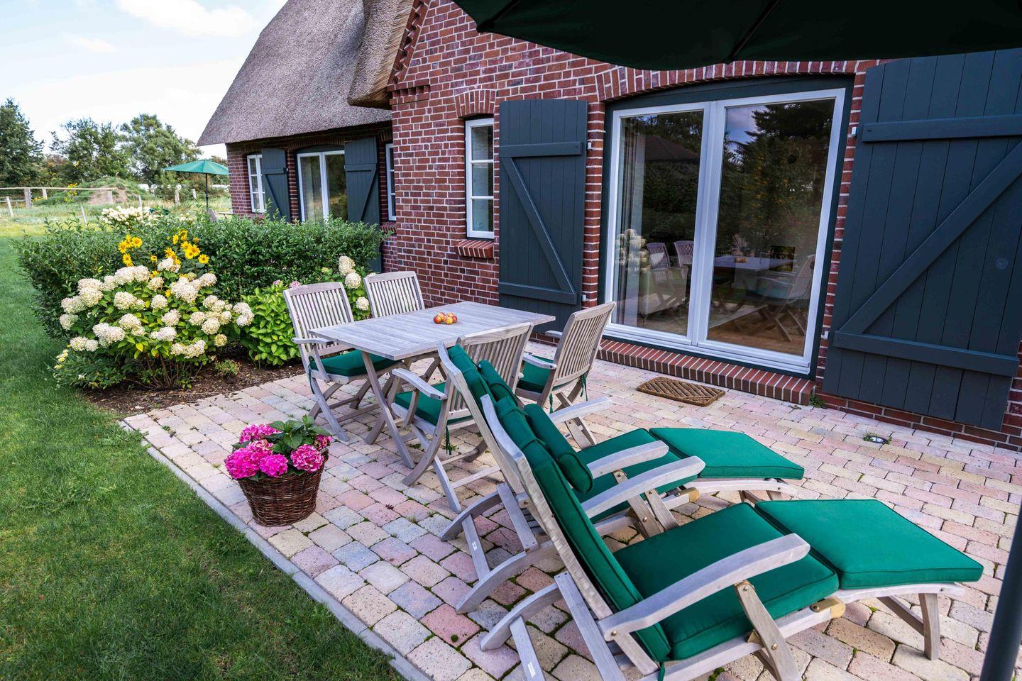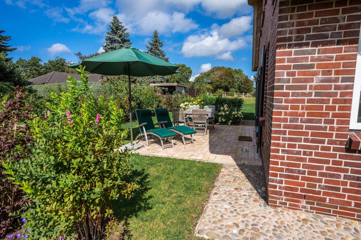 Das reetgedeckte malerische Gartenhäuschen verfügt über Strom für Ihre E-Bikes. Deckchairs und bequeme Teakmöbel lassen Sie Sonnenstunden auf der Terrasse genießen. Eine Ladesäule für Elektrofahrzeuge ist ebenfalls vorhanden.