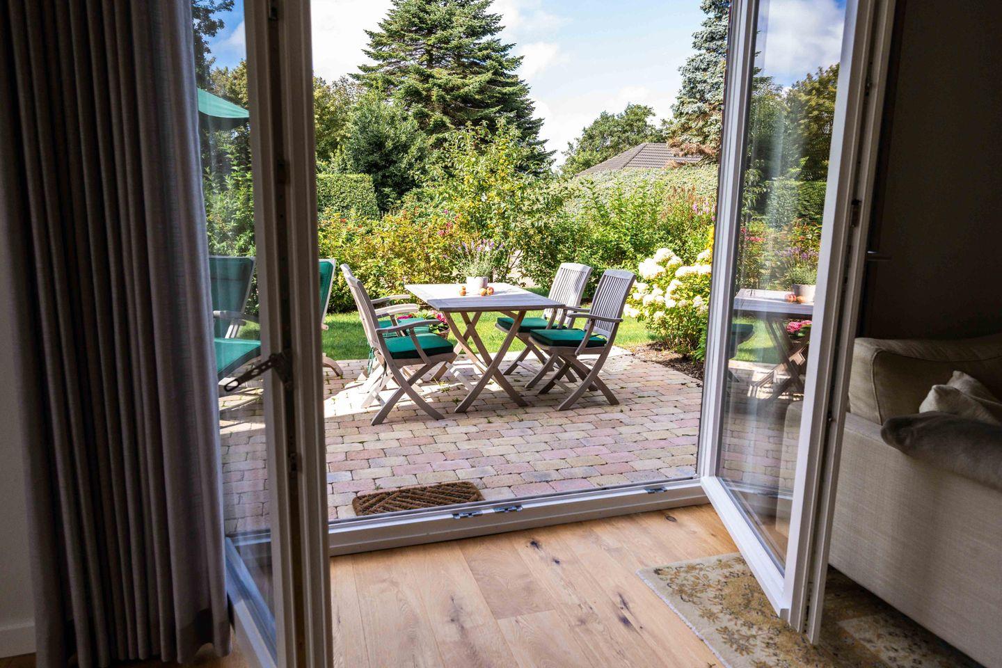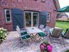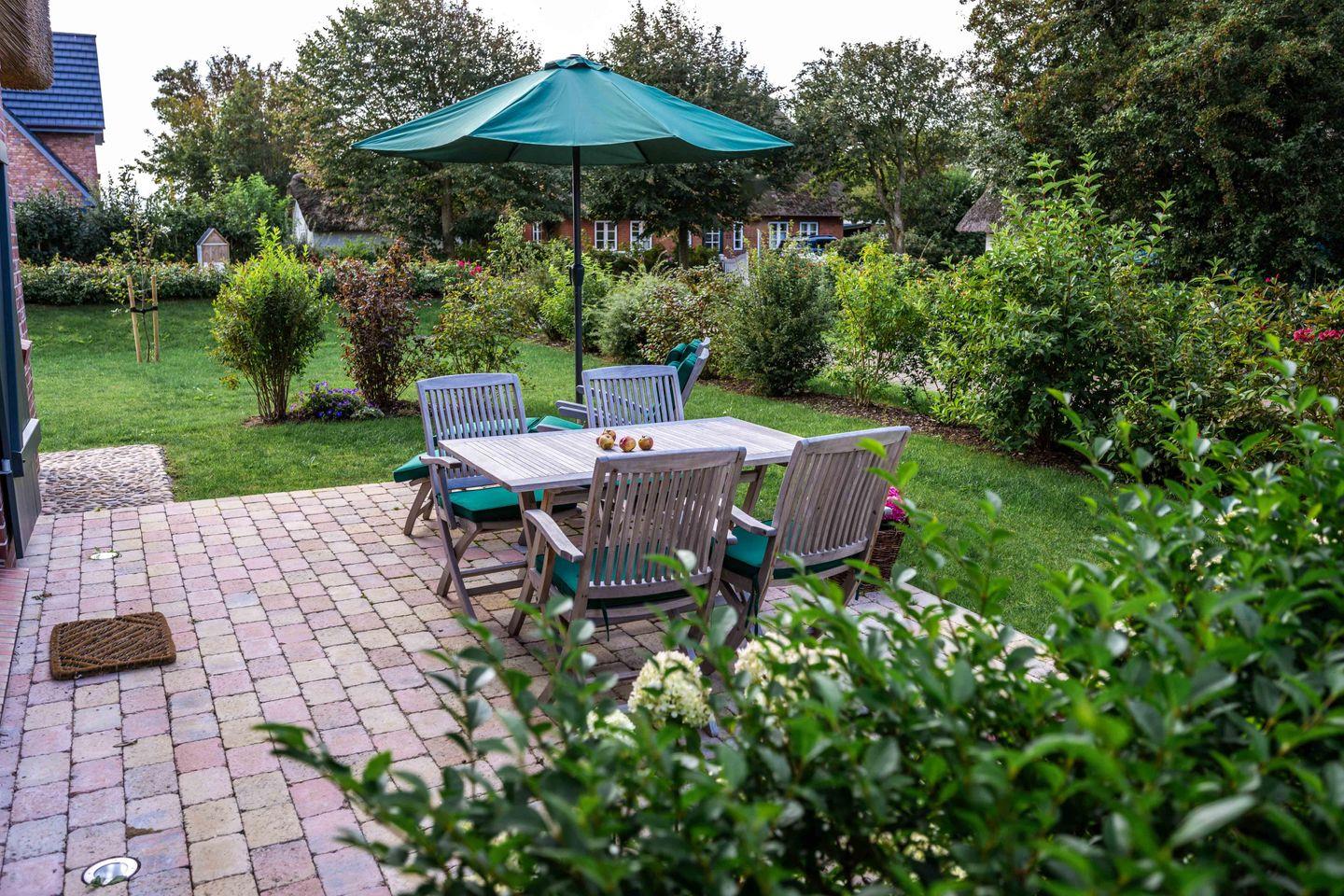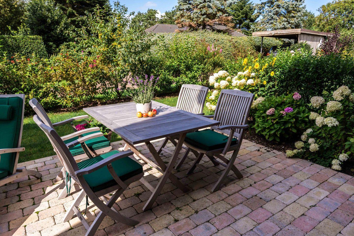 Das reetgedeckte malerische Gartenhäuschen verfügt über Strom für Ihre E-Bikes. Deckchairs und bequeme Teakmöbel lassen Sie Sonnenstunden auf der Terrasse genießen. Eine Ladesäule für Elektrofahrzeuge ist ebenfalls vorhanden.