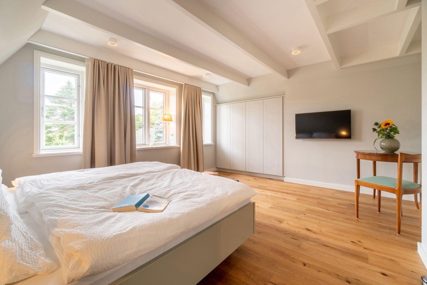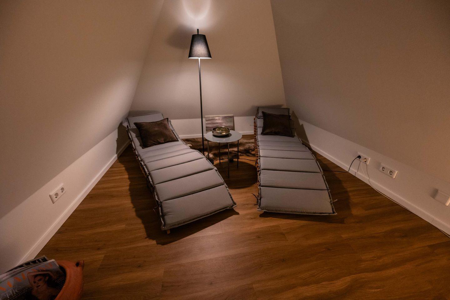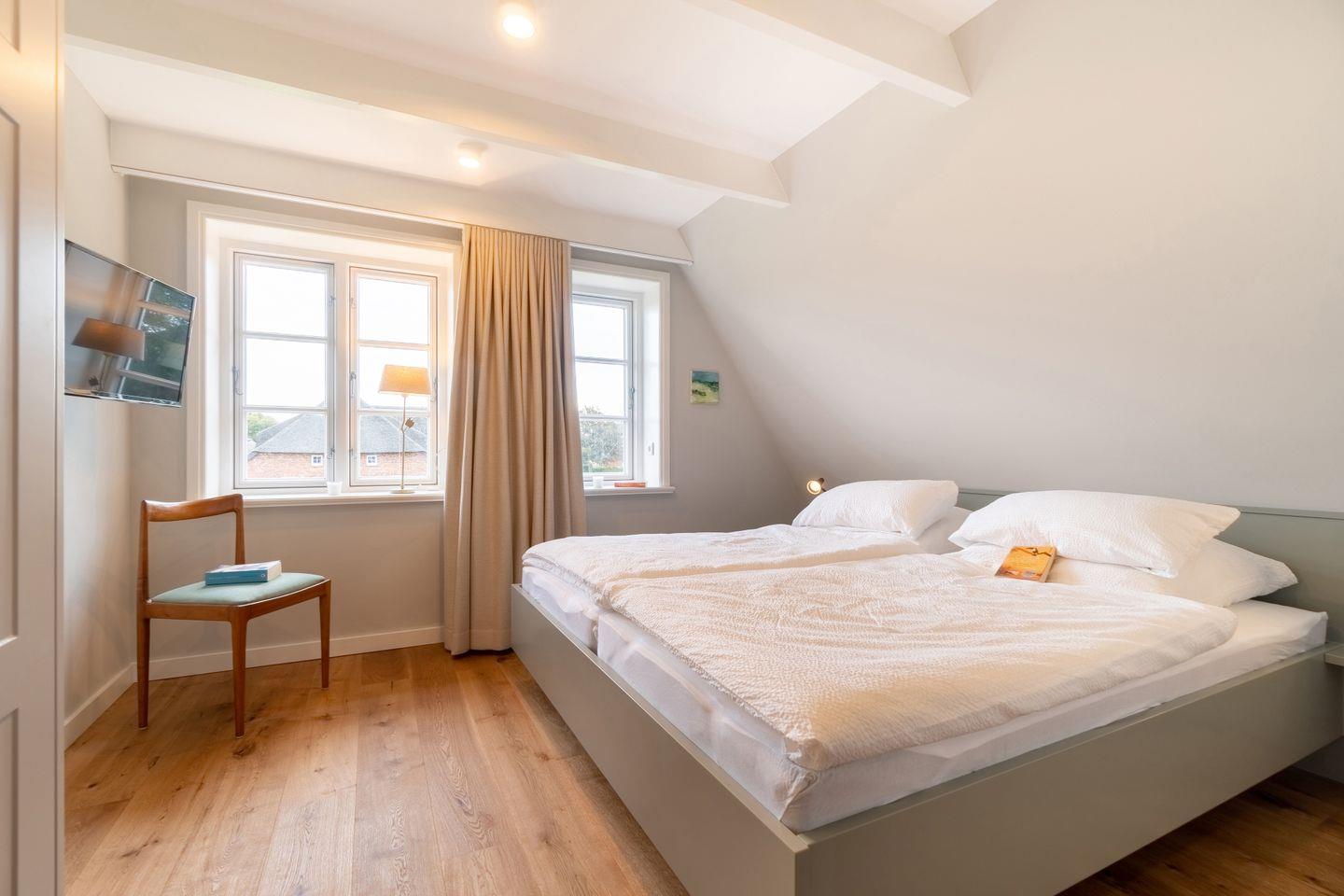 Im darüberliegendem Stockwerk sind die beiden Schlafzimmer en Suite mit je einem Doppelbett und LED-Flachbildschirmen angeordnet. Ein Schlafzimmer verfügt über einen kleinen Schreibtisch. Im Dachgeschoss befindet sich eine individuell angepasste Sauna, ein Ruheraum und eine kleine Leseecke für Kinder. Von hier aus kann man abends die Lichter von Amrum glitzern sehen.