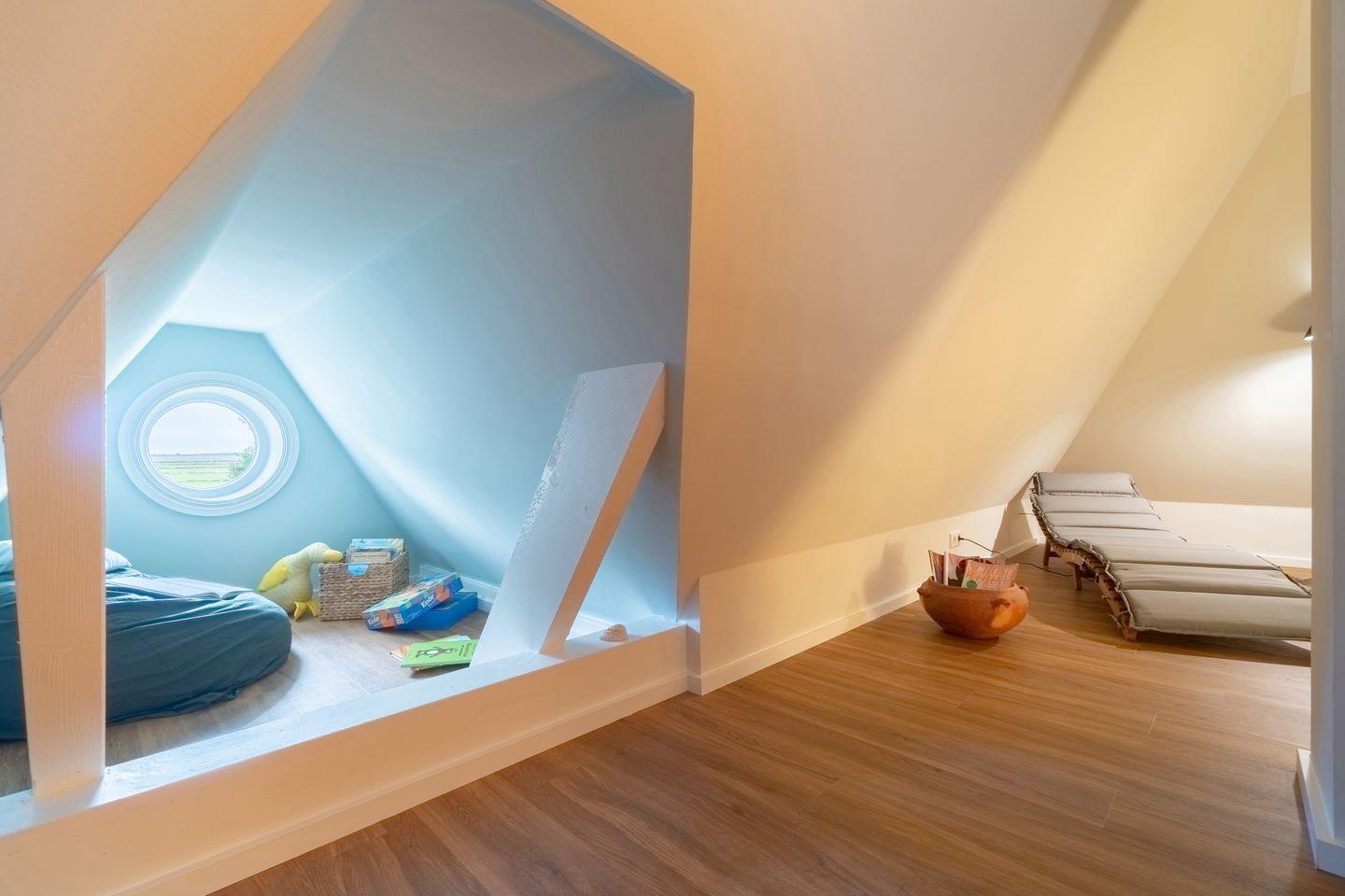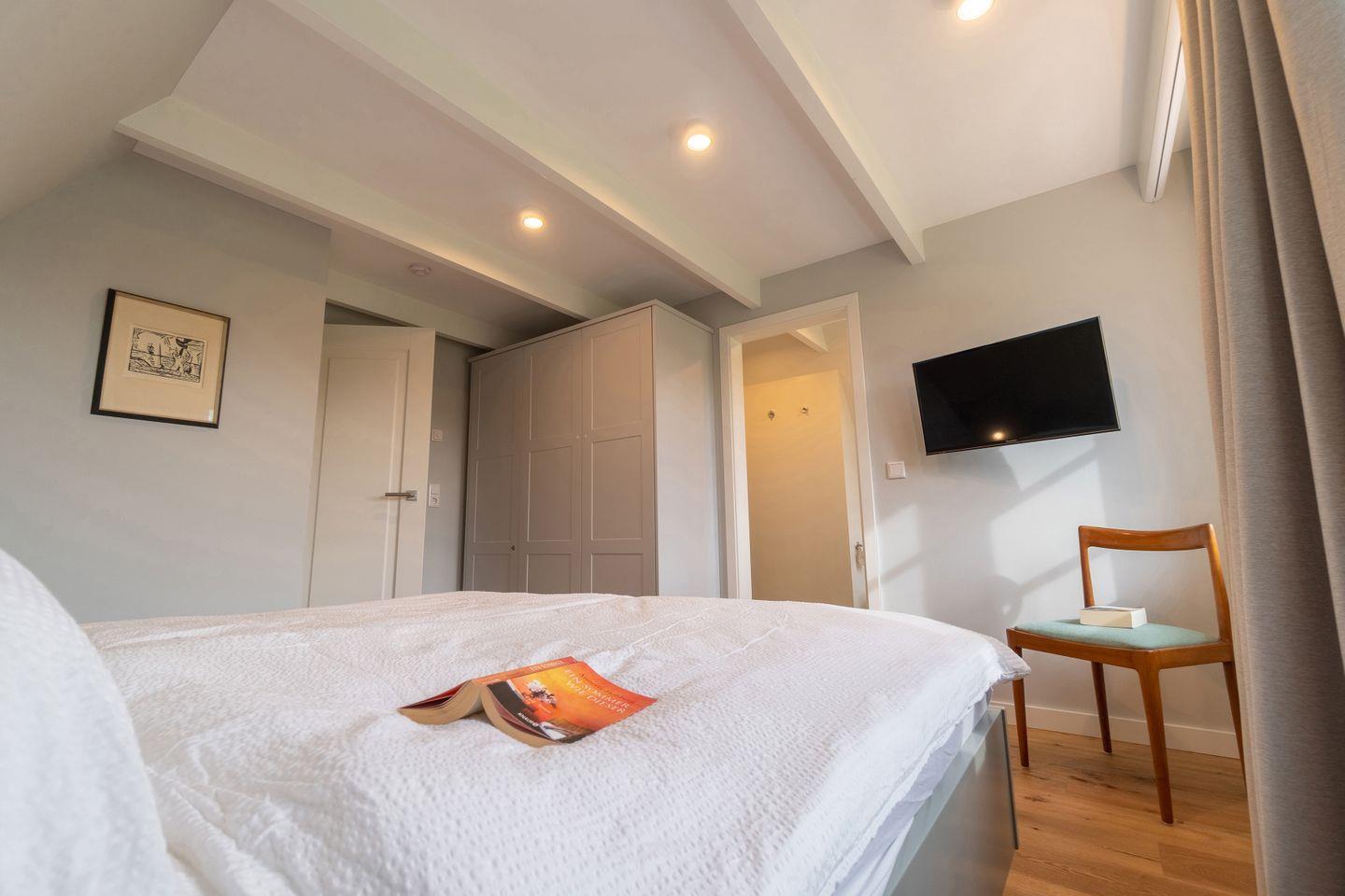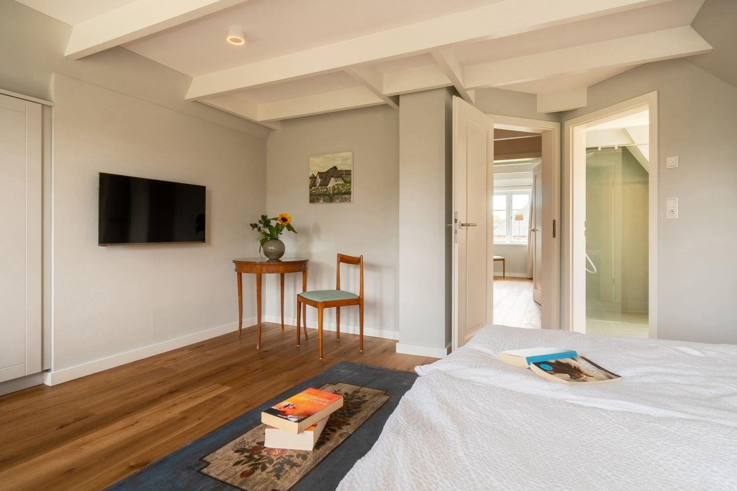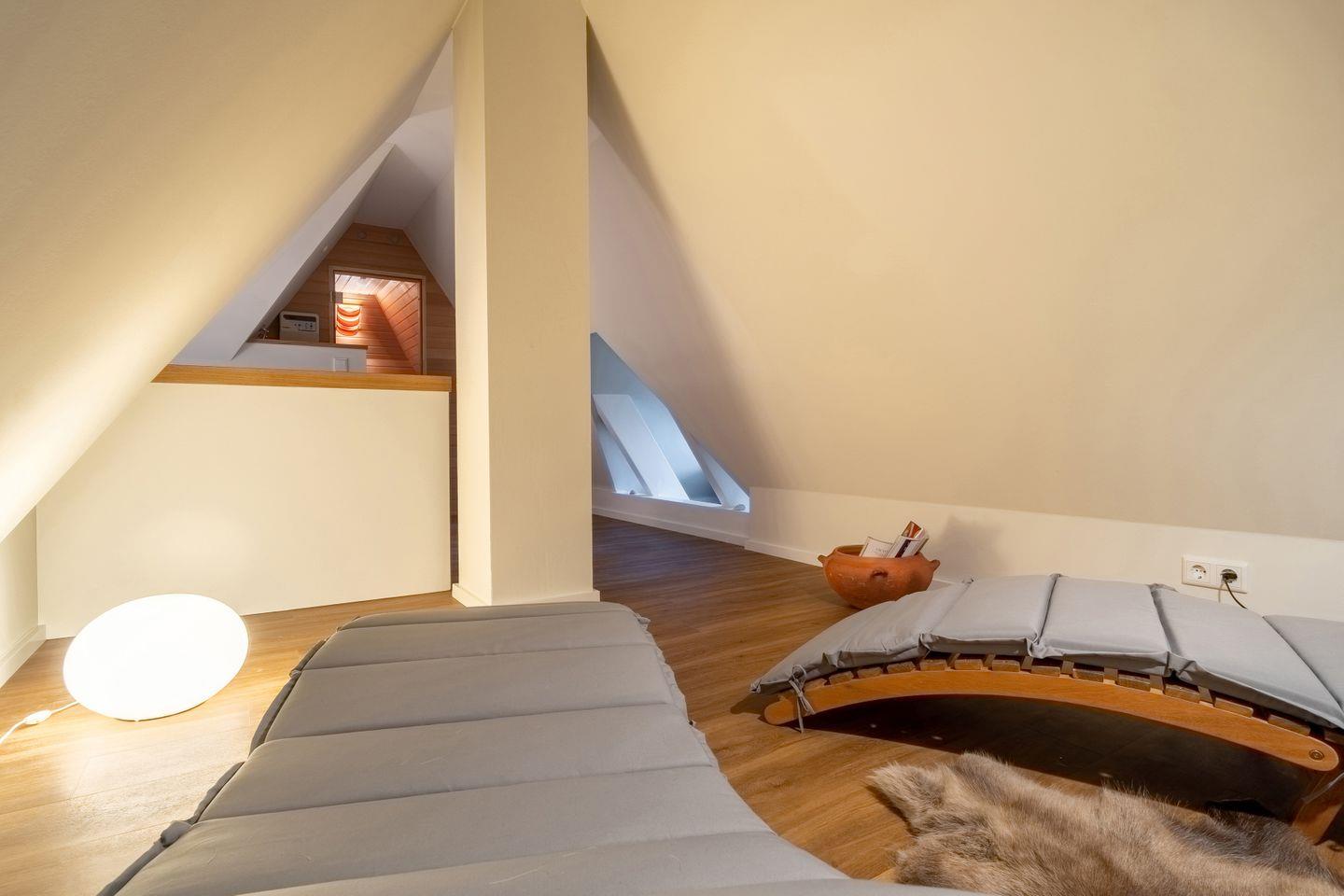 Im darüberliegendem Stockwerk sind die beiden Schlafzimmer en Suite mit je einem Doppelbett und LED-Flachbildschirmen angeordnet. Ein Schlafzimmer verfügt über einen kleinen Schreibtisch. Im Dachgeschoss befindet sich eine individuell angepasste Sauna, ein Ruheraum und eine kleine Leseecke für Kinder. Von hier aus kann man abends die Lichter von Amrum glitzern sehen.