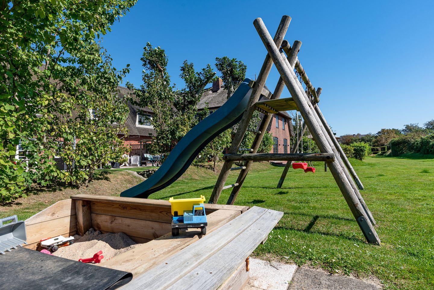 Die Ferienunterkunft ist von einem sehr großzügigen Grundstück umgeben, das Ihnen viel Platz im Freien bietet. An Rutsche, Schaukel und Sandkiste können sich Ihre Kleinen austoben.