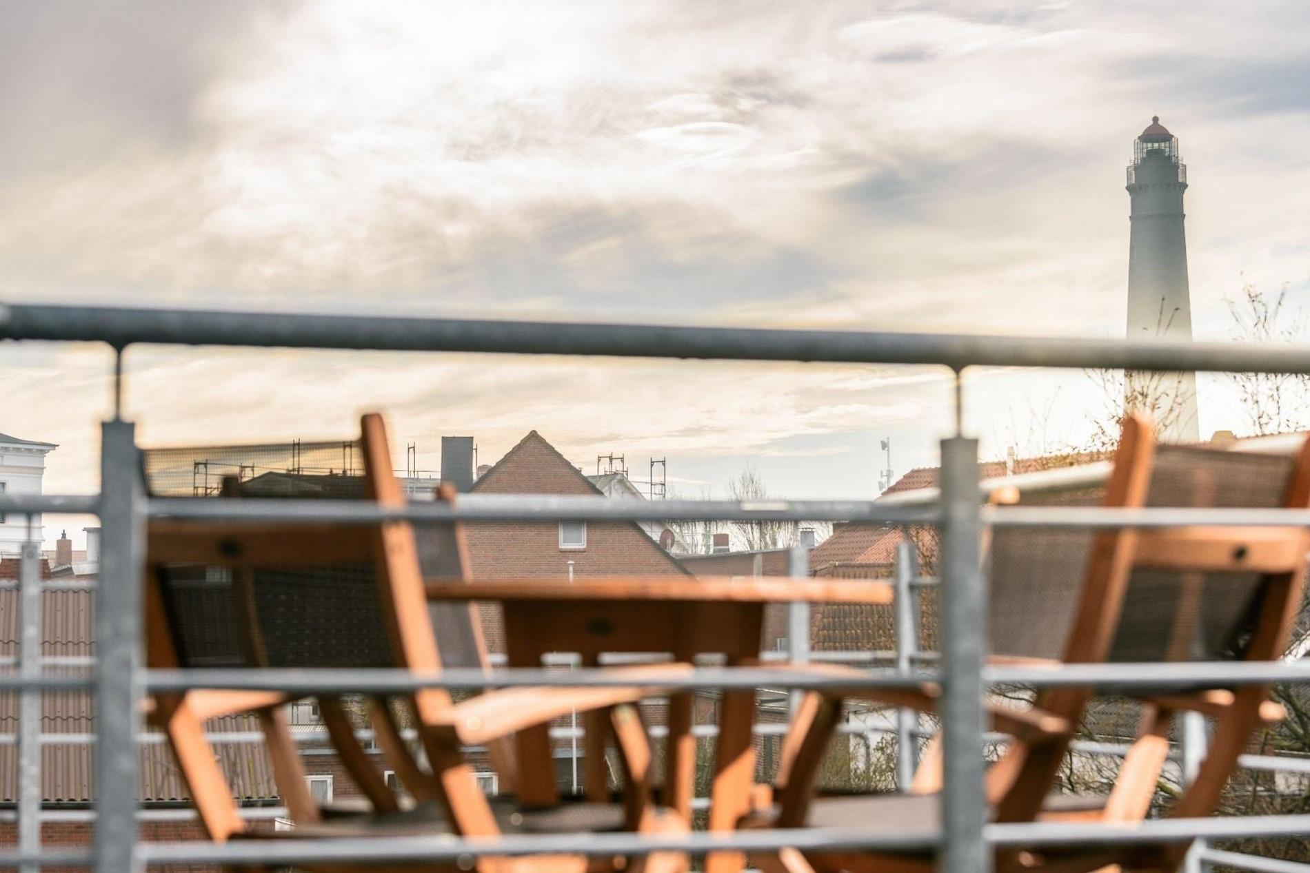 Der Balkon sorgt für entspannte Abende nach einem langen Strandtag und haben den Borkumer Leuchttürme im Blick.