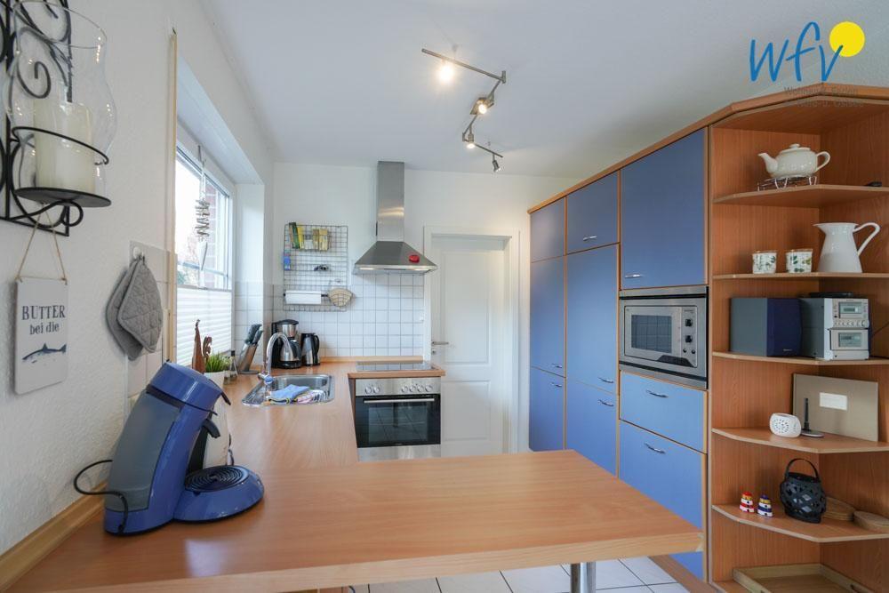 Für eine bequeme Selbstverpflegung ist die Küche im Erdgeschoss des Borkumer Ferienhauses u.a. mit einem Ceranherd, Backofen, Mikrowelle und Geschirrspüler sowie Kaffeemaschine, Wasserkocher und Toaster ausgestattet. An die offene Küche grenzt ein Essbereich an.
