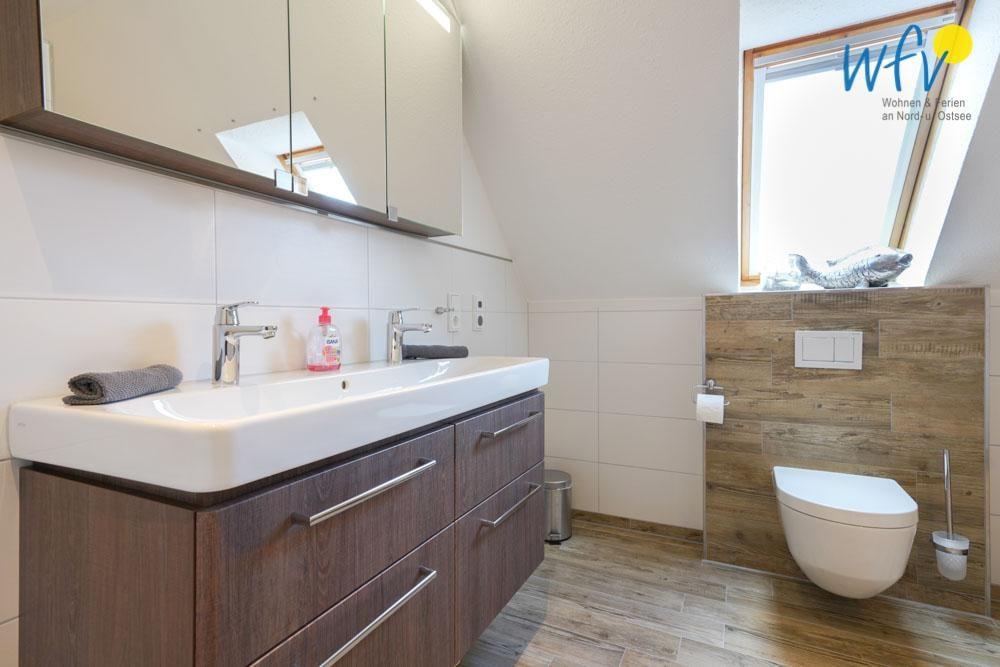 Ein Bad mit Dusche und WC sowie ein Abstellraum mit Waschmaschine und Trockner befinden sich ebenfalls im Erdgeschoss des Ferienhauses.